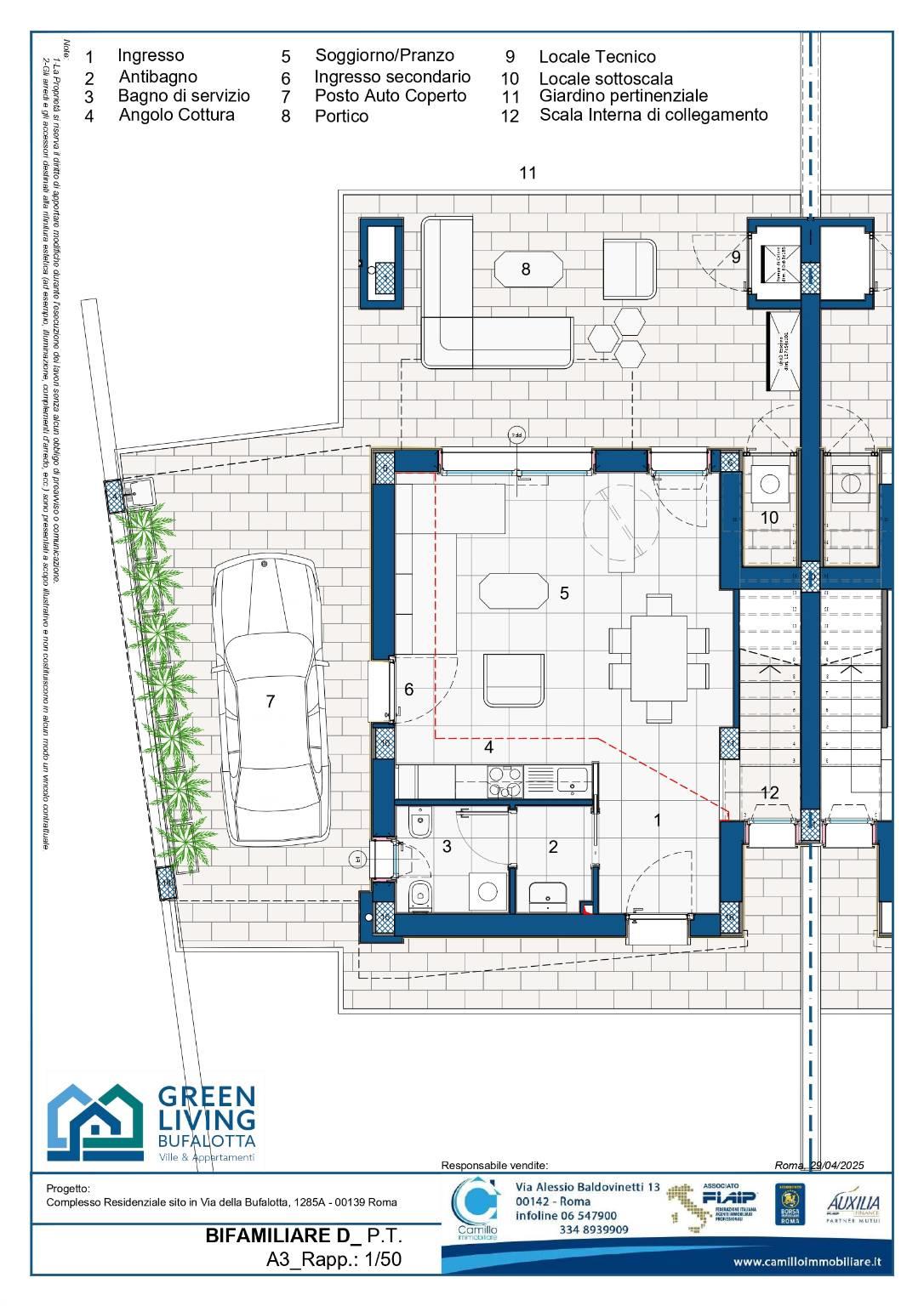 - al piano terra ingresso salone con cucina a vista, bagno con anti bagno, portico con locale tecnico/lavanderia, giardino, posto auto coperto all'interno del giardino;