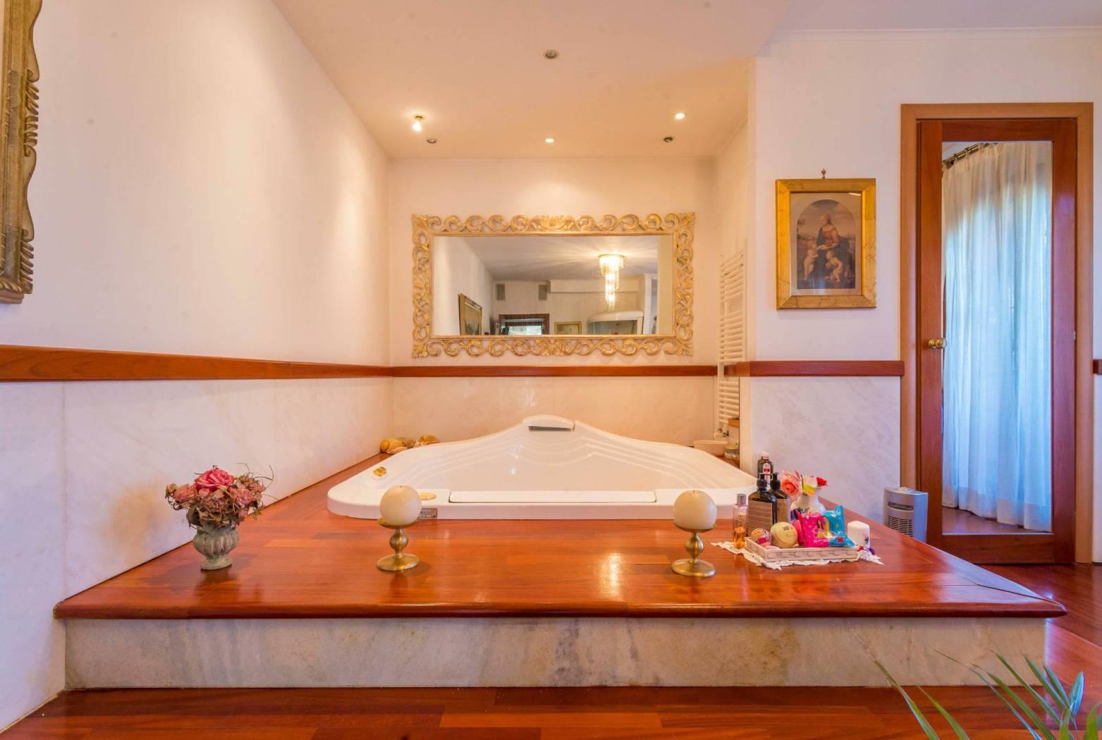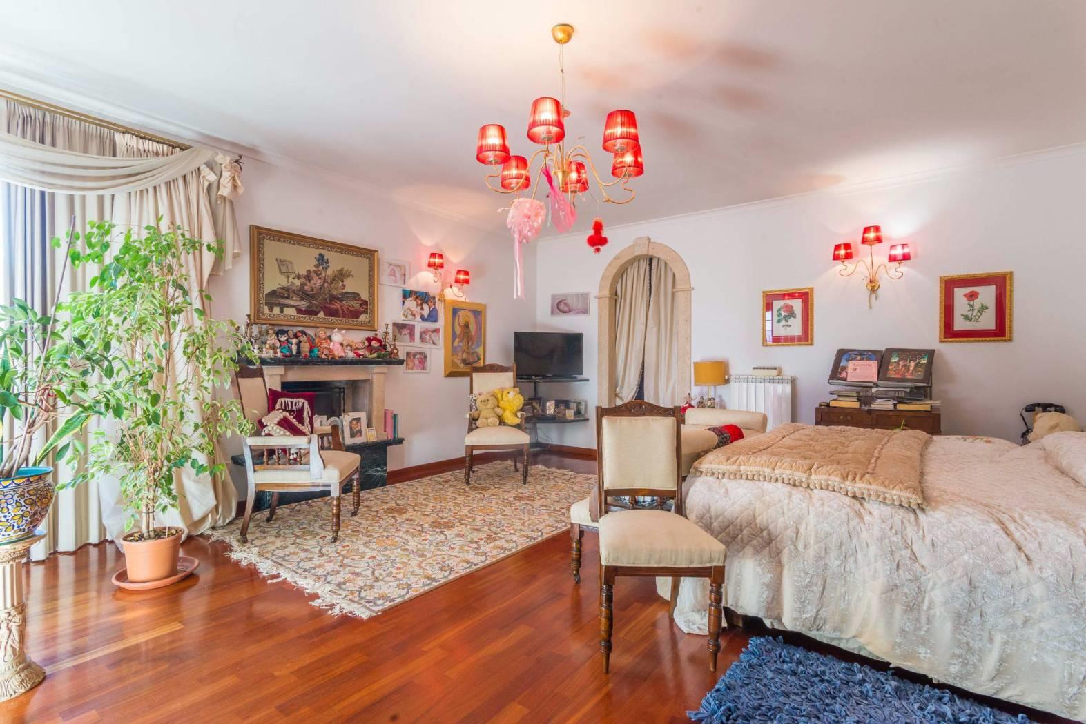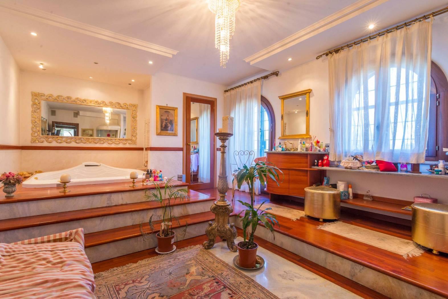 Il piano primo collegato a mezzo scala interna ed ascensore possiede 2 ampie camere da letto di cui una padronale di mq 27 con camino e cabina armadio di mq 15 - un fantastico bagno con vasca idromassaggio a forma e dimensioni di letto matrimoniale e doccia jacuzzi, il piano è circondato da terrazzo da cui si può ammirare la vista sul vasto terreno di proprietà.