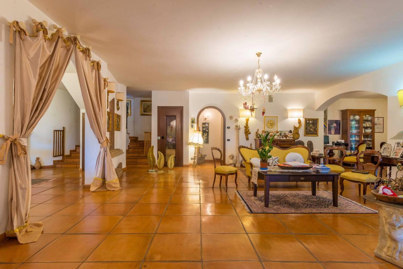 Il piano terra di mq 220 è composto da un salone quadruplo comprendente un camino in muratura con perimetro rettangolare in una delle posizioni centrali della sala - una cucina di mq 25 completamente in muratura con isola centrale - un bagno - accesso diretto al patio esterno ed al box di mq 60.
