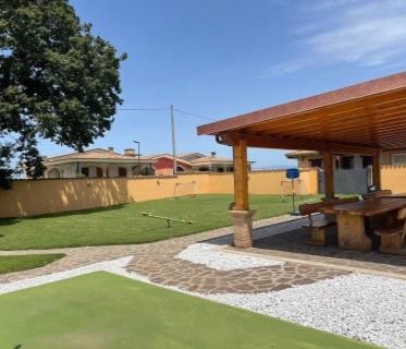 Lo spazio esterno si divide in 2 parti, una pavimentata in cui è possibile parcheggiare e un giardino con prato inglese ed irrigazione automatica, laghetto, zona con barbecue in muratura e zona relax/piscina.