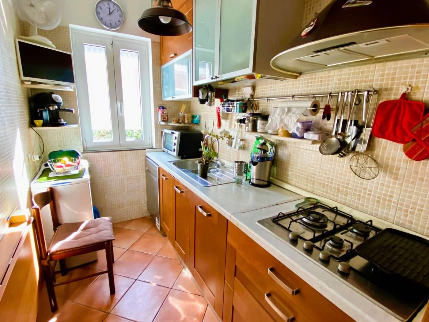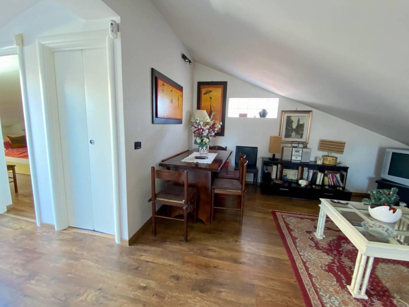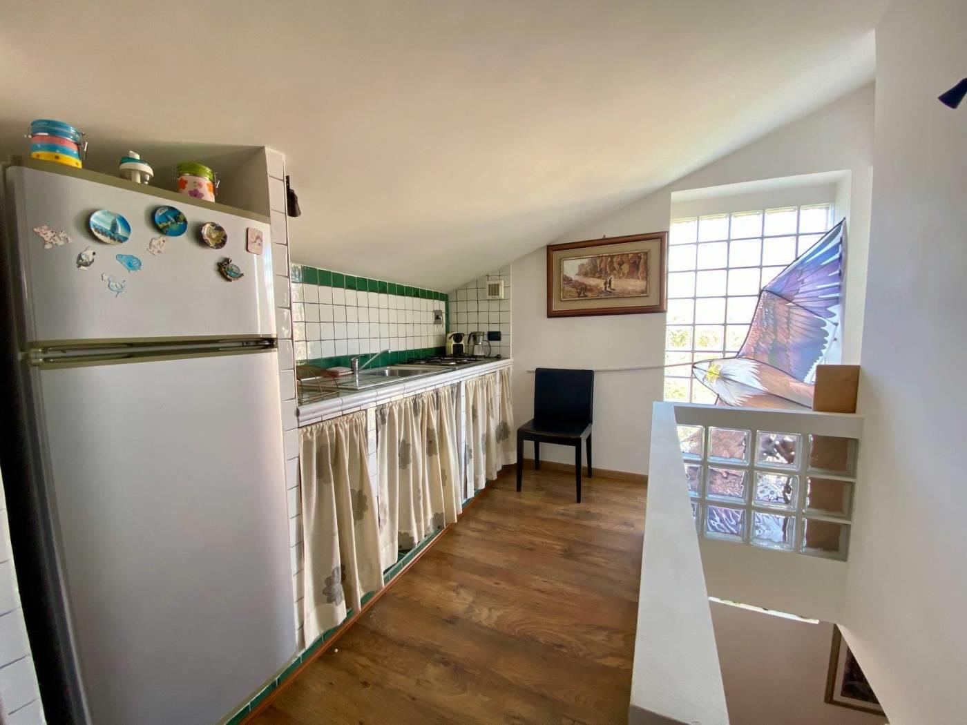 Al piano superiore mansardato e separato, al quale si accede sia con una scala interna sia direttamente dall'esterno in modo completamente indipendente, si trova una seconda cucina, soggiorno, camera da letto, cameretta, bagno e balcone.