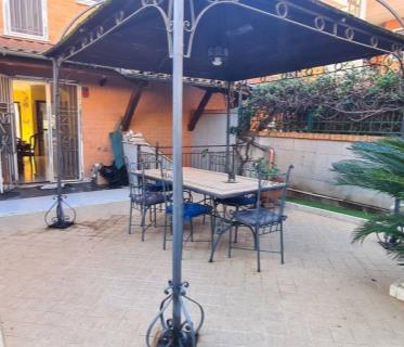 Ingresso da giardino privato (fronte e retro) di circa 100 mq totali con possibilità di mettere una macchina all'interno nella parte mattonata ed il restante è tutto prato.