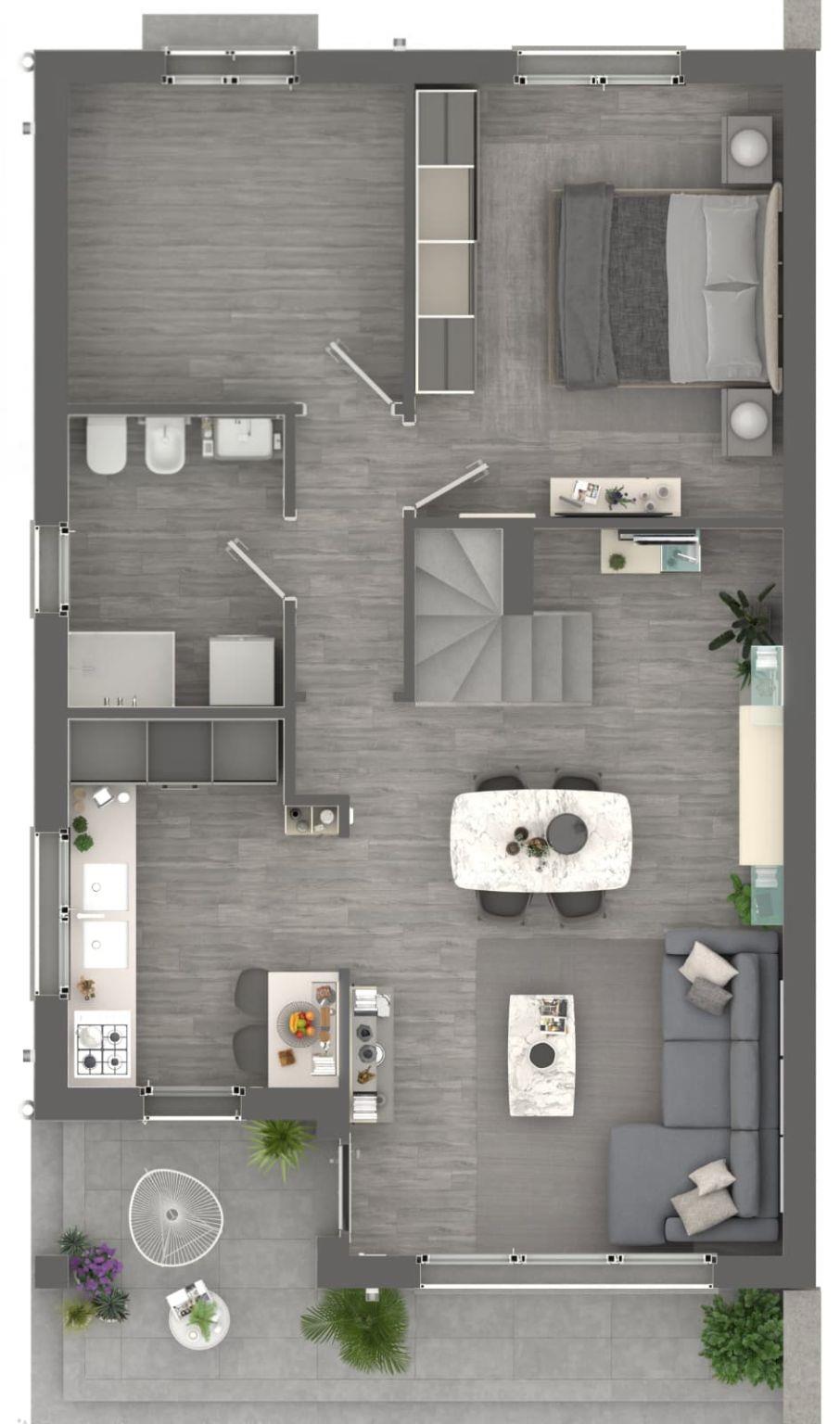 Le finiture di alta qualità e rigorosamente Made in Italy includono pavimenti in gres porcellanato di prima scelta, infissi in PVC ad alto isolamento termico e acustico e grate di sicurezza.