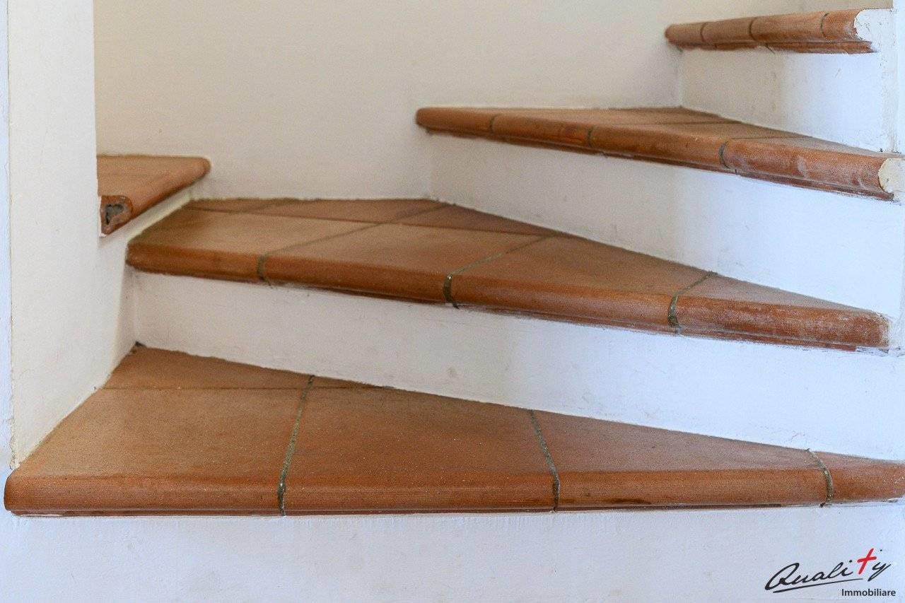 Raggiungiamo il piano superiore attraverso la scala interna, dove troviamo due camere, servizio e terrazzo.