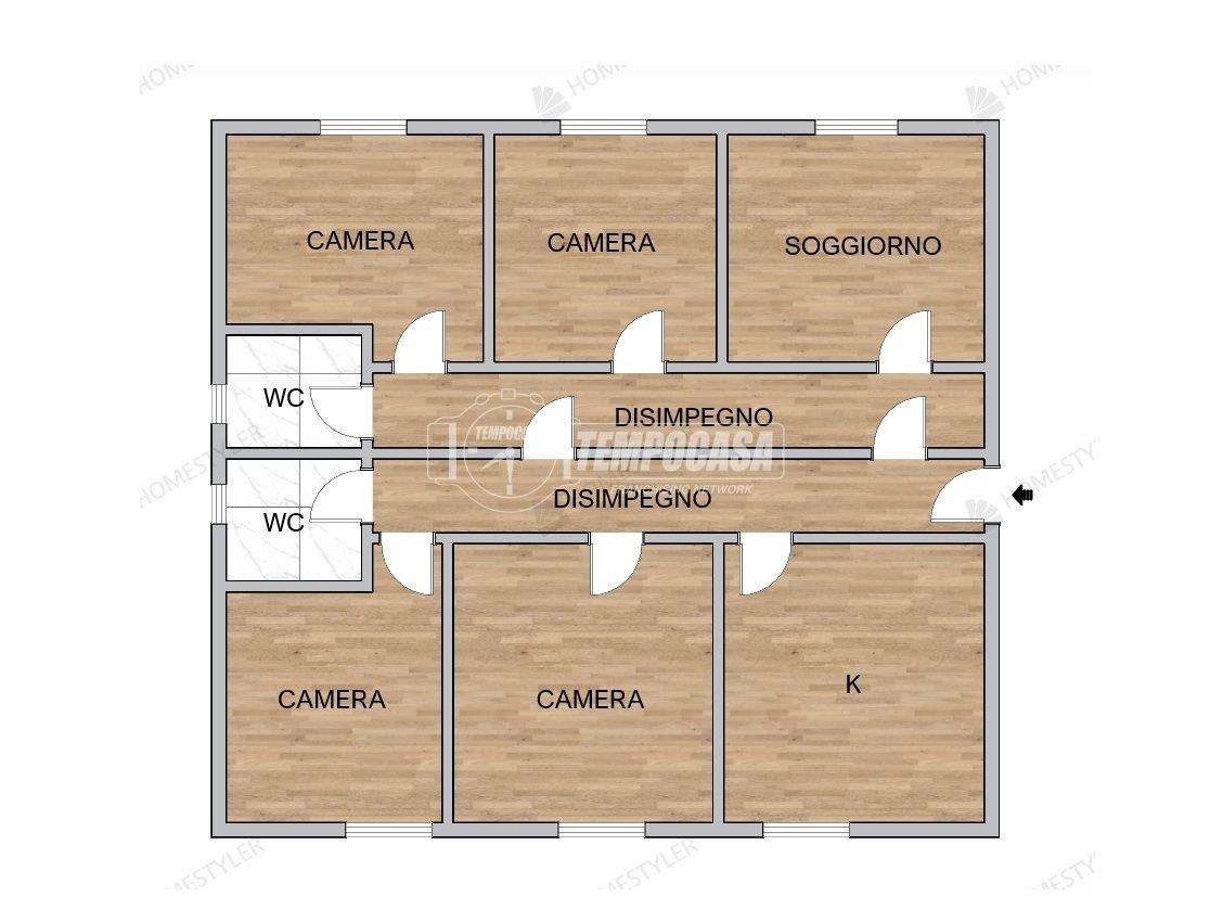 La casa si compone di: ingresso su ampio disimpegno, soggiorno, cucina abitabile, ben quattro camere da letto, e due bagni, entrambi finestrati.