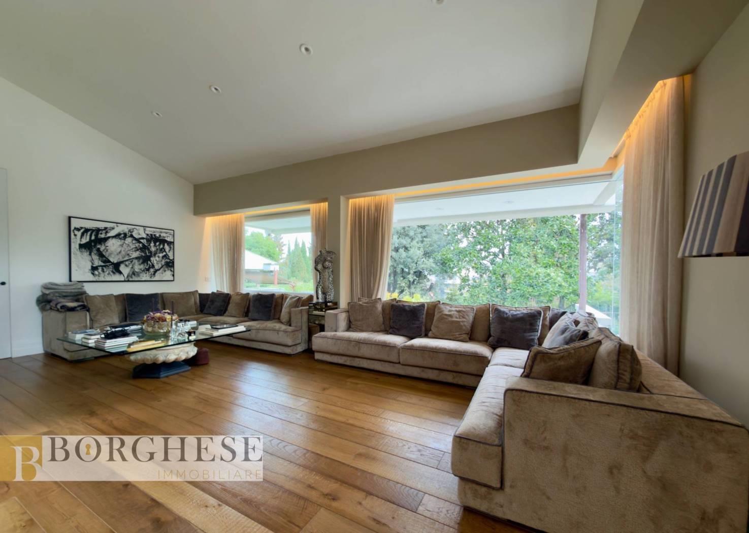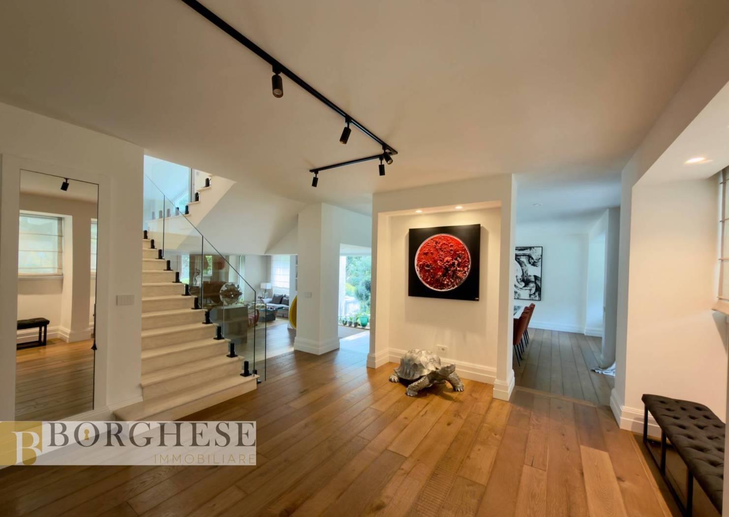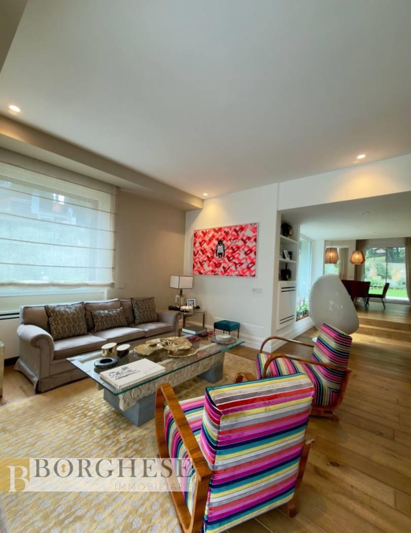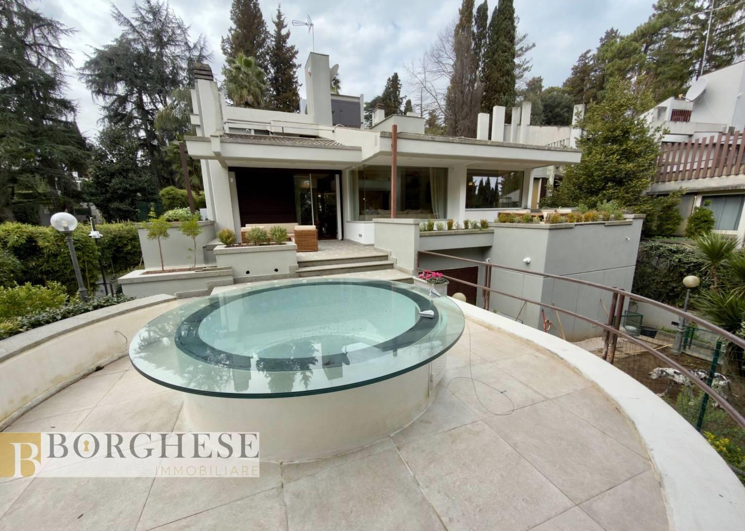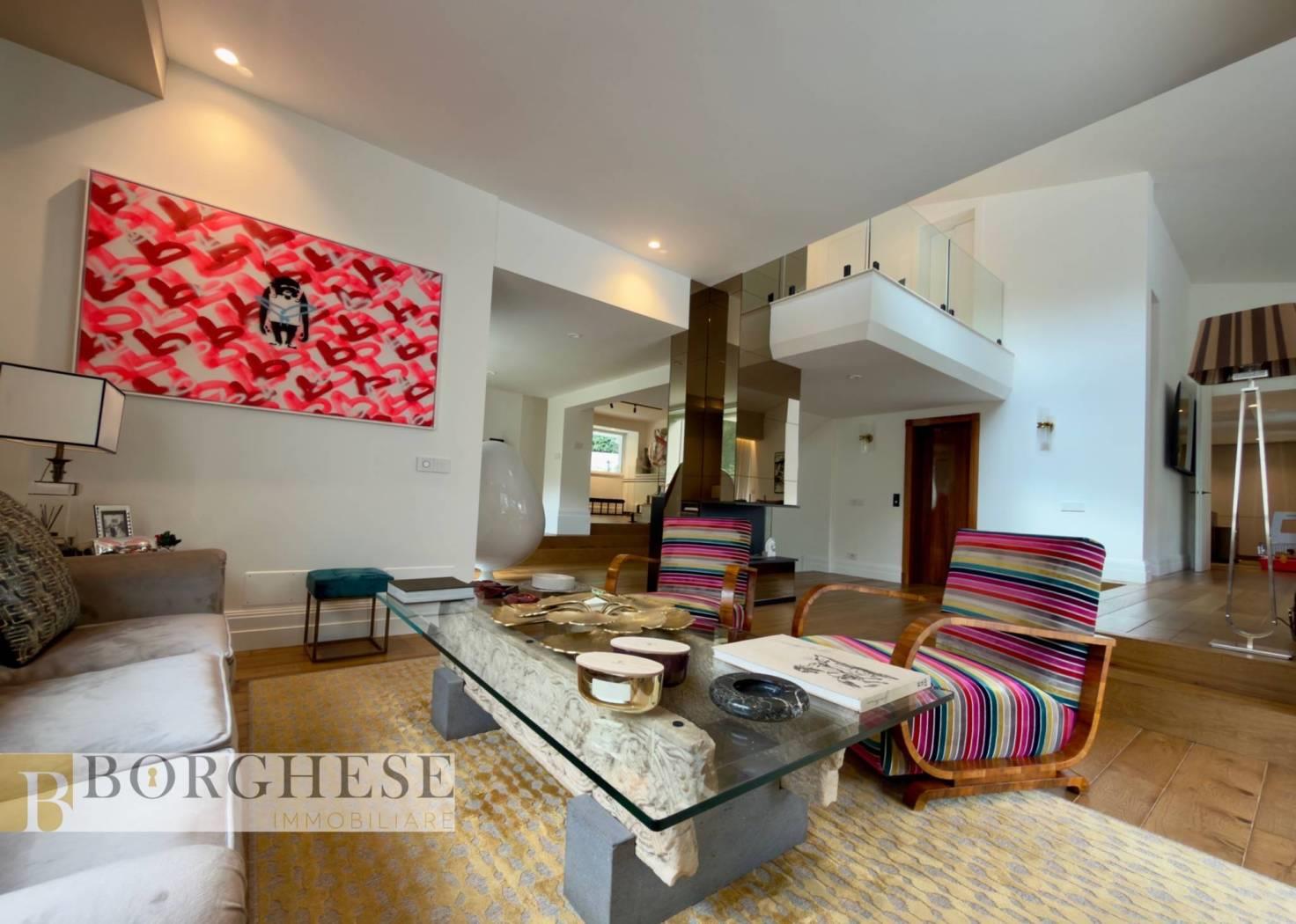 All’interno di un esclusivo comprensorio con servizio di portineria, straordinaria villa di circa 780 mq interni, distribuita su quattro livelli serviti da ascensore, circondata da splendidi spazi esterni e dotata di ogni comfort.