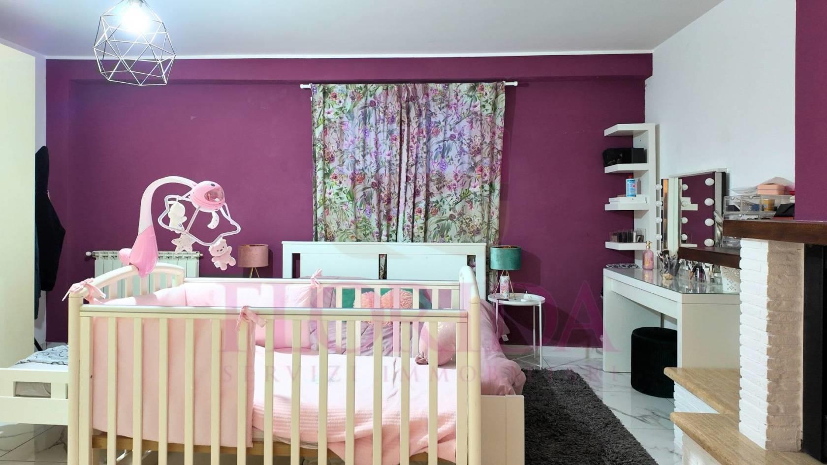 La zona notte si sviluppa al piano inferiore. Tre camere da letto — due matrimoniali, di cui una dotata di termocamino, e una singola — oltre a un secondo bagno. Ambienti raccolti e funzionali, pensati per garantire privacy e comfort.