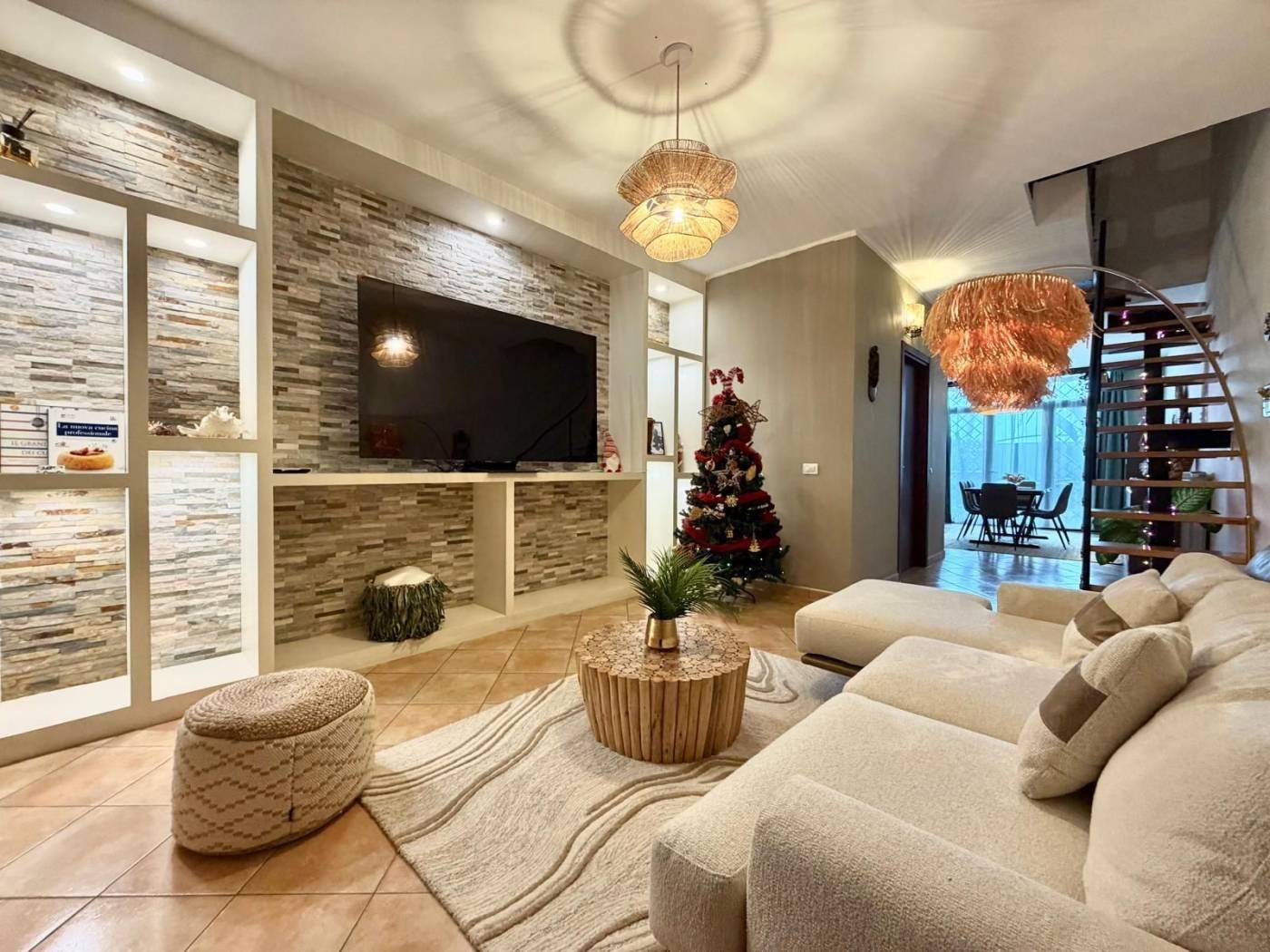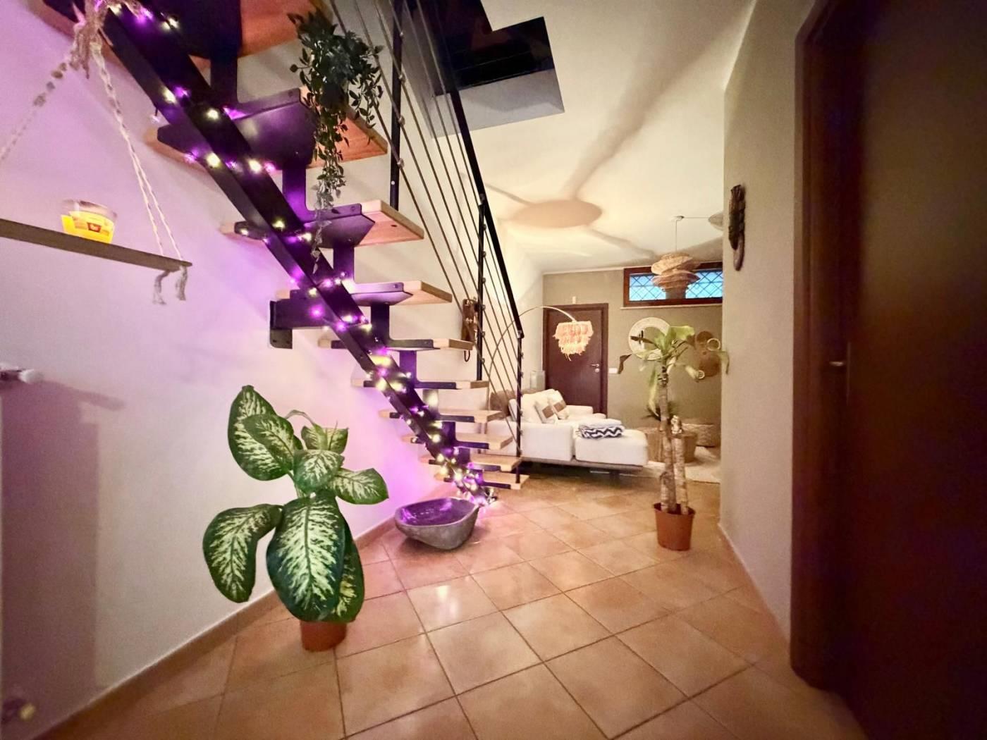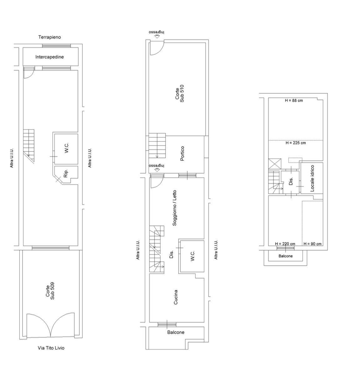 L'unità immobiliare è disposta su tre livelli sfalsati e parzialmente fuori terra, caratterizzata da una particolare conformazione che consente due livelli centrali con doppio accesso.