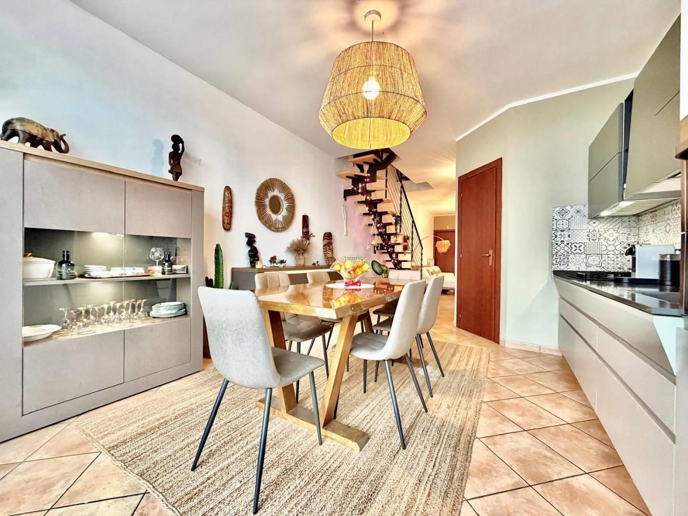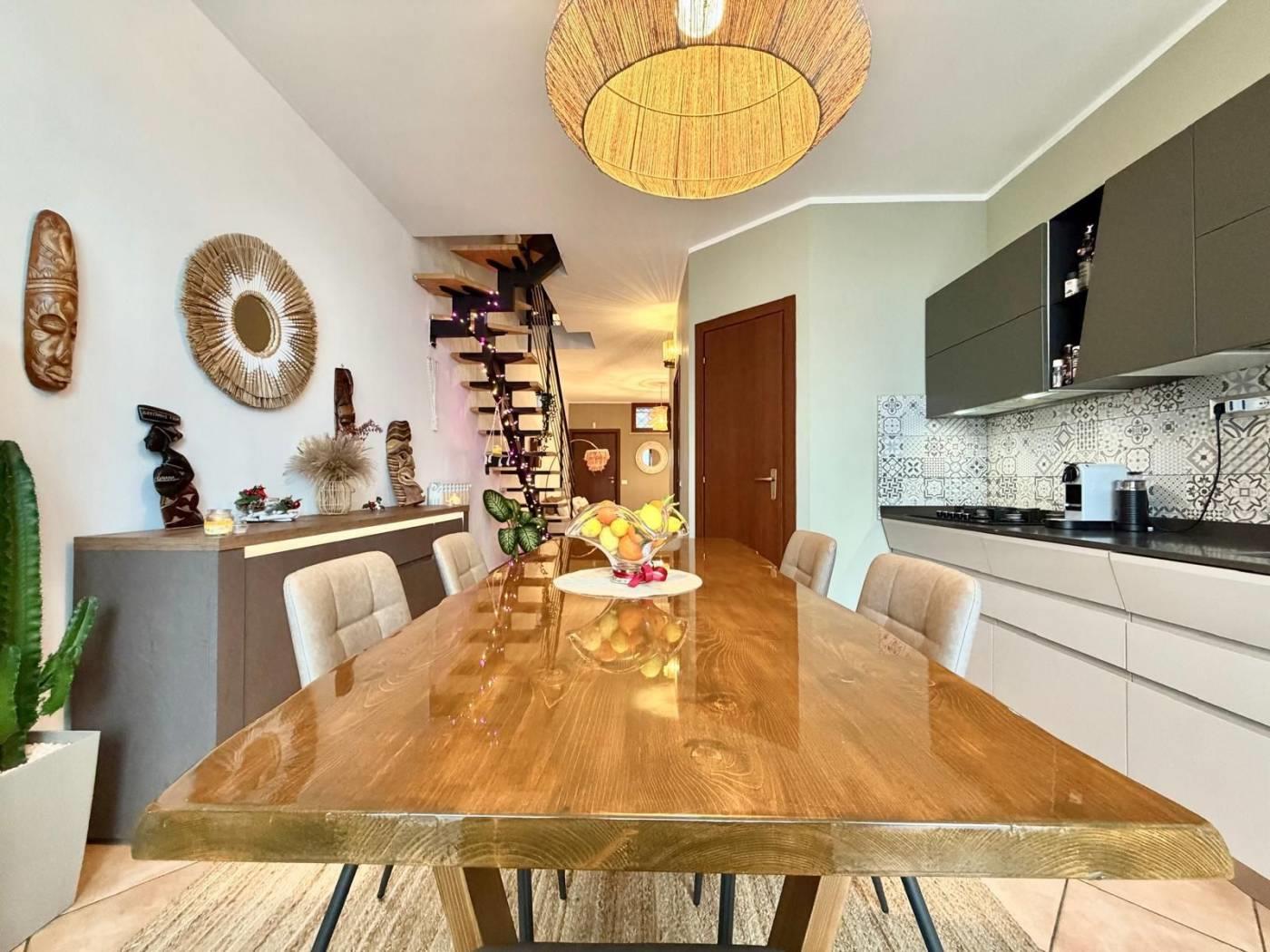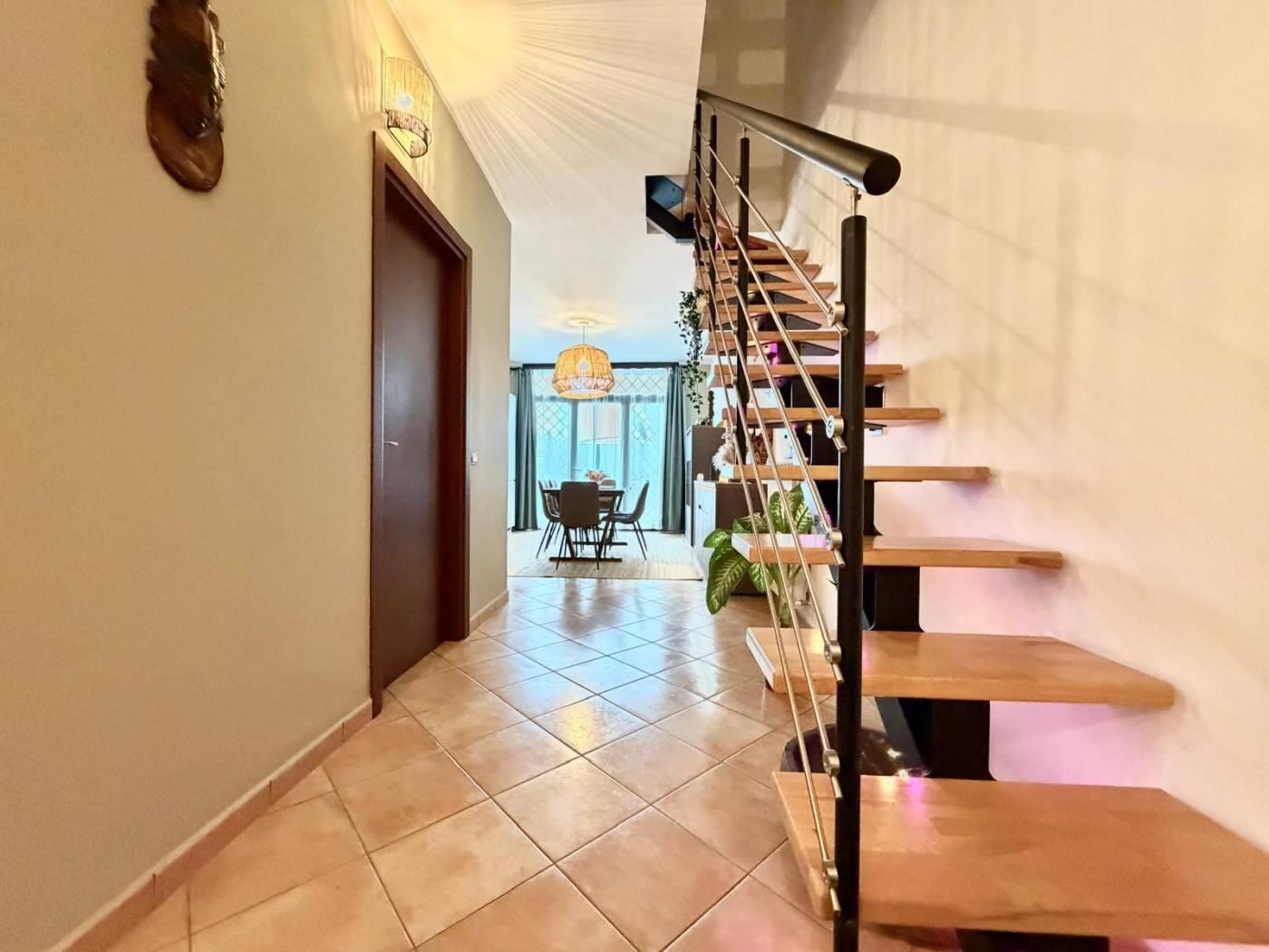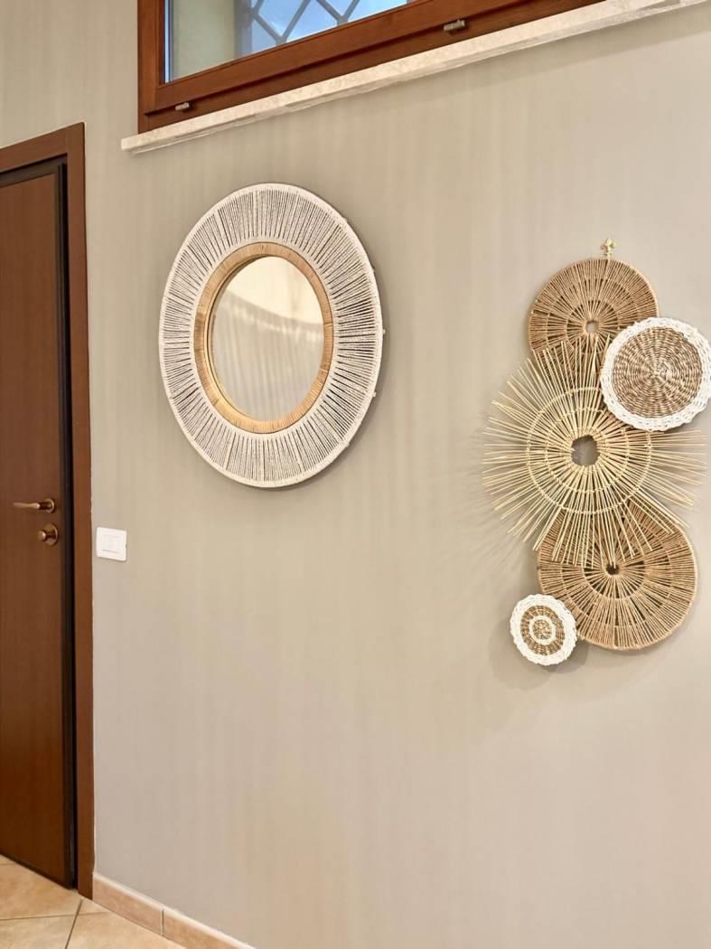 L'unità immobiliare è disposta su tre livelli sfalsati e parzialmente fuori terra, caratterizzata da una particolare conformazione che consente due livelli centrali con doppio accesso.