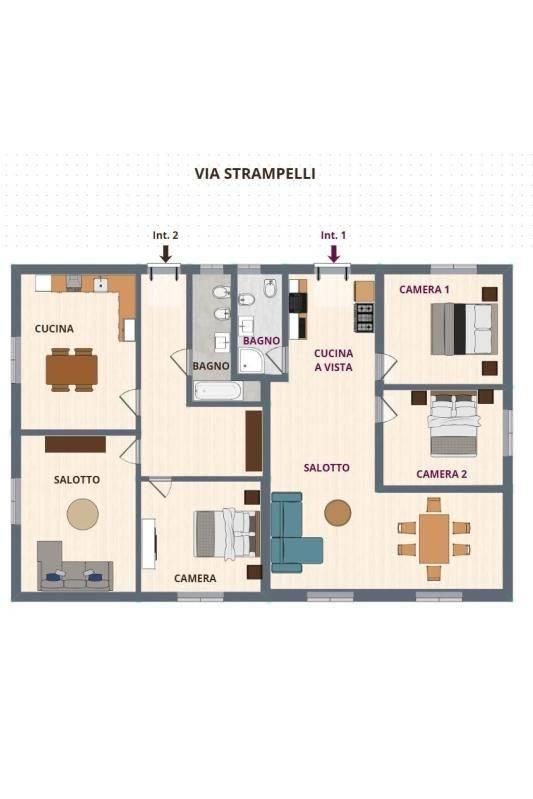 • Appartamento 2, circa 80 mq, anch’esso con due camere, soggiorno con cucina e bagno, funzionale e ben distribuito.