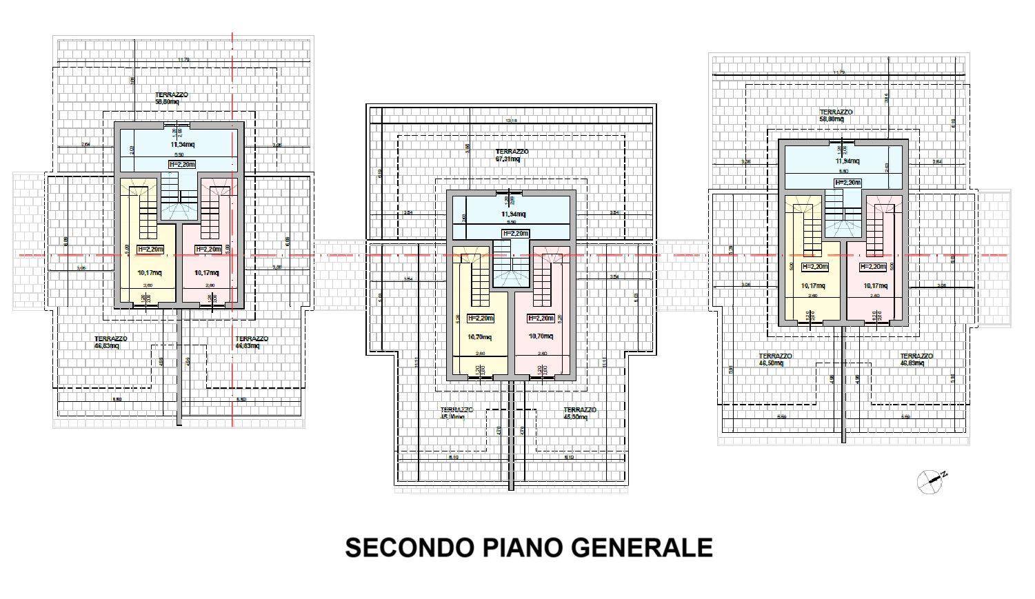 Splendide porzioni di VILLE trifamiliari, indipendenti, cielo / terra, composte al piano terra (da circa 54 a 56 mq. interni) da salone con possibilità di camino, cucina abitabile, bagno finestrato, ripostiglio, disimpegno, portico, posti auto e giardino da circa 79 mq. a 212 mq., al primo piano (da circa 56 a 58 mq. interni) da 3 camere da letto, bagno finestrato, ripostiglio, disimpegno e terrazze da circa 16 mq. a 26 mq., ed al secondo piano (da circa 17 a 19 mq. interni) da locale ed ampia terrazza panoramica da circa 45 mq. a 67 mq.