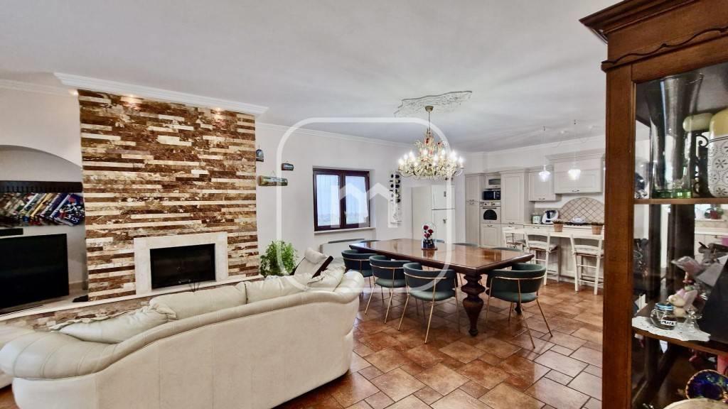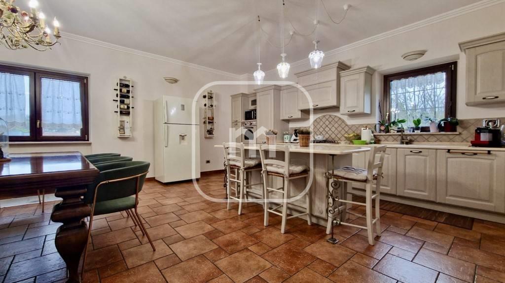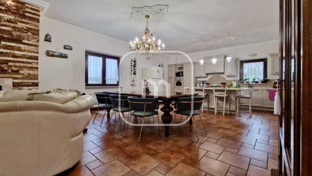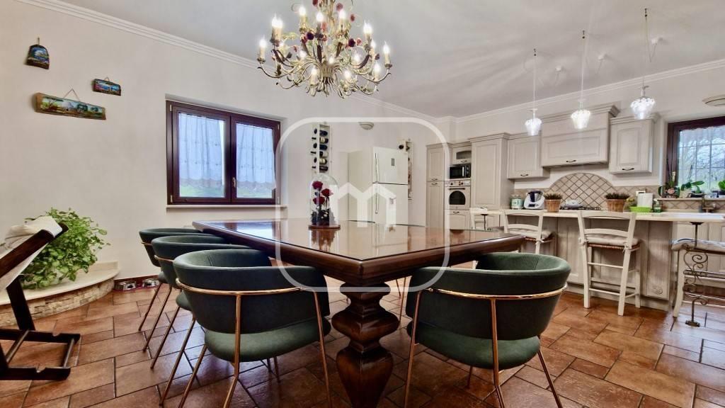 RM12176 ________ una villa unifamiliare di 220mq oltre porticato di 40 mq, box auto di 30mq e 3000mq di giardino ben curato, pianeggiante e ottimamente distribuito tra ampio e comodo viale di accesso ed area a verde vivibile e funzionale. Ci accoglie al piano terra il porticato che permette l’accesso sia all’ampio box auto sia all’ingresso principale della soluzione che tramite comode scale ci conduce al piano primo dedicato esclusivamente alla zona giorno con un grande, ben distribuito e luminosissimo salone con termo camino e con angolo cottura e isola centrale; quest’ultimo dotato anche di un balcone con affaccio sul giardino .