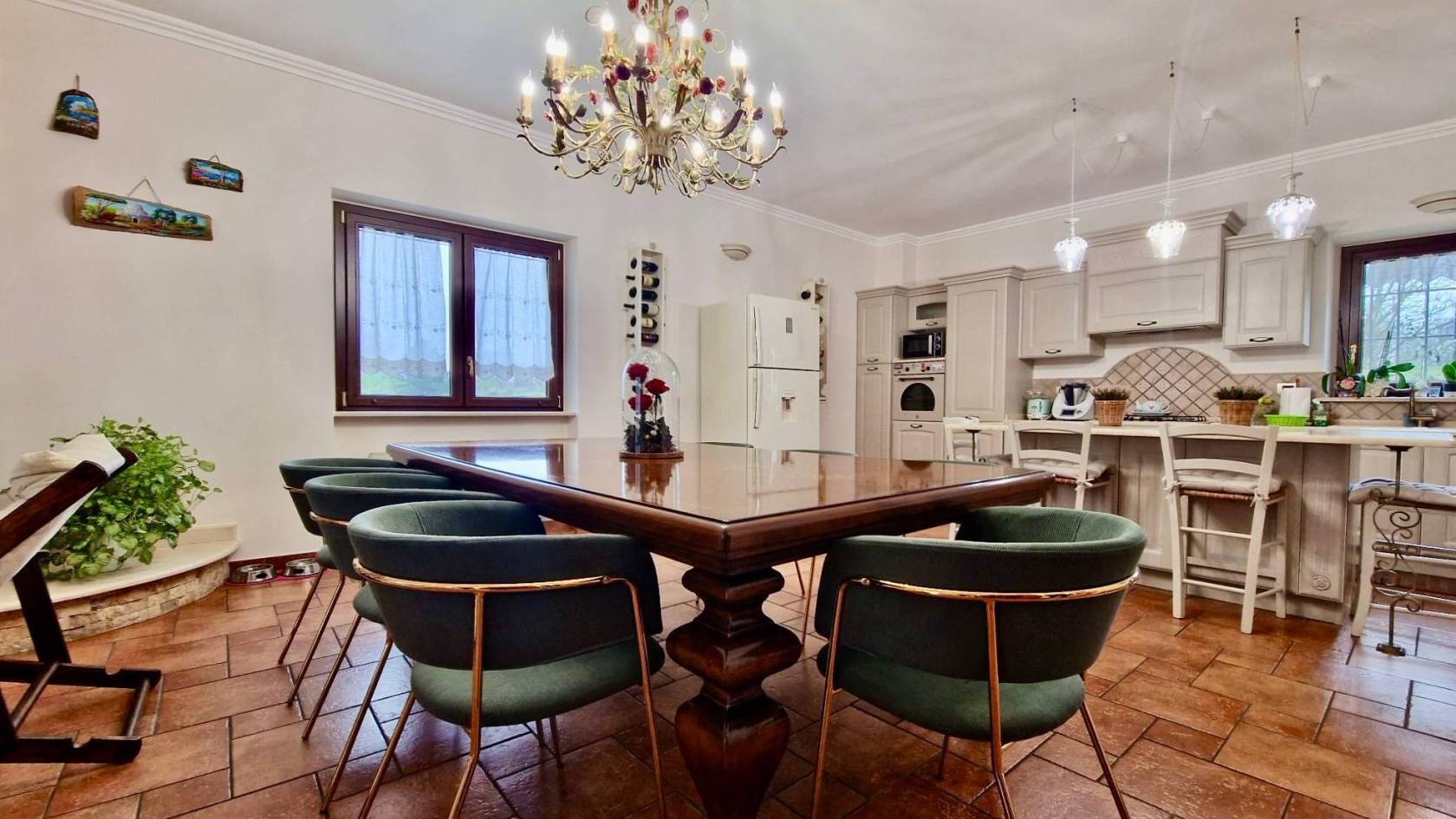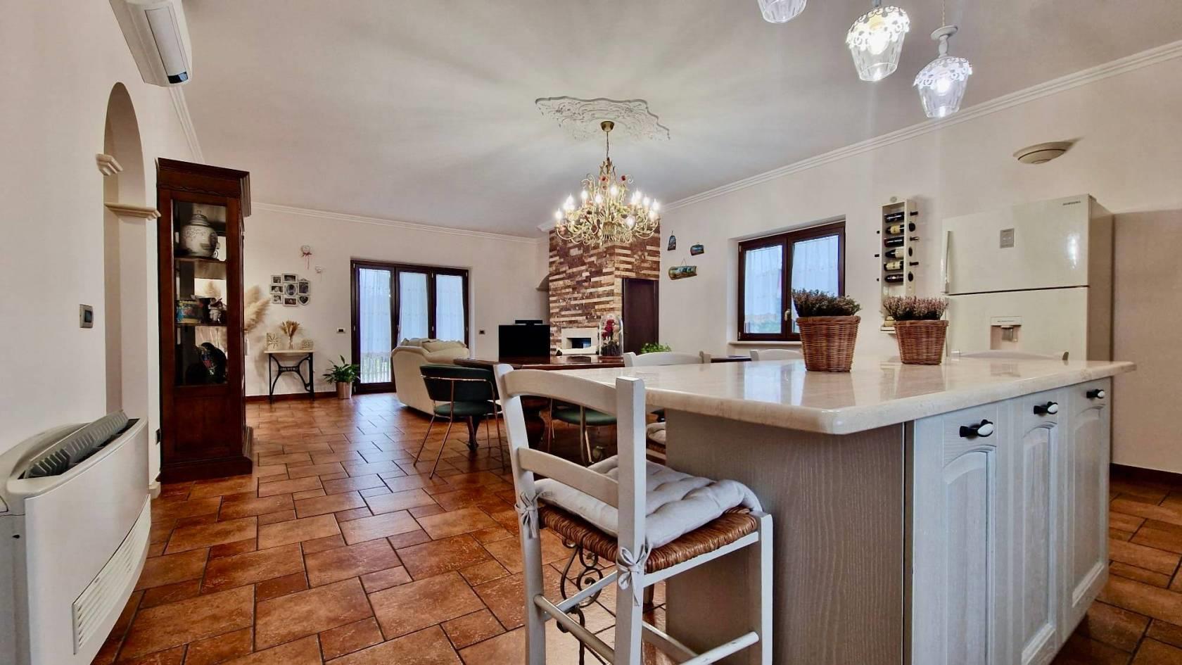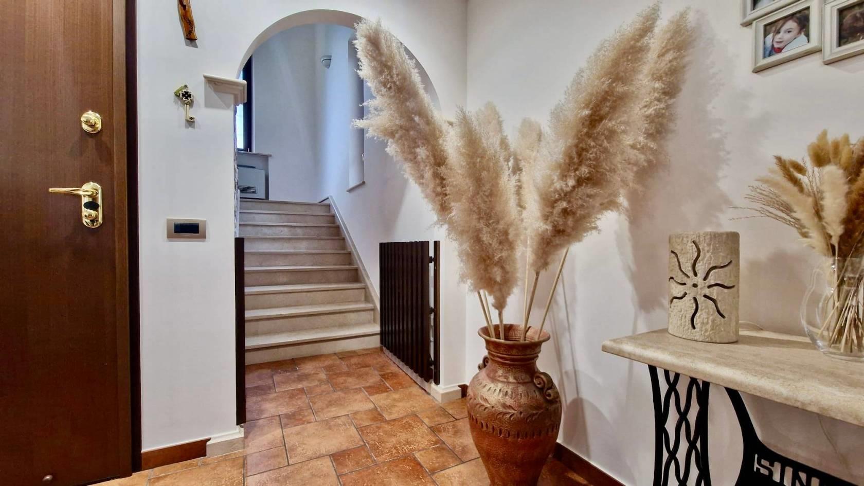 Ci accoglie al piano terra il porticato che permette l’accesso sia all’ampio box auto sia all’ingresso principale della soluzione che tramite comode scale ci conduce al piano primo dedicato esclusivamente alla zona giorno con un grande, ben distribuito e luminosissimo salone con termocamino e con angolo cottura e isola centrale; quest’ultimo dotato anche di un balcone con affaccio sul giardino .