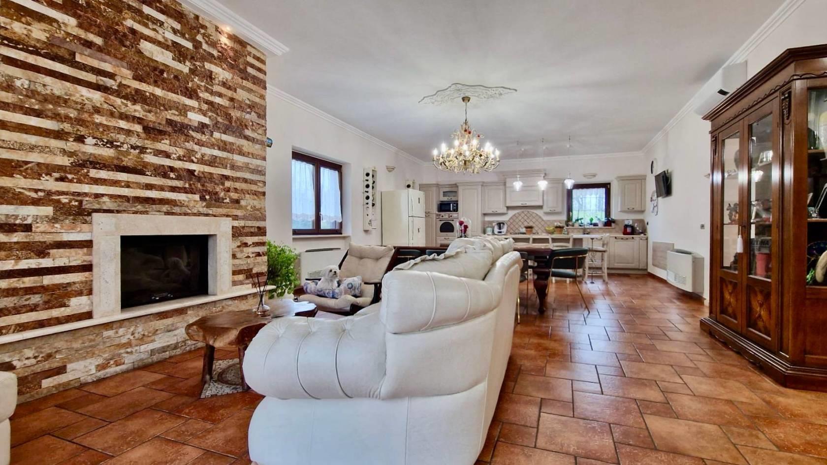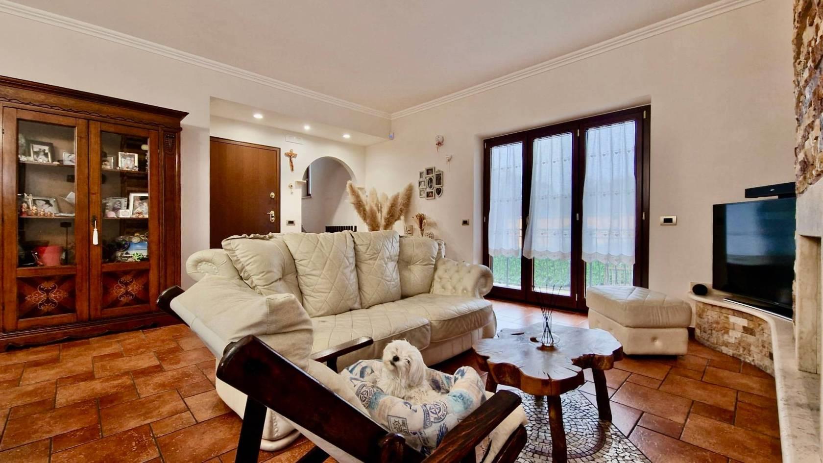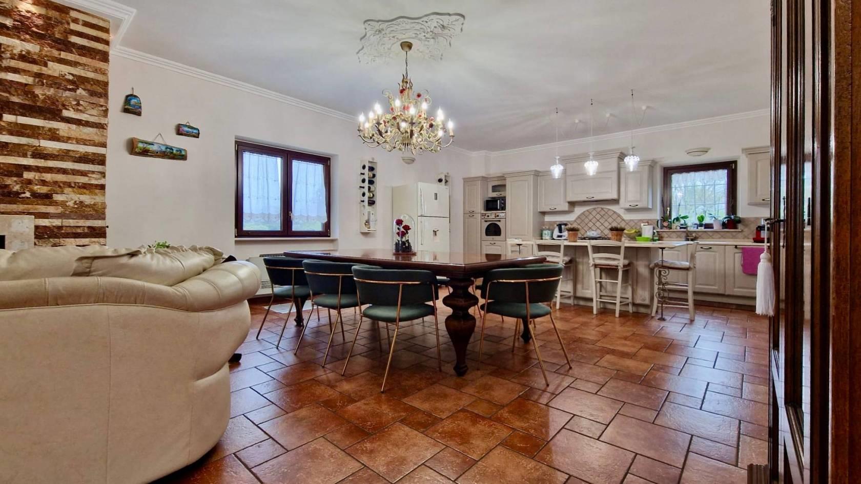 Ci accoglie al piano terra il porticato che permette l’accesso sia all’ampio box auto sia all’ingresso principale della soluzione che tramite comode scale ci conduce al piano primo dedicato esclusivamente alla zona giorno con un grande, ben distribuito e luminosissimo salone con termocamino e con angolo cottura e isola centrale; quest’ultimo dotato anche di un balcone con affaccio sul giardino .