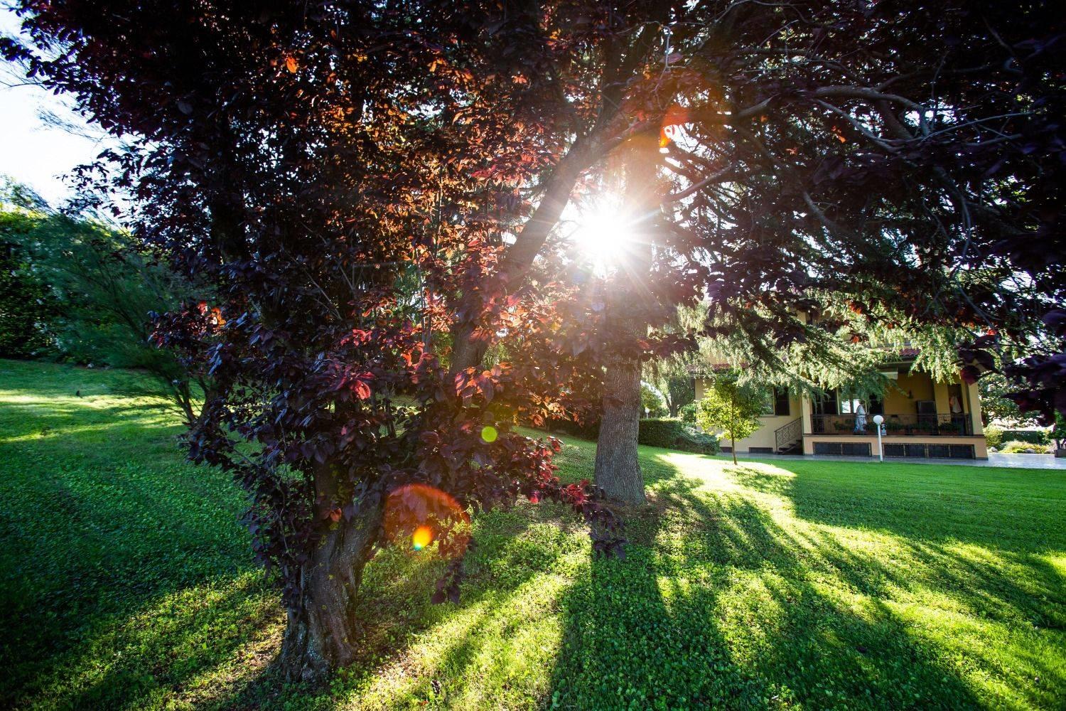 Varcando il grande cancello che garantisce una privacy assoluta, si apre uno spettacolo di eccezionale bellezza; si viene subito accolti da un giardino curatissimo di circa 7.000 mq, interamente a prato all'inglese (manutenuto quotidianamente dal custode che attualmente vive accanto alla proprietà), con più di 30 alberi ad alto fusto che con la loro ombra secolare contribuiscono a creare degli angoli ombreggiati davvero unici.