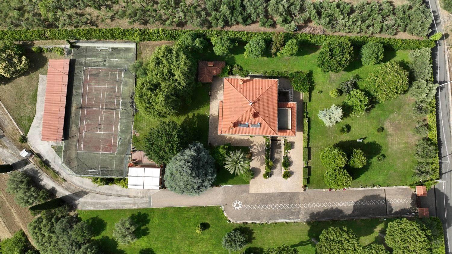 Camminando per il giardino, oltre a godere di un panorama eccezionale che si estende su tutta la vallata circostante, fino al mare Tirreno, da Torvaianica al monte Circeo, fino alle isole pontine, si può trovare anche un campo da tennis e/o calcetto con illuminazione notturna; attualmente non è presente una piscina, ma c'è una predisposizione con lo spazio già assegnato con tanto di pompa dell'acqua. Troviamo inoltre una zona coperta attualmente attrezzata con una cucina completamente funzionante con canna fumaria, forno per pizza e barbecue.