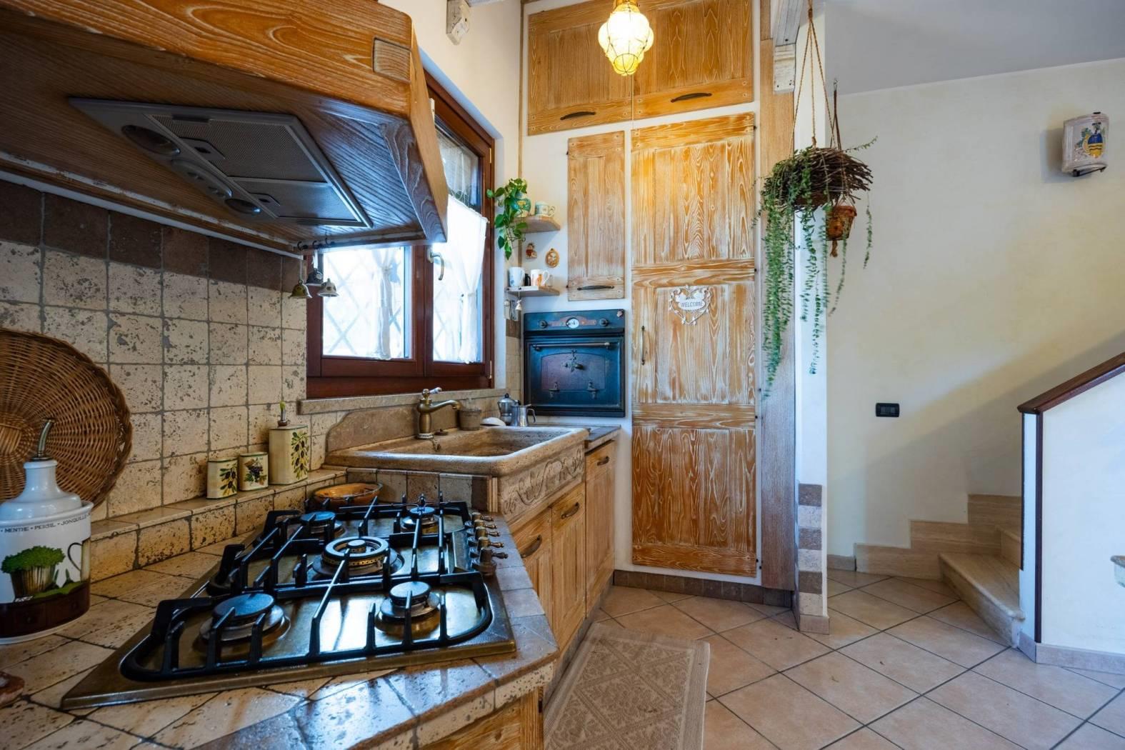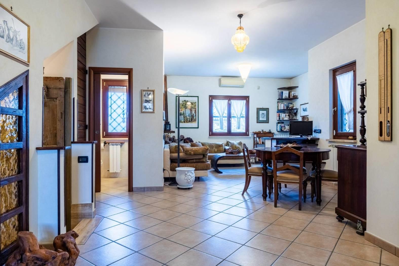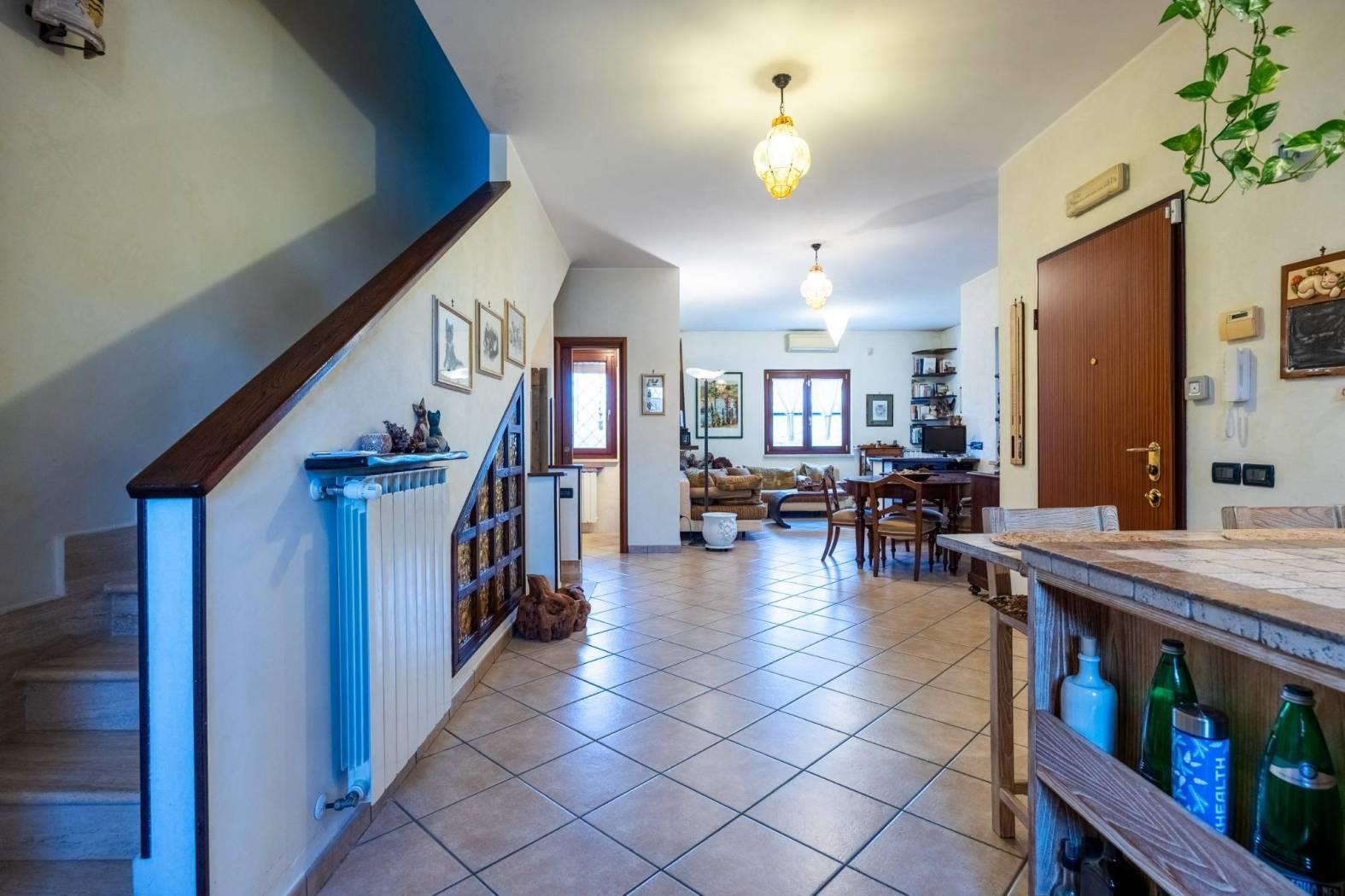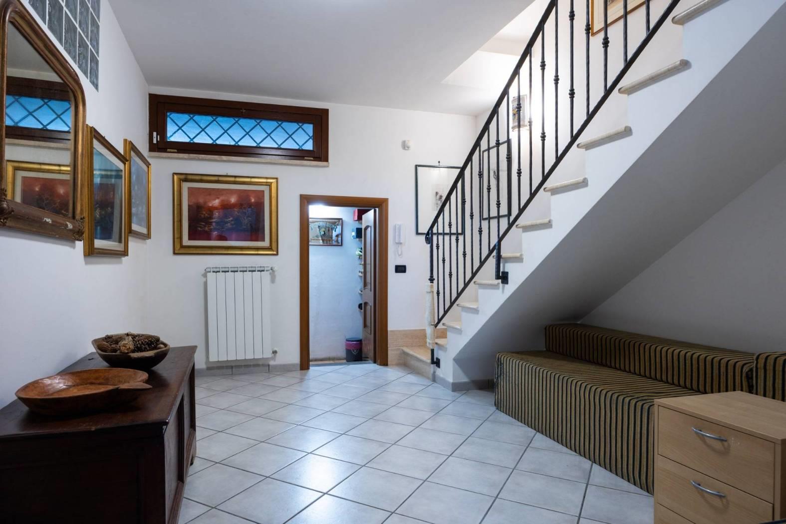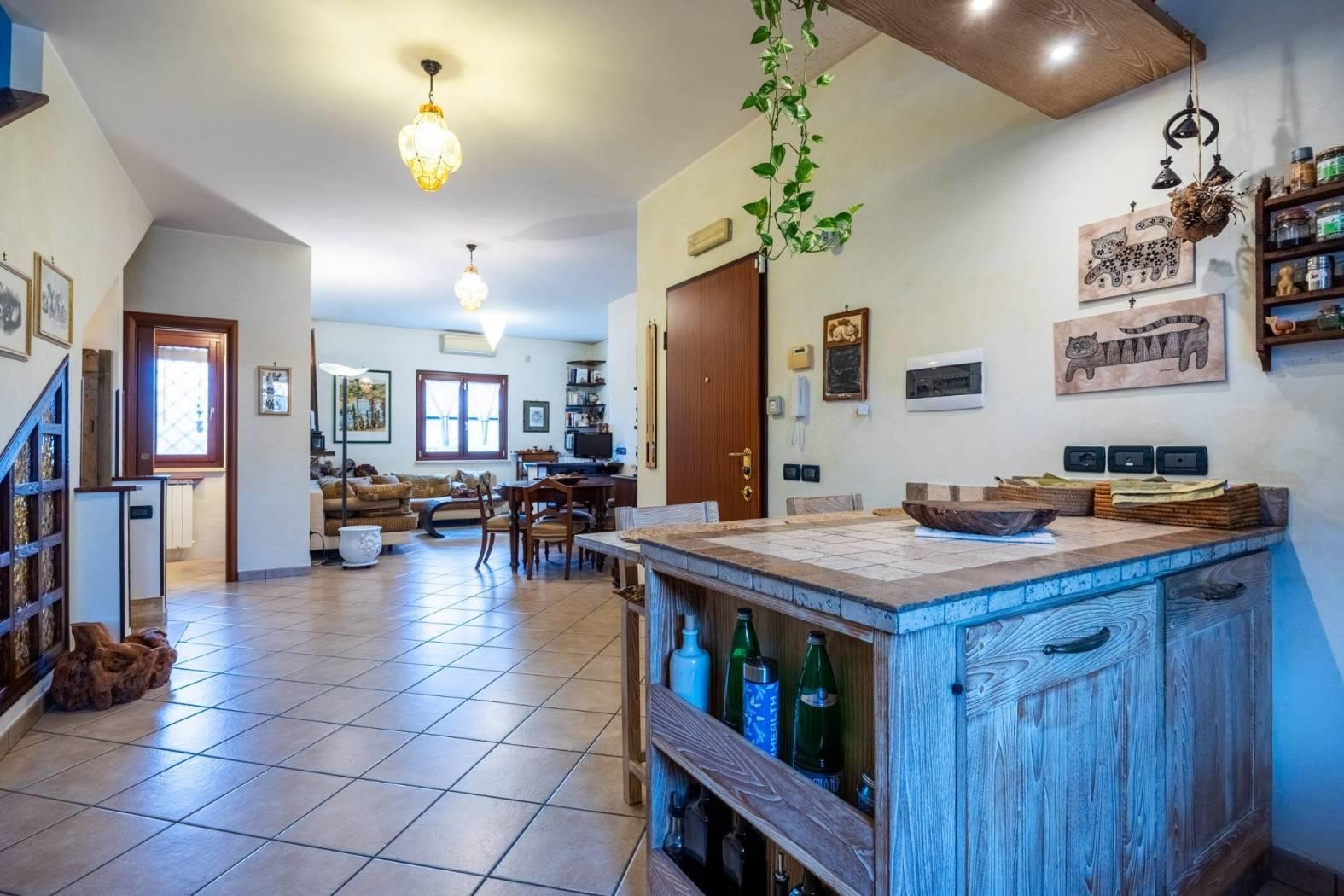 Infernetto - Via Castello Tesino all'interno di un comprensorio privato chiuso, proponiamo in vendita un rifinitissimo villino in bifamiliare che si sviluppa su tre livelli. Accediamo all'immobile attraverso un patio coperto e ci troviamo nella zona giorno che è composta da salone con camino, una cucina di pregio in castagno decapato con lavello in blocco di marmo scolpito a mano, la zona relax con il divano e un bagno. Attraverso una comoda scala, scendiamo nell'ampia camera da letto con aria condizionata servita da un bagno e da un'ampia cabina armadio. Nello stesso piano troviamo l'intercapedine, molto ampia, che si sviluppa su due lati che è rifinita con intonaco, pavimento piastrellato e con scaffalature e che viene usata come cantina. Al piano mansarda troviamo un'altra camera con velux. La villa è contornata da un curatissimo giardino che si sviluppa su tre lati dove troviamo piante ad alto fusto, due ulivi, un falso pepe, un albicocco, un prugno, un limone, un arancio, oltre ad un angolo con lentisco, corbezzolo e mirto. Sempre nel giardino, rimane un grigliato in legno che lo contorna, un lavello in muratura, l'impianto di irrigazione a tre zone, la tettoia, la casetta in muratura per gli attrezzi e un armadio in muratura. L'immobile ha impianto di condizionamento in ogni piano, l'impianto elettrico sezionato con due quadri ed interruttore generale di auto ripristino, tende parasole (4) su tutto il patio, la predisposizione per l'allarme e pannelli fotovoltaici (impianto da 3 KW) e valvole di ritorno su scarichi acque piovane. Esposizione solare su tre lati, Nord/Est/Ovest.
