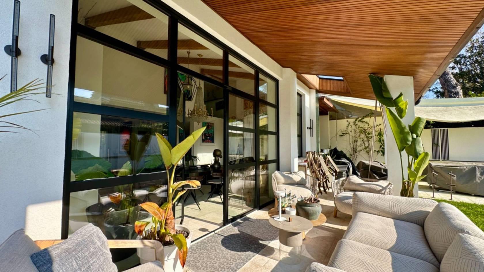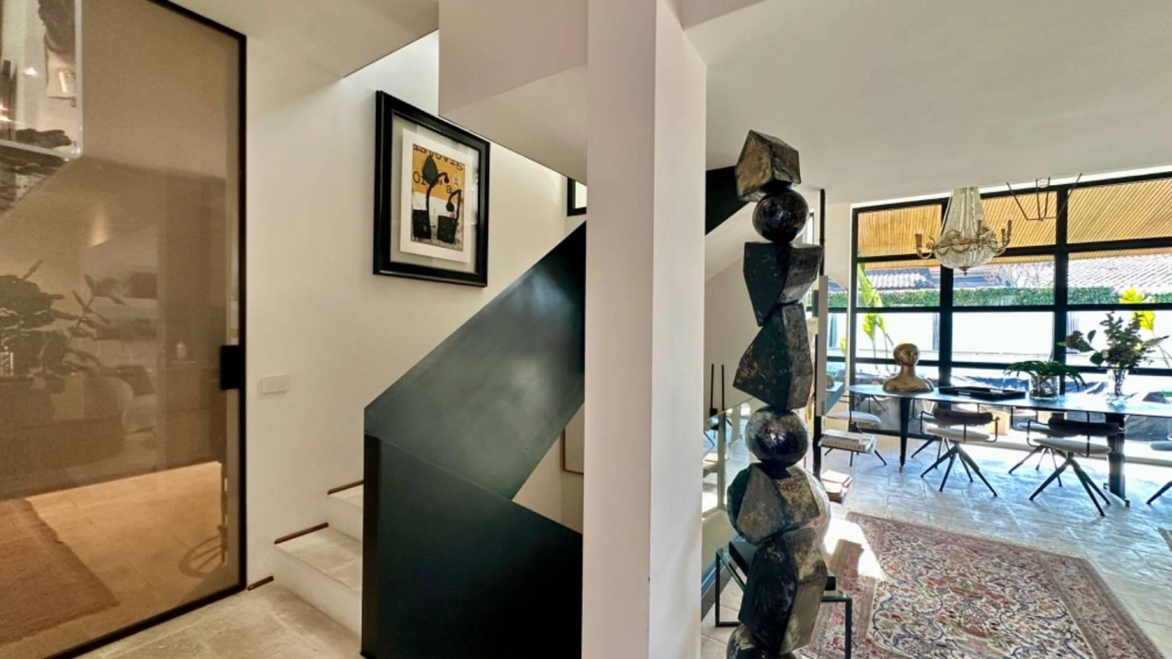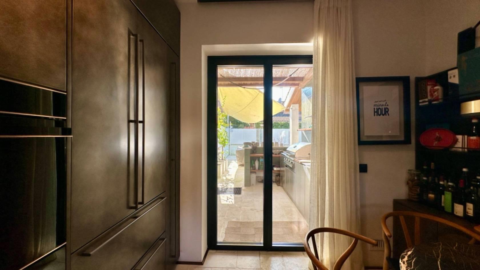 Al piano terra, varcando la soglia d'ingresso, ci accoglie un luminoso salone a doppia altezza, caratterizzato da grandi vetrate realizzate su misura che si affacciano su un patio arredato e su un curato giardino.