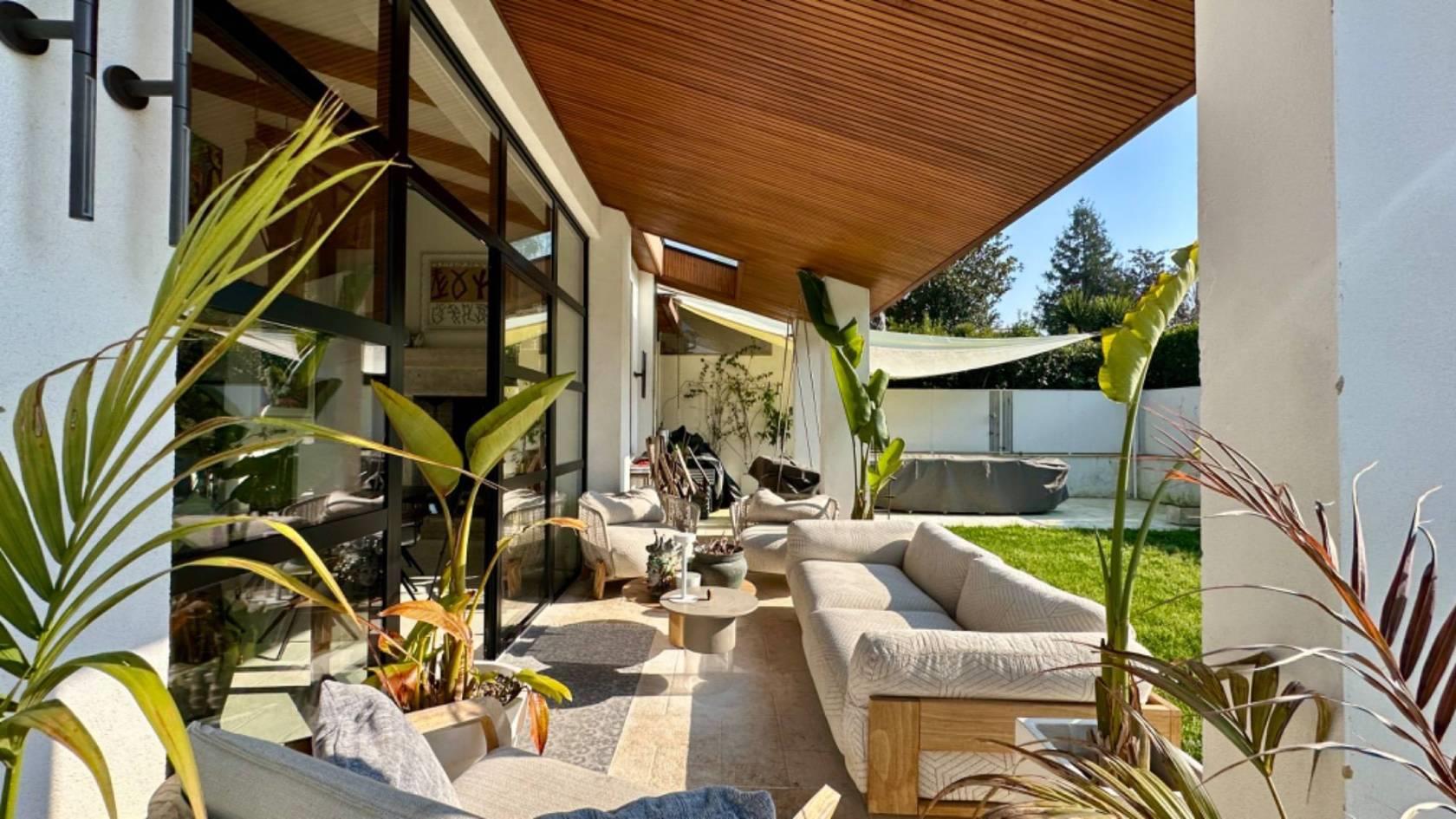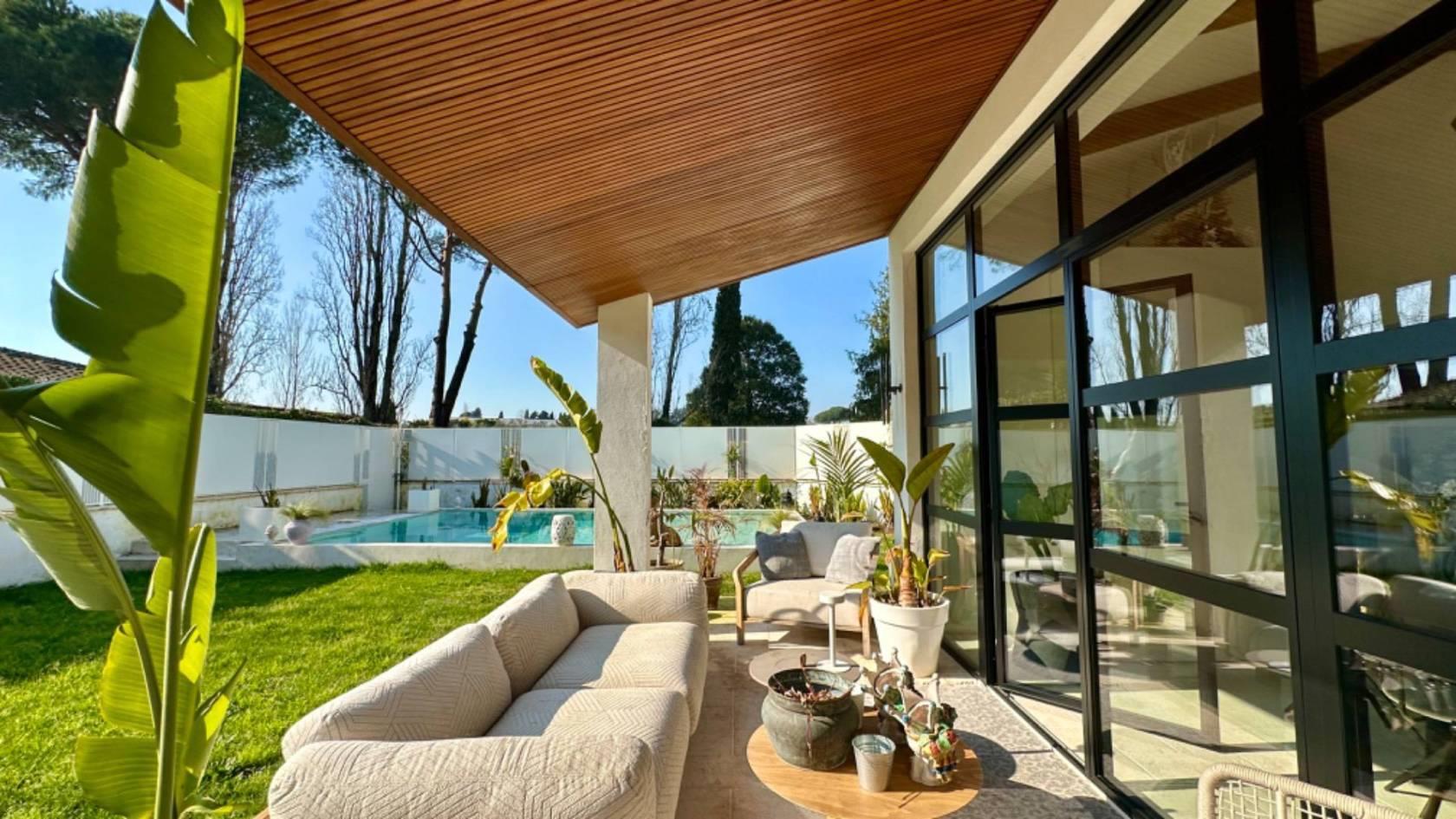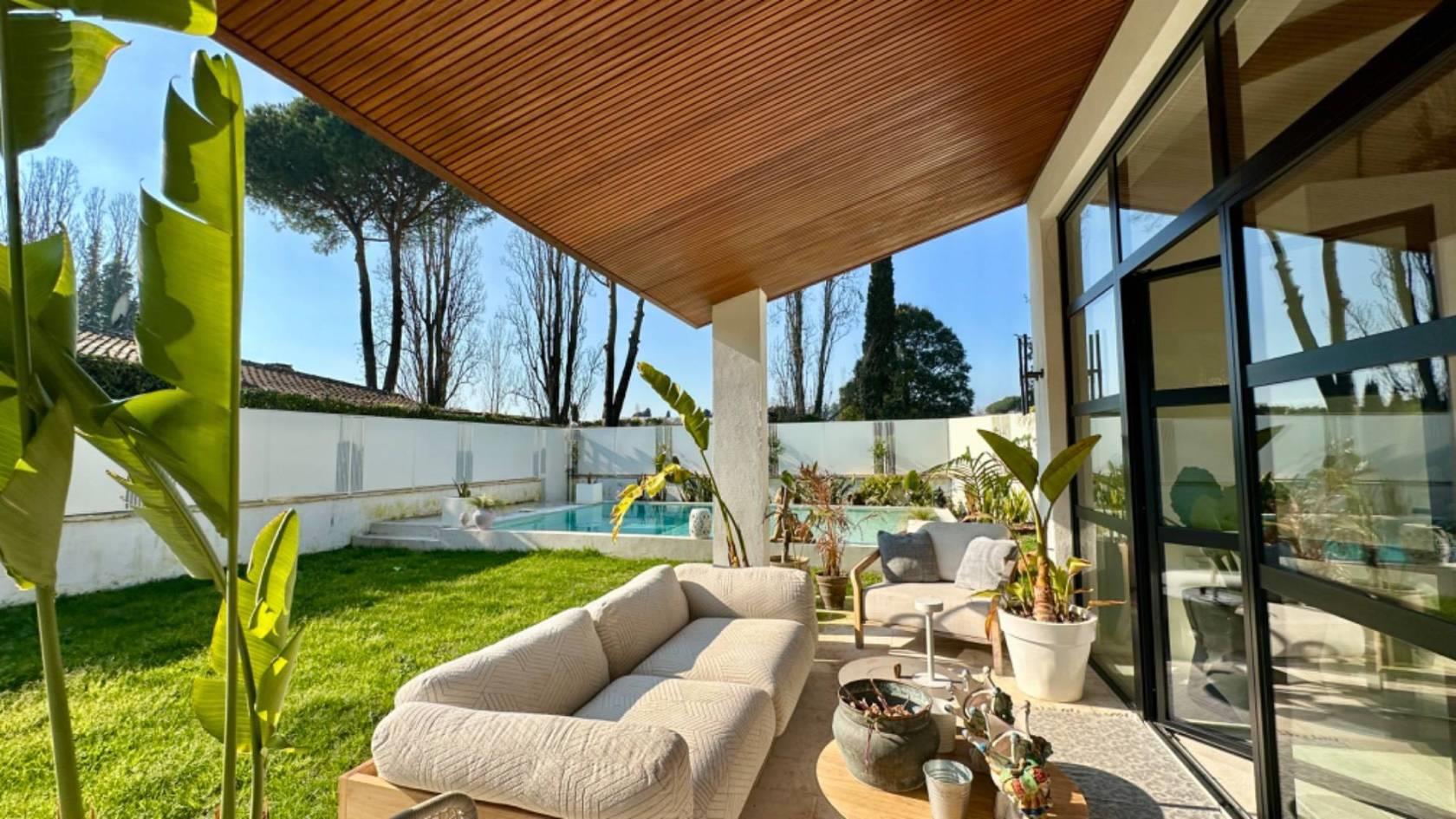 Al piano terra, varcando la soglia d'ingresso, ci accoglie un luminoso salone a doppia altezza, caratterizzato da grandi vetrate realizzate su misura che si affacciano su un patio arredato e su un curato giardino.