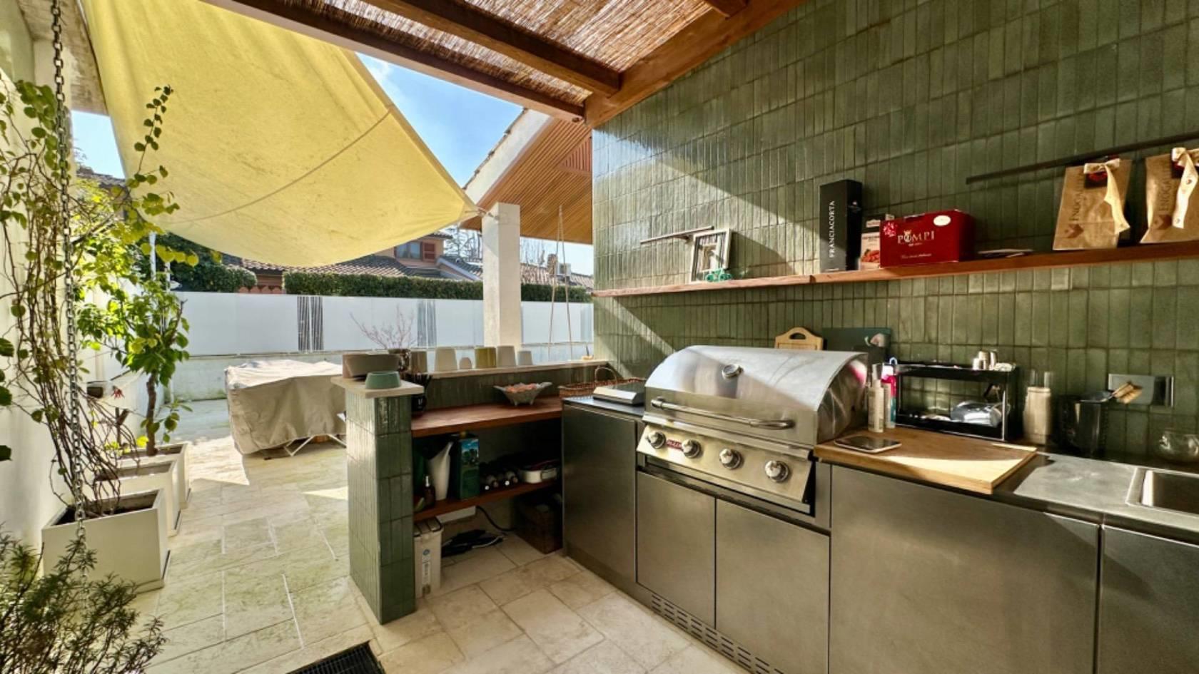Sempre al piano terra, troviamo un elegante bagno per gli ospiti e una cucina vivibile, super attrezzata e pratica nell'uso, strategicamente posizionata accanto al terrazzo esterno anch'esso dotato di cuicna, creando così una continuità tra gli spazi interni ed esterni.