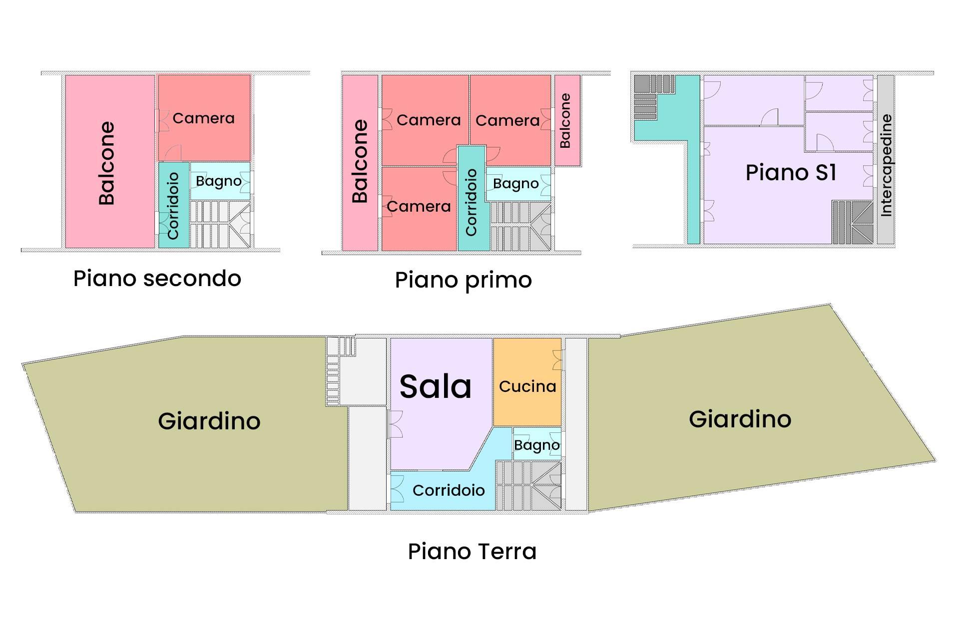 Primo piano: la zona notte è composta da tre camere da letto, tutte di ottima metratura, e un bagno principale. Completano il piano due balconi, accessibili dalle camere, che garantiscono un affaccio esterno e una buona ventilazione naturale.