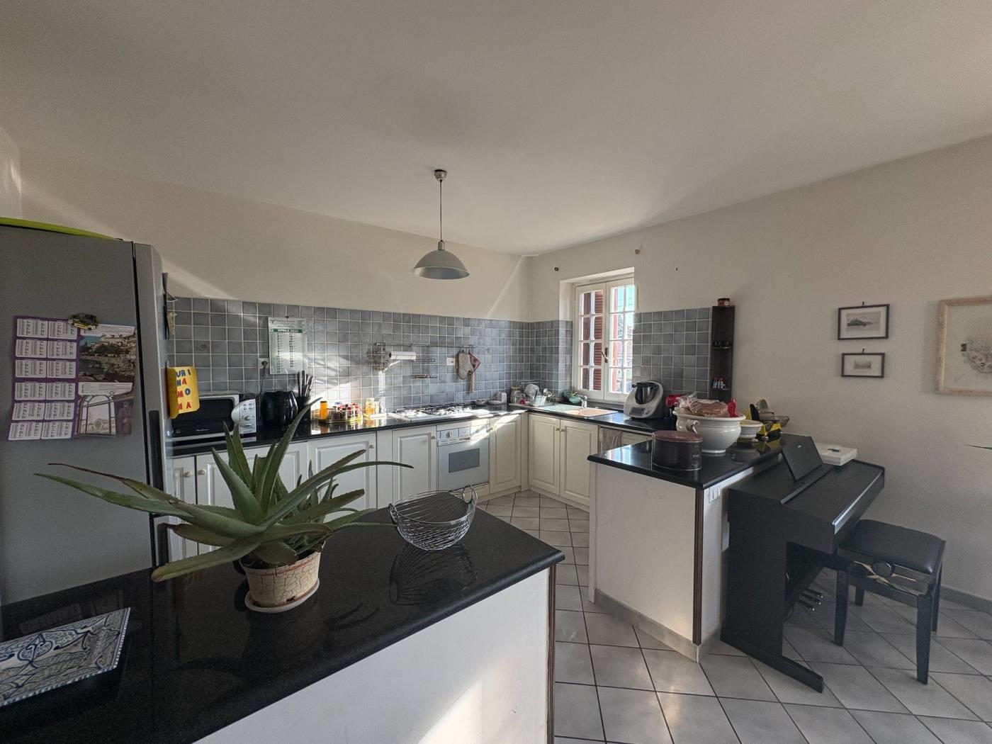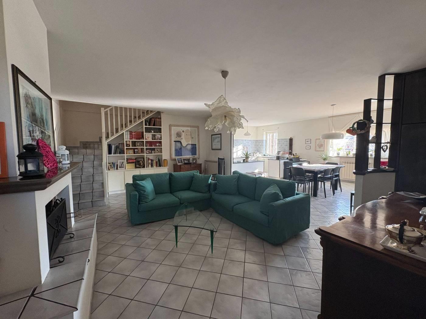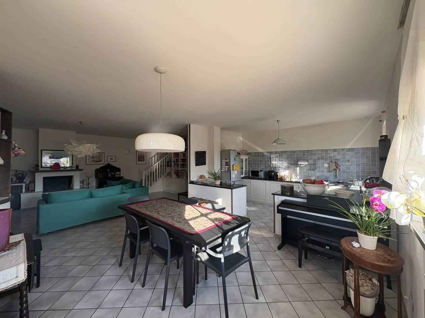 Accogliente salone con camino, zona pranzo e cucina a vista di generose dimensioni, molto luminosa. Completa il piano un bagno con doccia e accesso diretto al portico esterno.