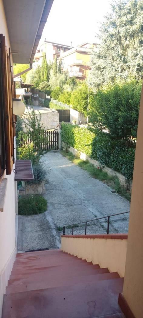 Superato l'ingresso si percorre un vialetto comune che conduce alle scale esterne per raggiungere il piano primo.