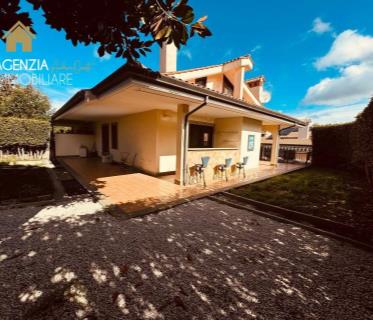 la villa e' ubicata in un complesso residenziale elegante e tranquillo e si presenta in ottimo stato di conservazione. disposta su tre livelli e' composta da una grande sala hobby a cui e ' affiancato il box, piano terra con due sale una cucina abitabile arredata con uscita sul giardino e bagno, piano primo tre camere di cui una con balcone due bagni. le camere arredate con pregiate boiserie sono rifinite in parquet mentre sui soffitti sono presenti dei pregiati affreschi rifinita con materiali e rifiniture di pregio, completamente domotizzata , con impianto di radiodiffusione in tutti i vani della casa, impianto di allarme. il giardino con impianto di illuminazione e angolo barbecue e' adornato da colonne romane e statue mentre un piccolo gazebo e' posizionato davanti la piscina.
