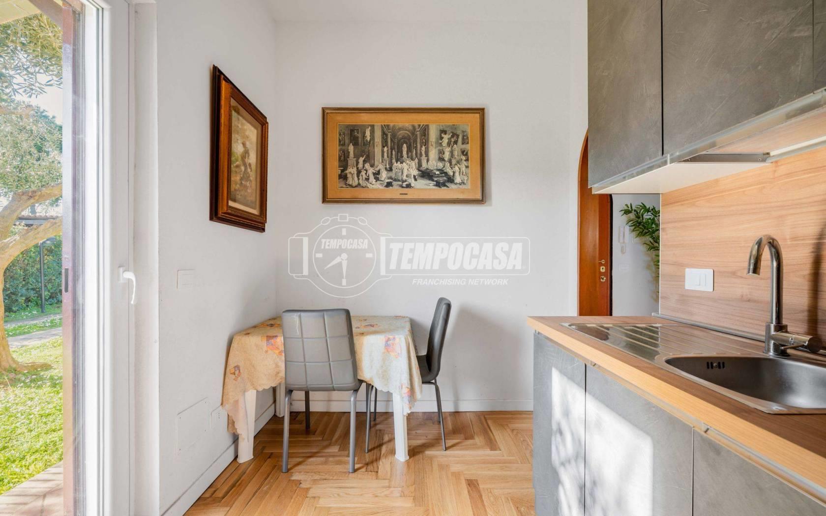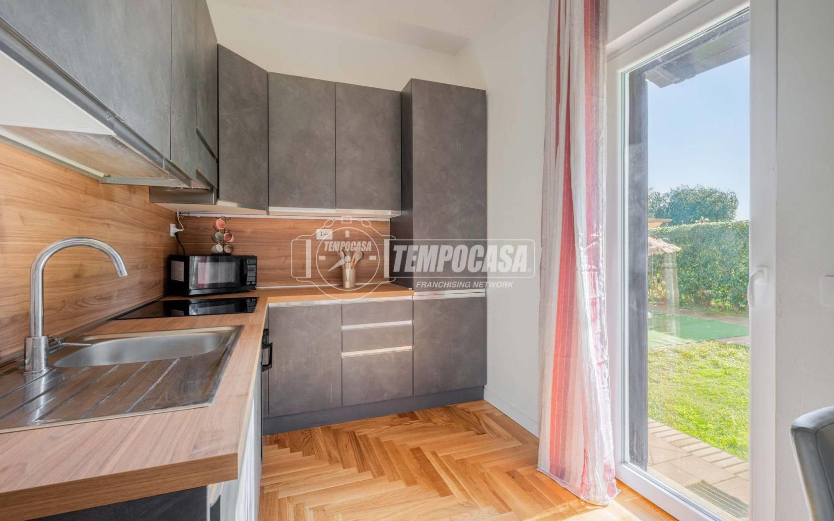 Dal patio si accede all’abitazione tramite porta blindata, entrando in un ampio e luminoso living con doppia esposizione e triplo accesso al giardino grazie alle porte finestre. La cucina semiabitabile, ben organizzata e funzionale, dispone anch’essa di uscita diretta sull’esterno. Completa il piano terra un bagno di servizio finestrato con doccia.
