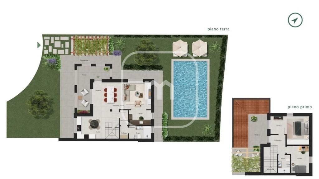 Piano Terra residenziale, composto da soggiorno pranzo, cucina a vista, camera matrimoniale, studio, bagno, portico e giardino. Piano Primo residenziale, due camere da letto, bagno e terrazza.
