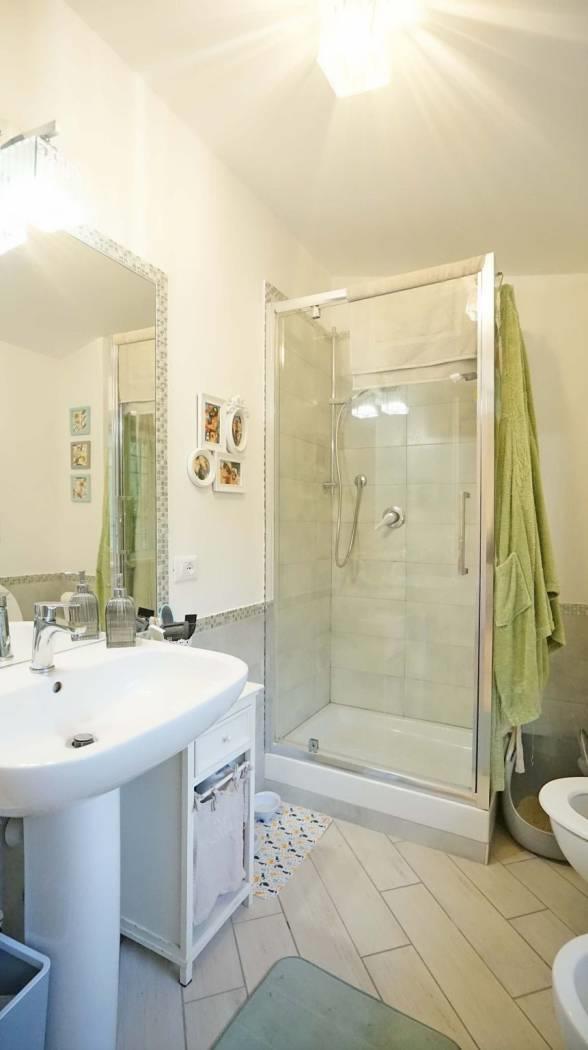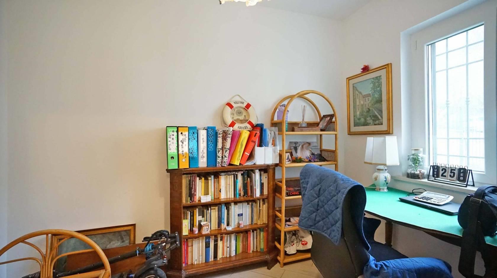 Entrando nell’abitazione dal piano terra, troviamo un salone luminoso e accogliente. Accanto al soggiorno è stato ricavato anche uno studio, perfetto come ambiente di lavoro o come stanza multifunzionale. Completa il livello un bagno di servizio con doccia. Dal salone si accede direttamente al terrazzino che conduce al giardino, permettendo di vivere in continuità gli spazi interni con quelli esterni, soprattutto nelle belle stagioni.