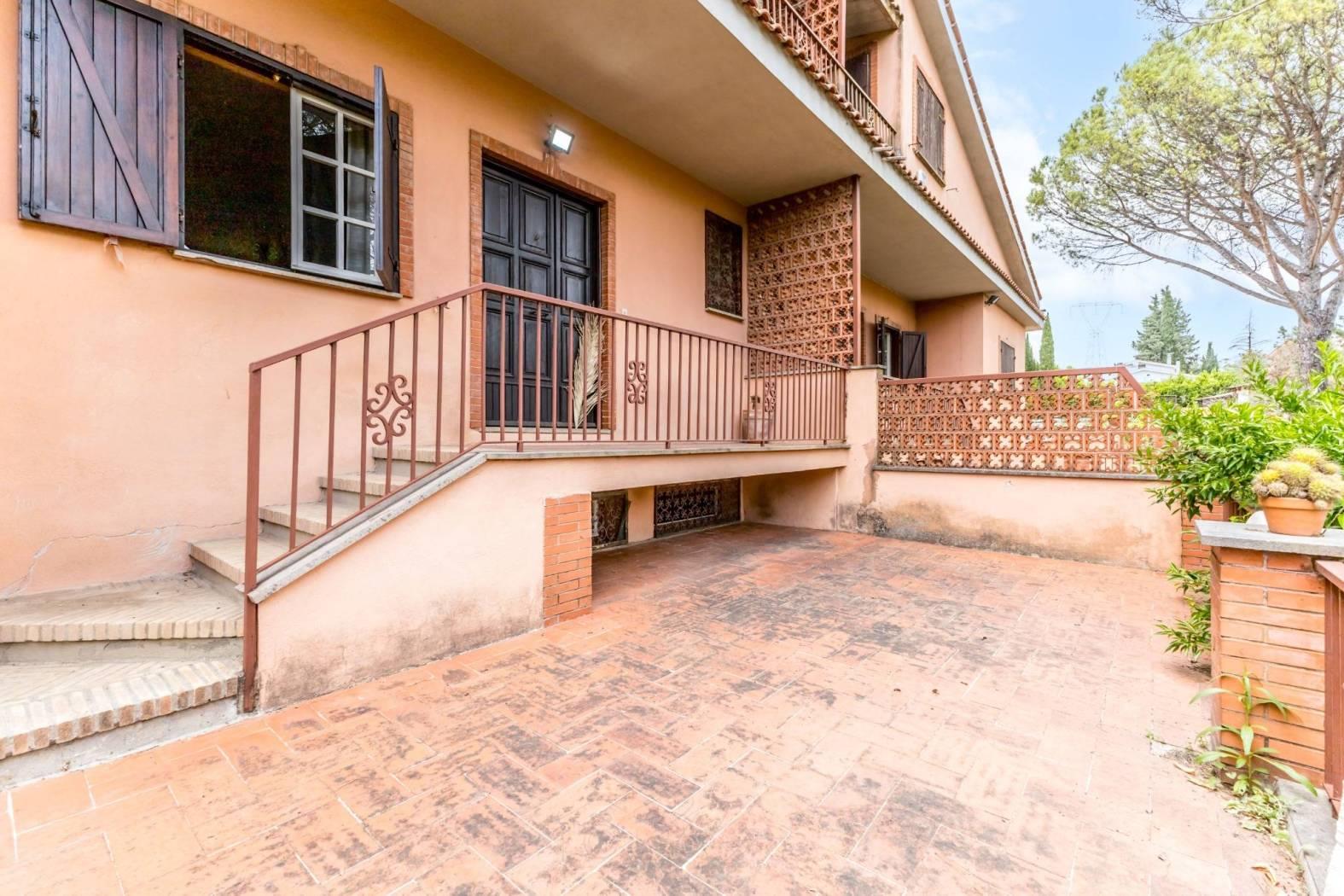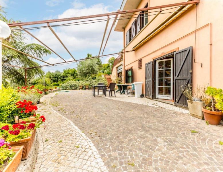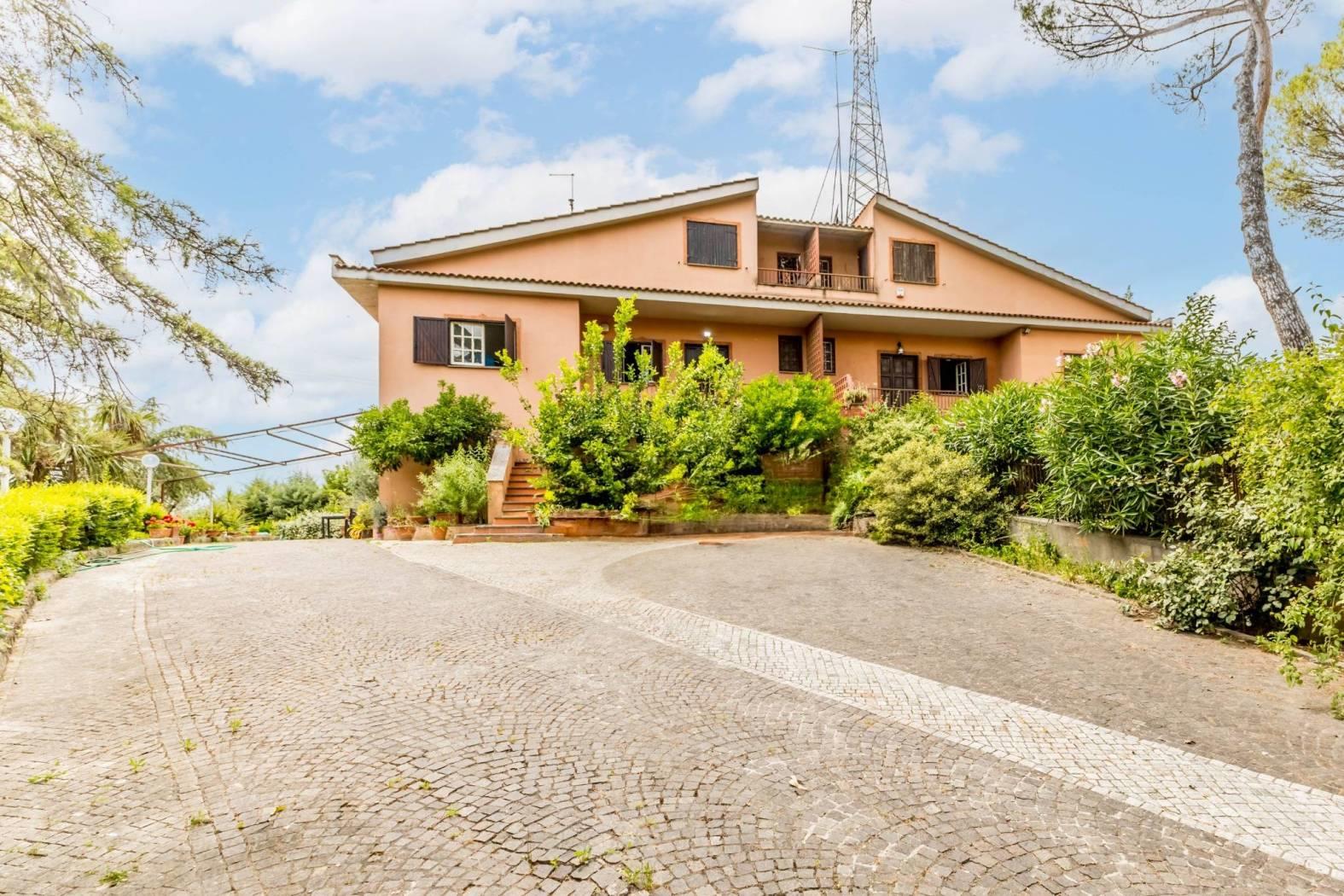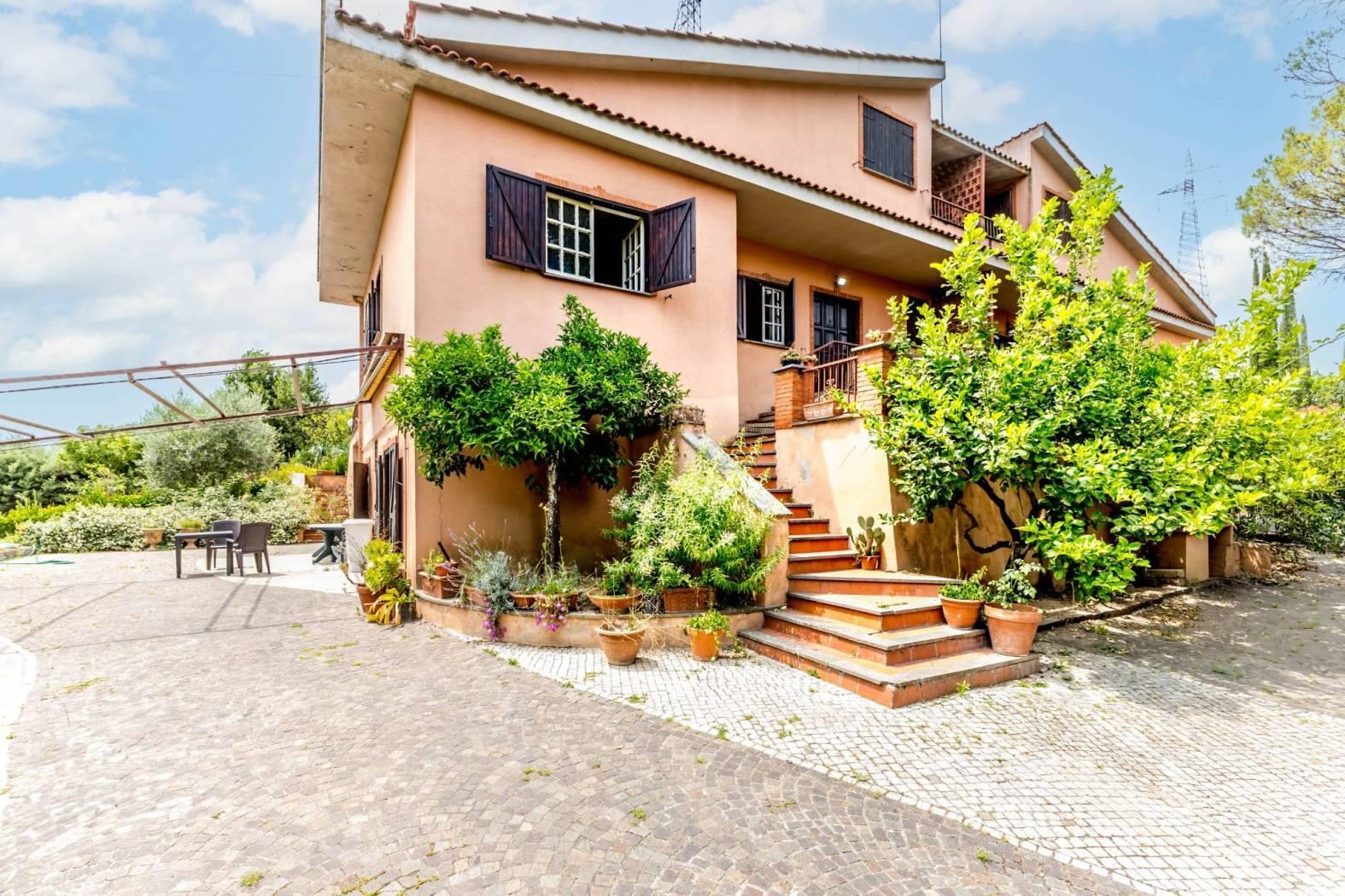 PARCO AZZURRO Via Palombarese Adiacente ingresso di Marco Simone in posizione Panoramica Immersa nel verde Splendida Porzione di Villa Bifamiliare di 260 Mq. c. a. con Entrata Indipendente pedonale e carrabile disposta su 3 piani fuori terra collegati tra loro da scala interna con 3000 Mq. c. a. di Giardino in parte pavimentato per parcheggi auto e un Box auto di 40 Mq. c. a. Possibilità divisibile per 2 nuclei familiari così composta: