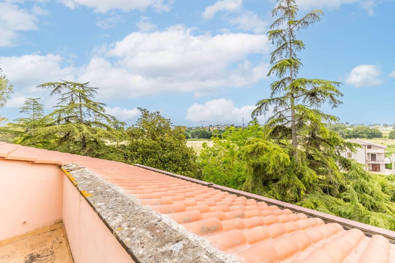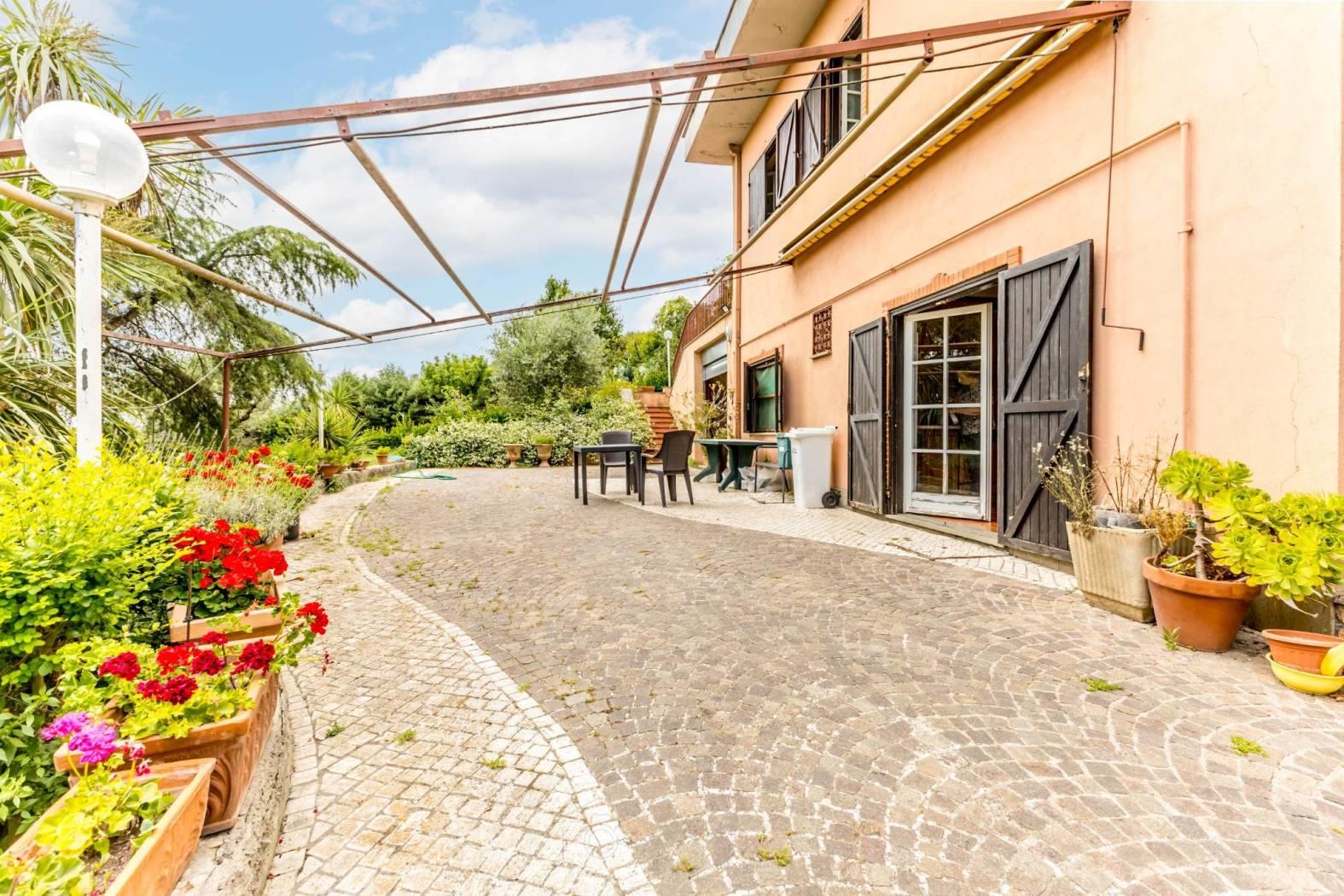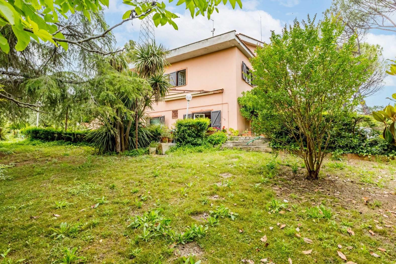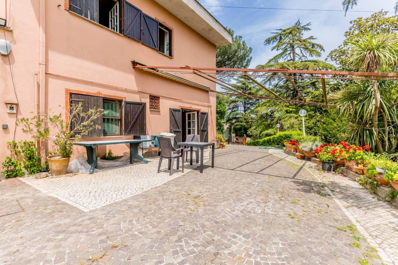 PARCO AZZURRO Via Palombarese Adiacente ingresso di Marco Simone in posizione Panoramica Immersa nel verde Splendida Porzione di Villa Bifamiliare di 260 Mq. c. a. con Entrata Indipendente pedonale e carrabile disposta su 3 piani fuori terra collegati tra loro da scala interna con 3000 Mq. c. a. di Giardino in parte pavimentato per parcheggi auto e un Box auto di 40 Mq. c. a. Possibilità divisibile per 2 nuclei familiari così composta: