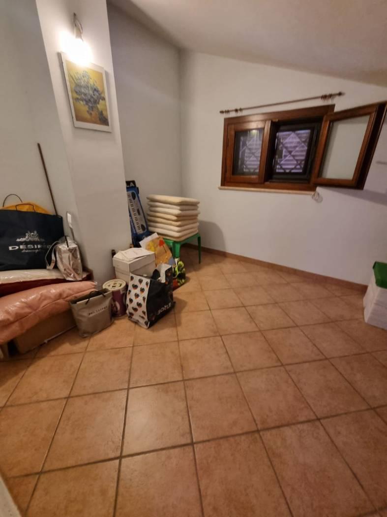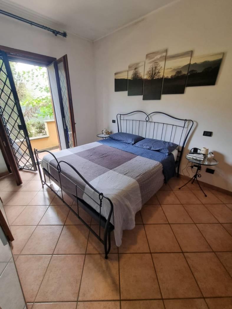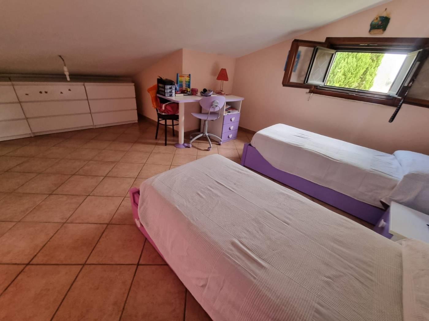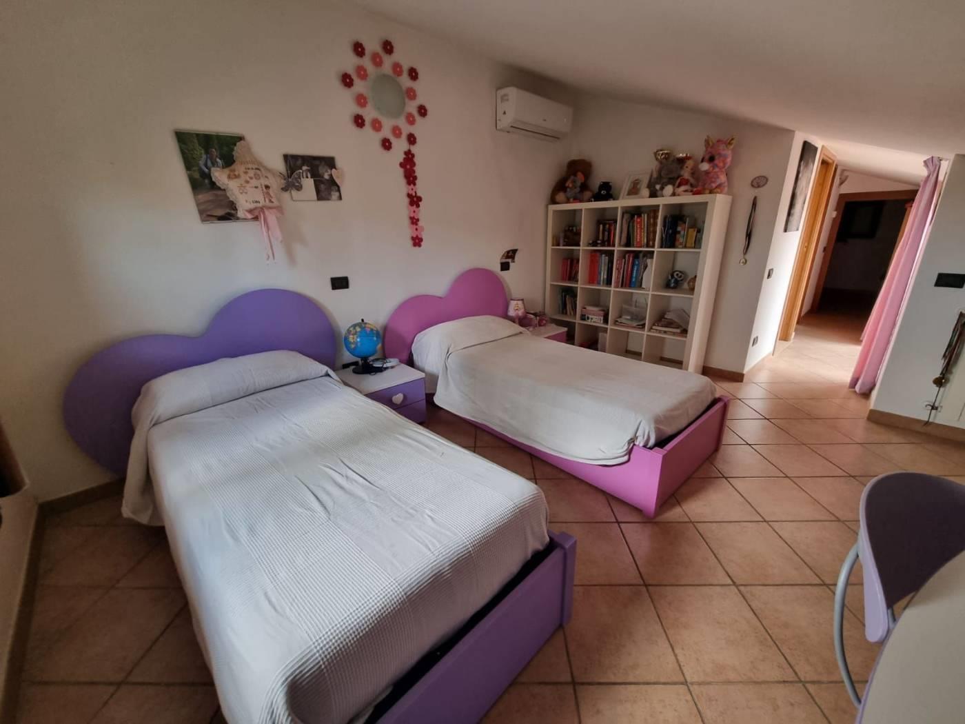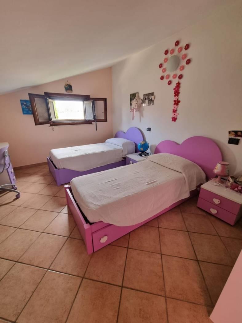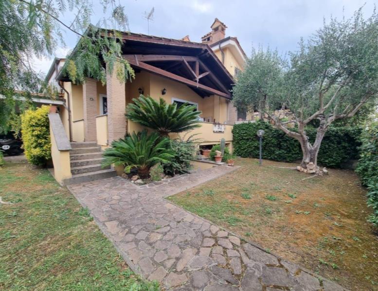 La villa si trova in un tranquillo complesso privato senza condominio e costituisce una parte di una bifamiliare con doppio ingresso. Al piano rialzato, si trovano un ampio salone, una cucina abitabile, una camera, una cameretta, un bagno e un patio angolare. Al piano mansardato, vi sono una ulteriore camera, una cameretta, un bagno e un piccolo solarium. Il piano semi-interrato, accessibile sia dall'esterno che dall'interno, attualmente ospita un ampio salone triplo con cucina a vista, soggiorno, bagno e un terrazzino privato; facilmente trasformabile in una camera e uno studio. Gli infissi sono in legno naturale con vetro doppio, zanzariere e inferriate. Completano la proprietà un giardino curato con varie piante. L'accesso alla proprietà avviene tramite un vialetto pedonale e un viale carrabile con cancello automatico.