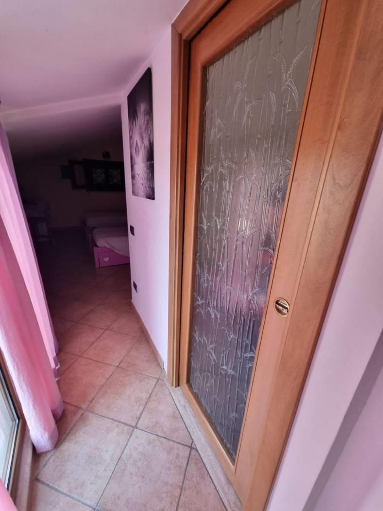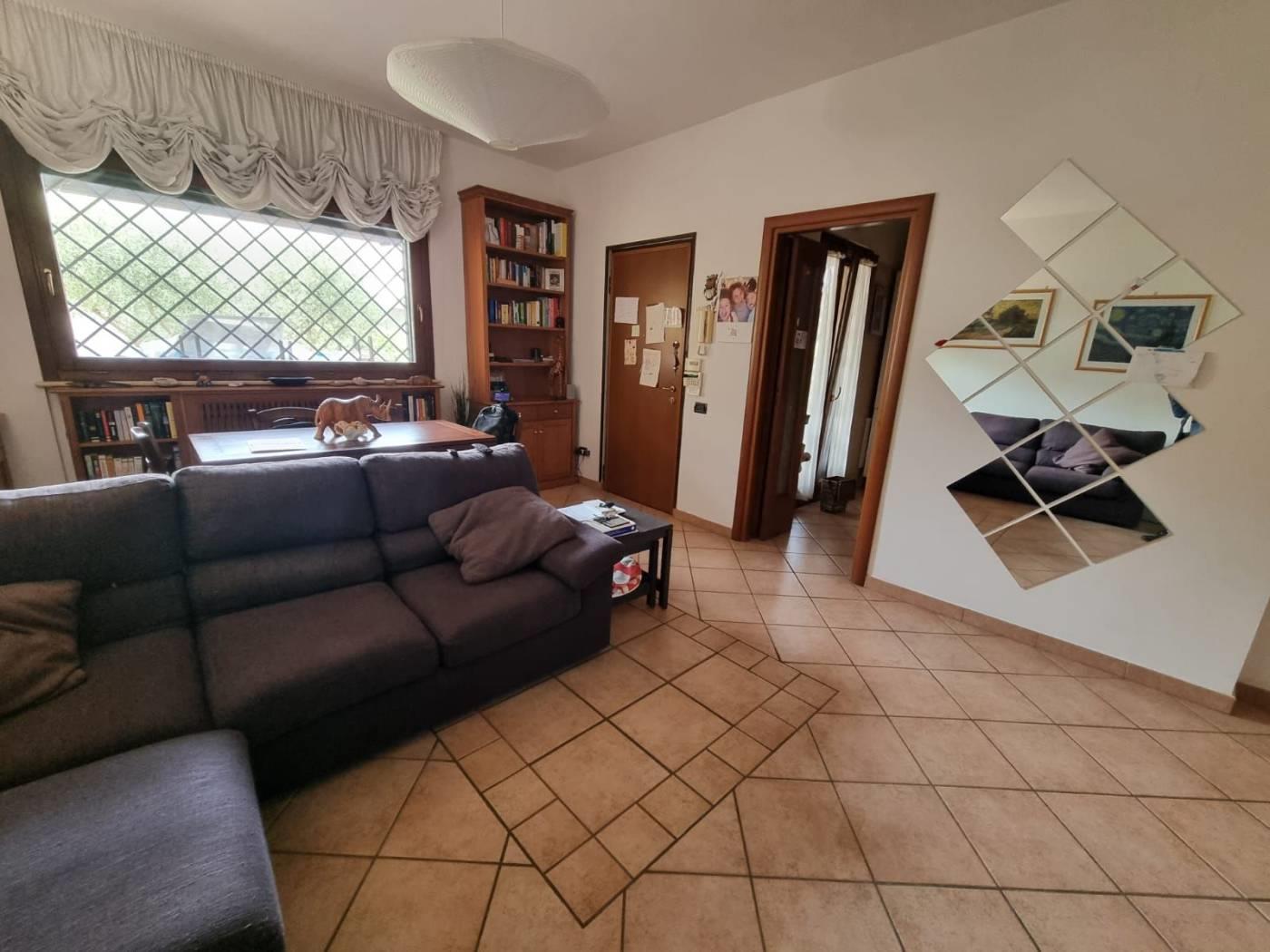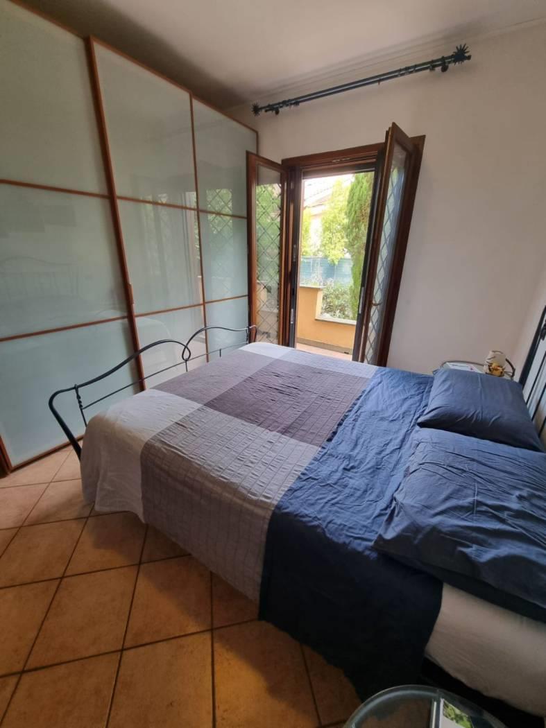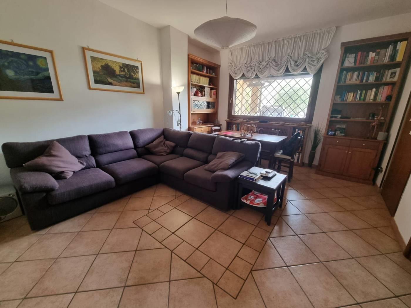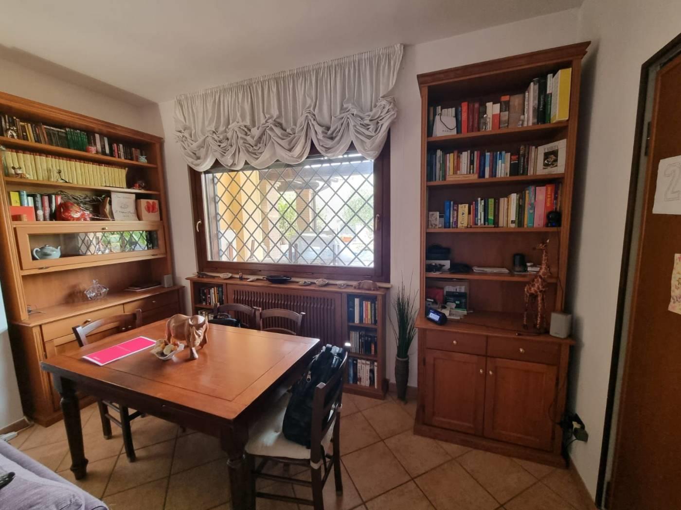 La villa si trova in un tranquillo complesso privato senza condominio e costituisce una parte di una bifamiliare con doppio ingresso. Al piano rialzato, si trovano un ampio salone, una cucina abitabile, una camera, una cameretta, un bagno e un patio angolare. Al piano mansardato, vi sono una ulteriore camera, una cameretta, un bagno e un piccolo solarium. Il piano semi-interrato, accessibile sia dall'esterno che dall'interno, attualmente ospita un ampio salone triplo con cucina a vista, soggiorno, bagno e un terrazzino privato; facilmente trasformabile in una camera e uno studio. Gli infissi sono in legno naturale con vetro doppio, zanzariere e inferriate. Completano la proprietà un giardino curato con varie piante. L'accesso alla proprietà avviene tramite un vialetto pedonale e un viale carrabile con cancello automatico.
