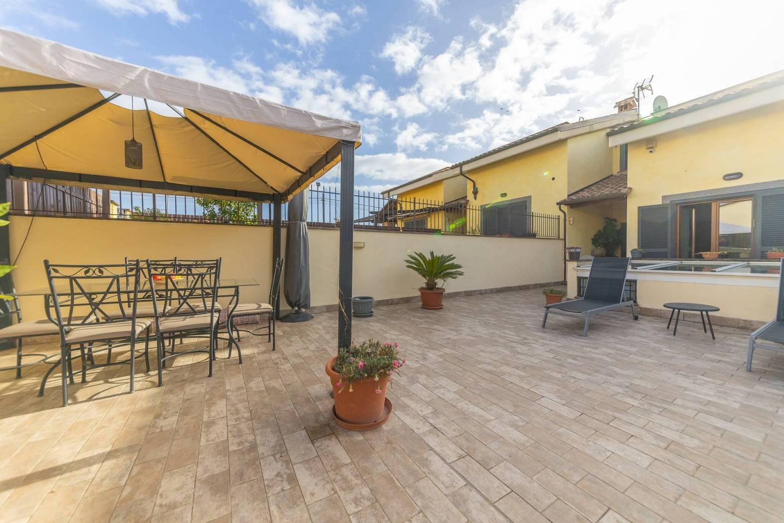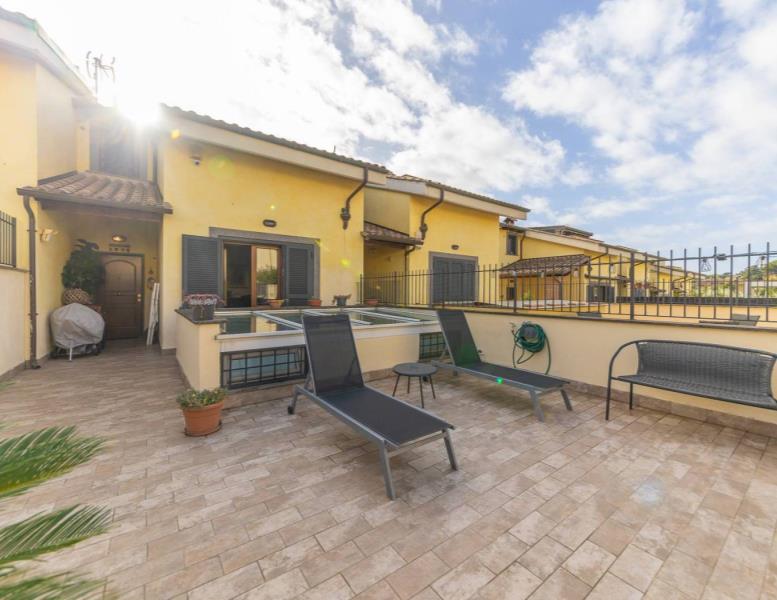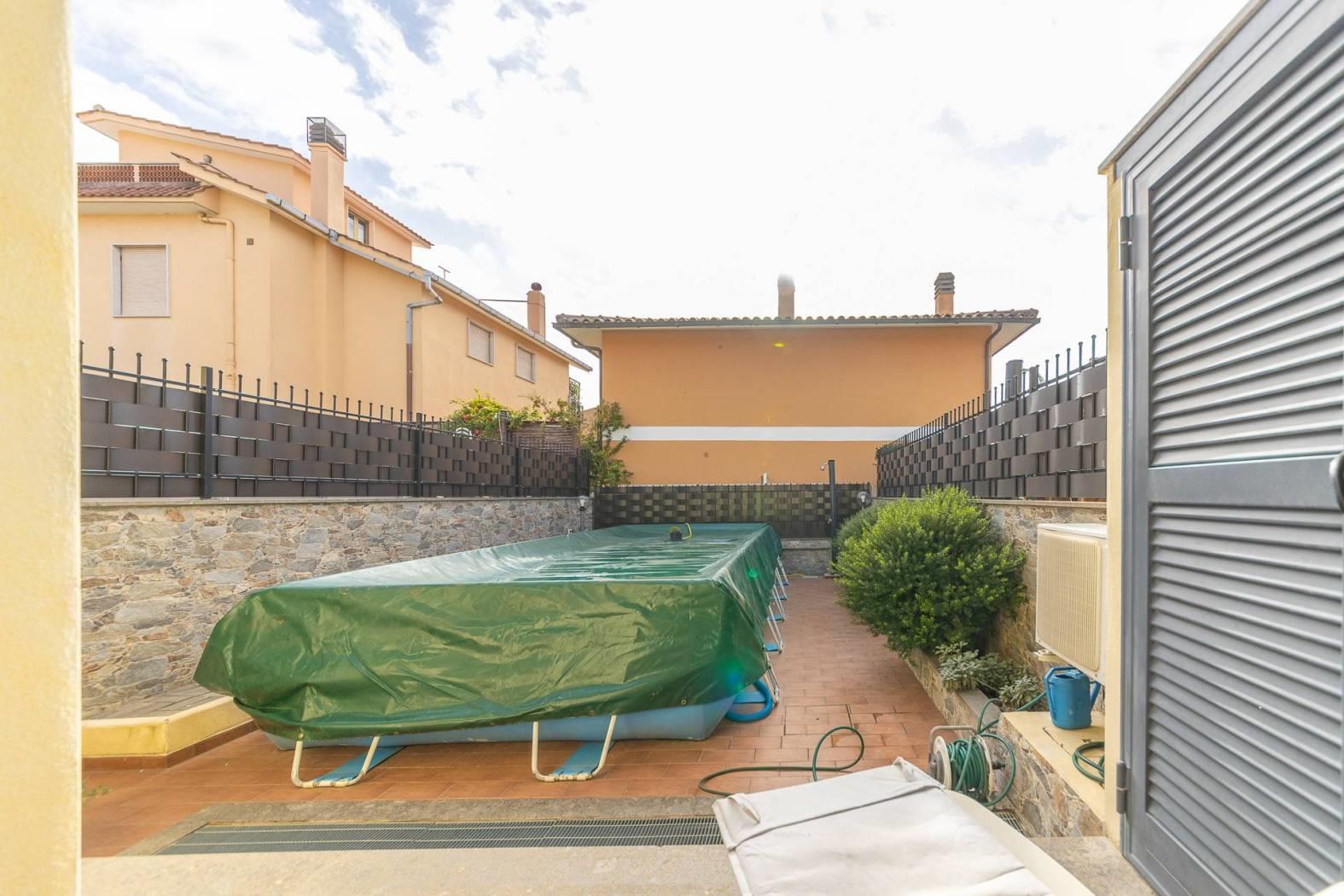 Rif: 1374 - Immobiliare Simonetti - In contesto residenziale nelle immediate vicinanze di Via Tuscolana ed a pochi distanza dal rinomato paese di Frascati, L'Immobiliare Simonetti è lieta di proporre la vendita di una graziosa villa in Via Giuseppe Luzi, zona Frascati. La soluzione è all'interno di un piccolo residence con entrata indipendente e si estende per una superfice interna di circa 180 mq su tre piani totali e giardino. Tramite cancello pedonale si accede ad una corte esterna di circa 70 mq attualmente arricchita di gazebo e contornata con una curata siepe. Entrando nella villa veniamo accolti nell'ingresso che precede l'accesso alle due camere da letto, entrambe molto ampie, ed in una delle due, troviamo una porta finestra che permette l'uscita nel giardino posteriore, in cui è stata inserita una piscina rimovibile. Nello stesso piano abbiamo anche un comodo bagno finestrato con doccia. Salendo, tramite scala di legno, troviamo due camere leggermente mansardate, una delle quali con terrazzo annesso. La villa si completa con il piano inferiore in cui è stata collocata una estesa zona giorno, caratterizzata in parte da soffitto a cavedio, rendendola molto luminosa, in cui è stato collocato l'angolo cottura ed un confortevole camino. La proprietà si completa con una zona lavanderia ed un box auto singolo. Nel comprensorio condominiale sono stati assegnati due posti auto esterni. Tutte le informazioni, foto e planimetrie contenute nel presente annuncio pubblicitario non costituiscono elemento contrattuale: potrebbero non rispecchiare fedelmente lo stato di fatto dell'immobile e andranno verificate prima di formulare la proposta di acquisto. L'agenzia immobiliare non risponde di eventuali discordanze. Le immagini o foto in pubblicità sono inserite a scopo illustrativo non costituiscono elemento contrattuale. Rif: 1374. Immobiliare Simonetti.