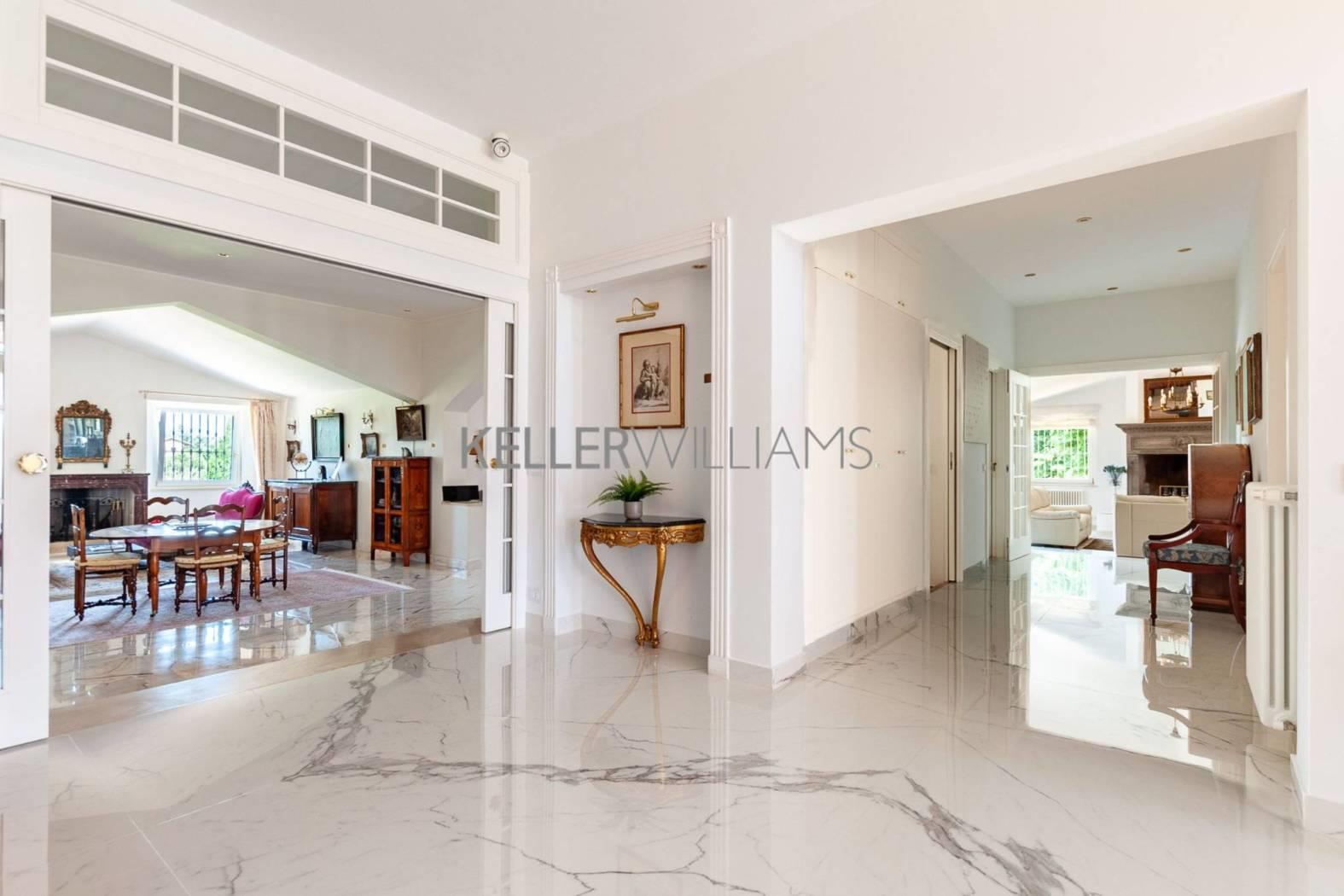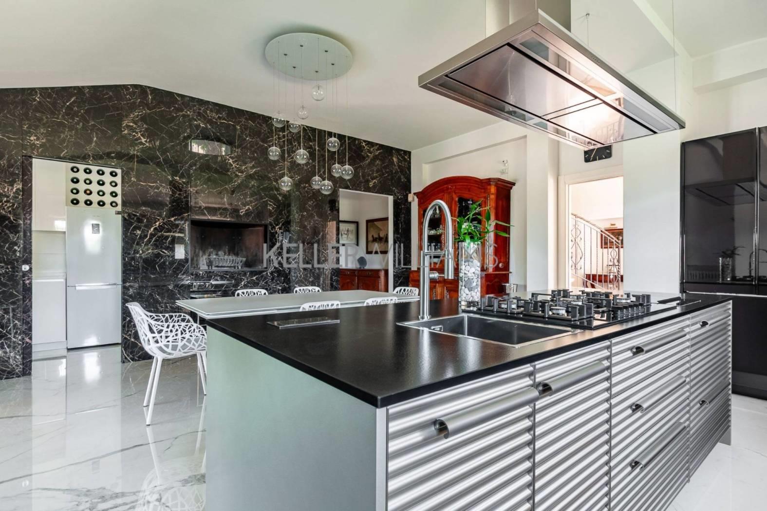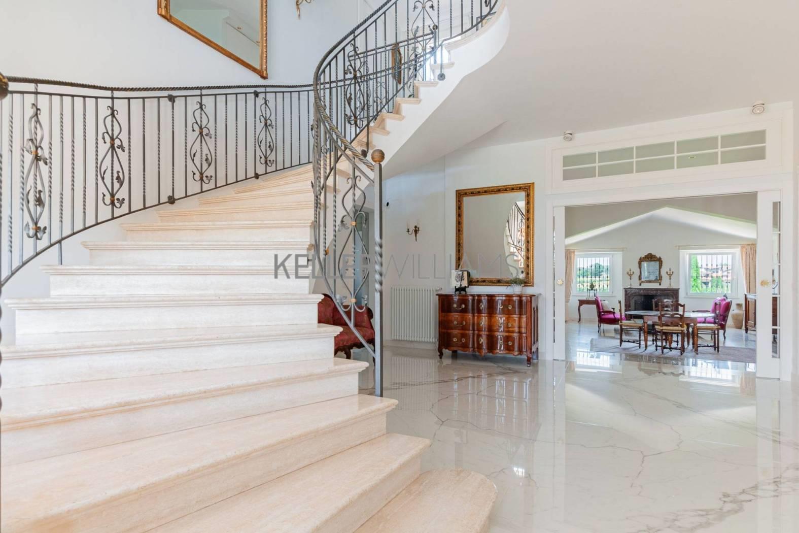Gli interni sono pensati per la luce e la fluidità degli spazi. Al piano principale, tre saloni comunicanti e uno studio raffinato si aprono attraverso eleganti vetrate che fondono interno ed esterno in un unico respiro. La cucina su misura, realizzata in titanio, si affaccia su un portico ombreggiato con forno a legna: un invito naturale a cene all’aperto e momenti conviviali. Completano il piano una camera per gli ospiti e due bagni per gli ospiti, curati nei dettagli e nello stile. Una scenografica scala in marmo di carrara conduce al piano superiore, dove si trovano tre camere matrimoniali. La suite principale dispone di bagno privato, mentre le altre due camere condividono un luminoso e raffinato bagno. Il livello inferiore ospita un’ampia sala dedicata all’intrattenimento o agli hobby, una cantina climatizzata per i vini, locali di servizio e un grande garage.