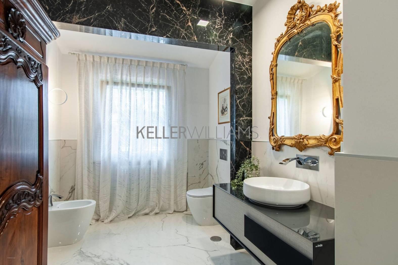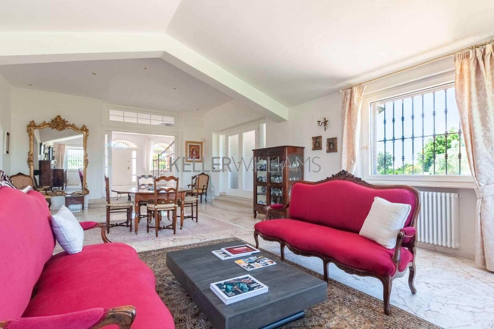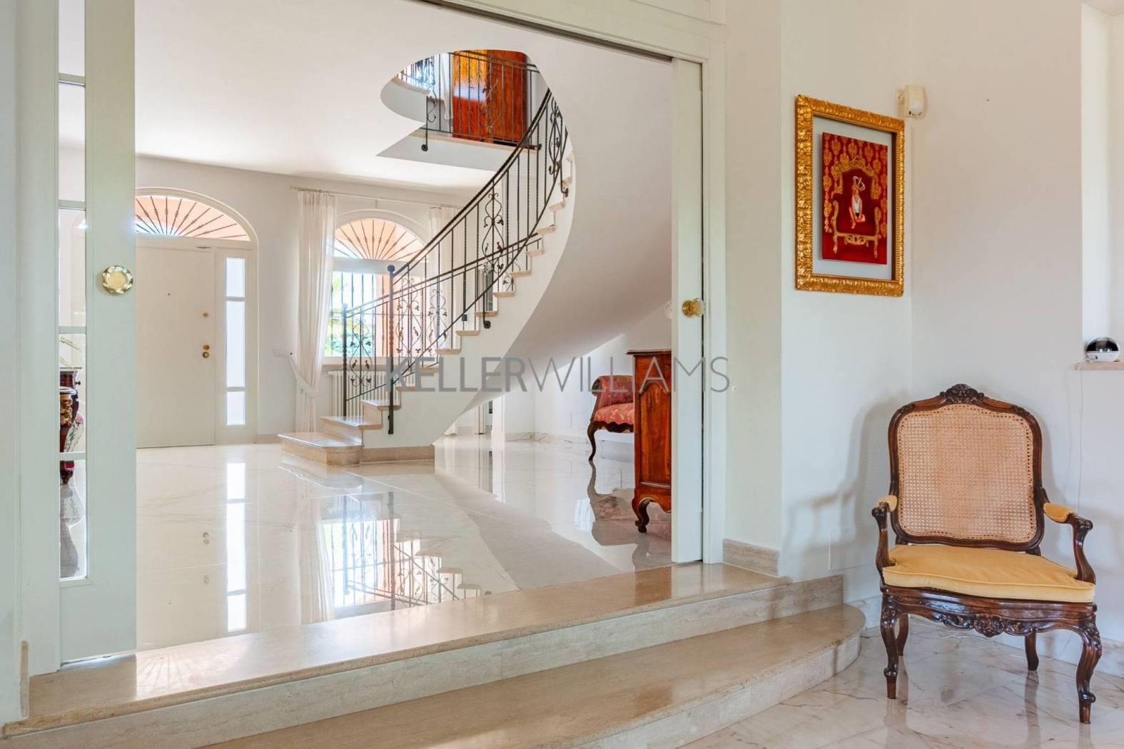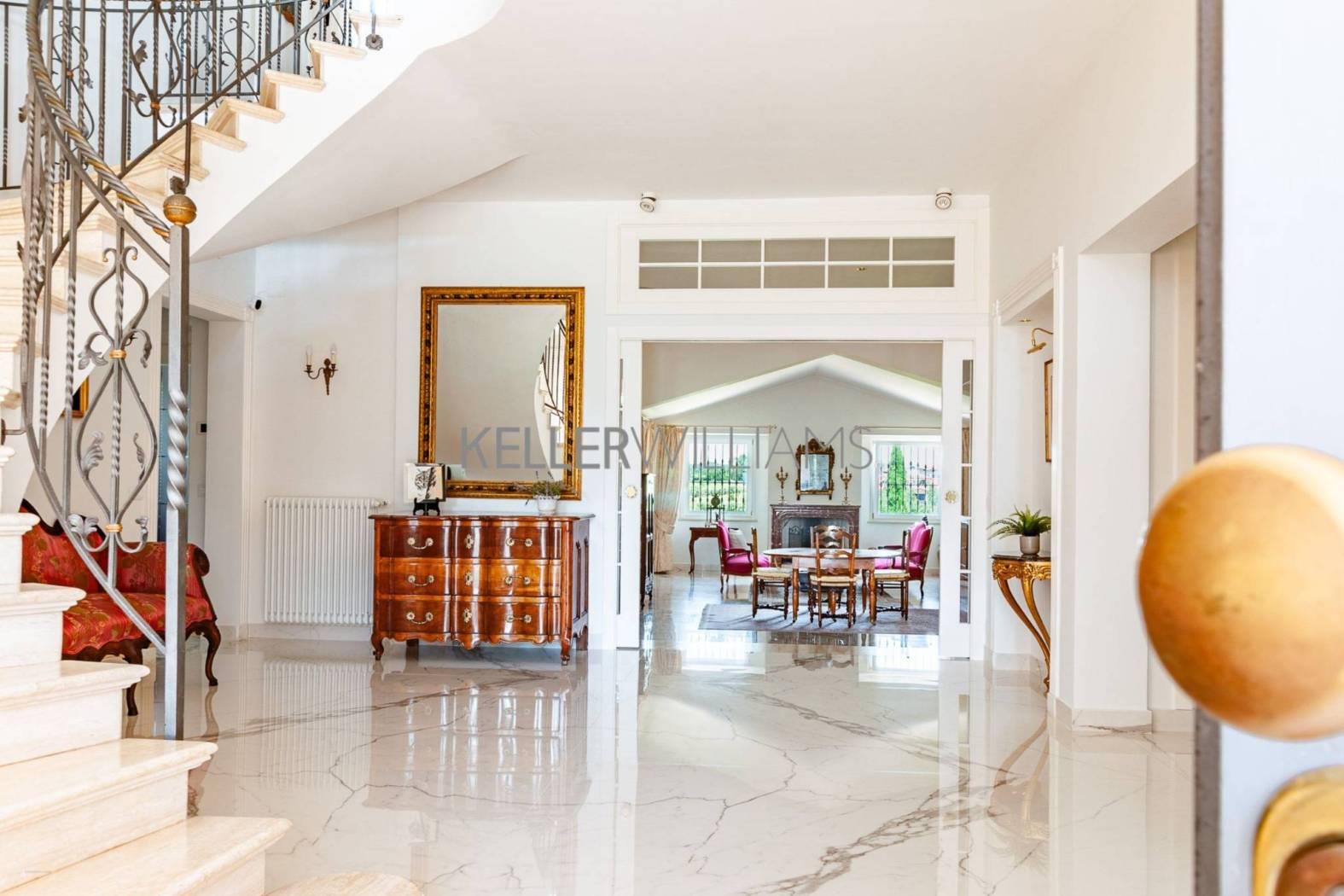 Gli interni sono pensati per la luce e la fluidità degli spazi. Al piano principale, tre saloni comunicanti e uno studio raffinato si aprono attraverso eleganti vetrate che fondono interno ed esterno in un unico respiro. La cucina su misura, realizzata in titanio, si affaccia su un portico ombreggiato con forno a legna: un invito naturale a cene all’aperto e momenti conviviali. Completano il piano una camera per gli ospiti e due bagni per gli ospiti, curati nei dettagli e nello stile. Una scenografica scala in marmo di carrara conduce al piano superiore, dove si trovano tre camere matrimoniali. La suite principale dispone di bagno privato, mentre le altre due camere condividono un luminoso e raffinato bagno. Il livello inferiore ospita un’ampia sala dedicata all’intrattenimento o agli hobby, una cantina climatizzata per i vini, locali di servizio e un grande garage.