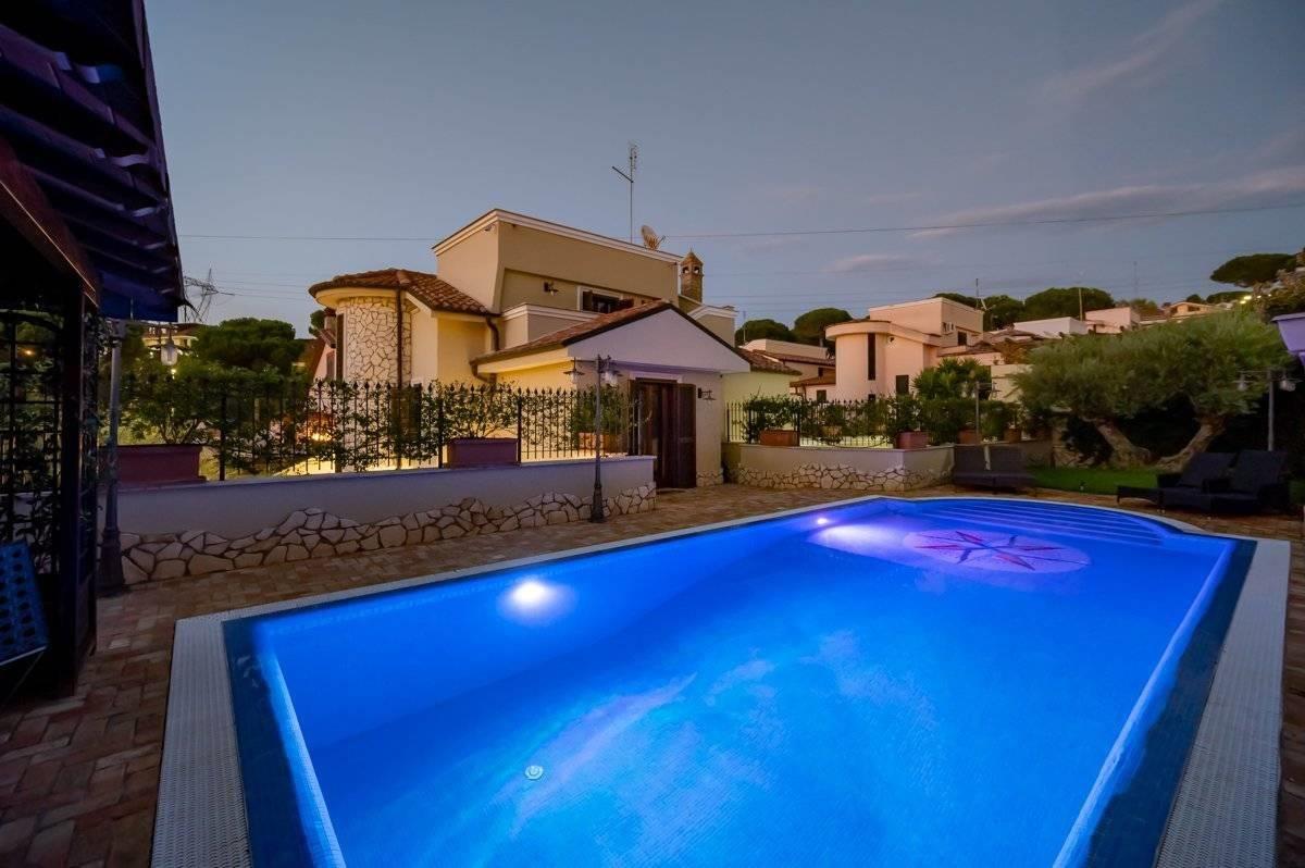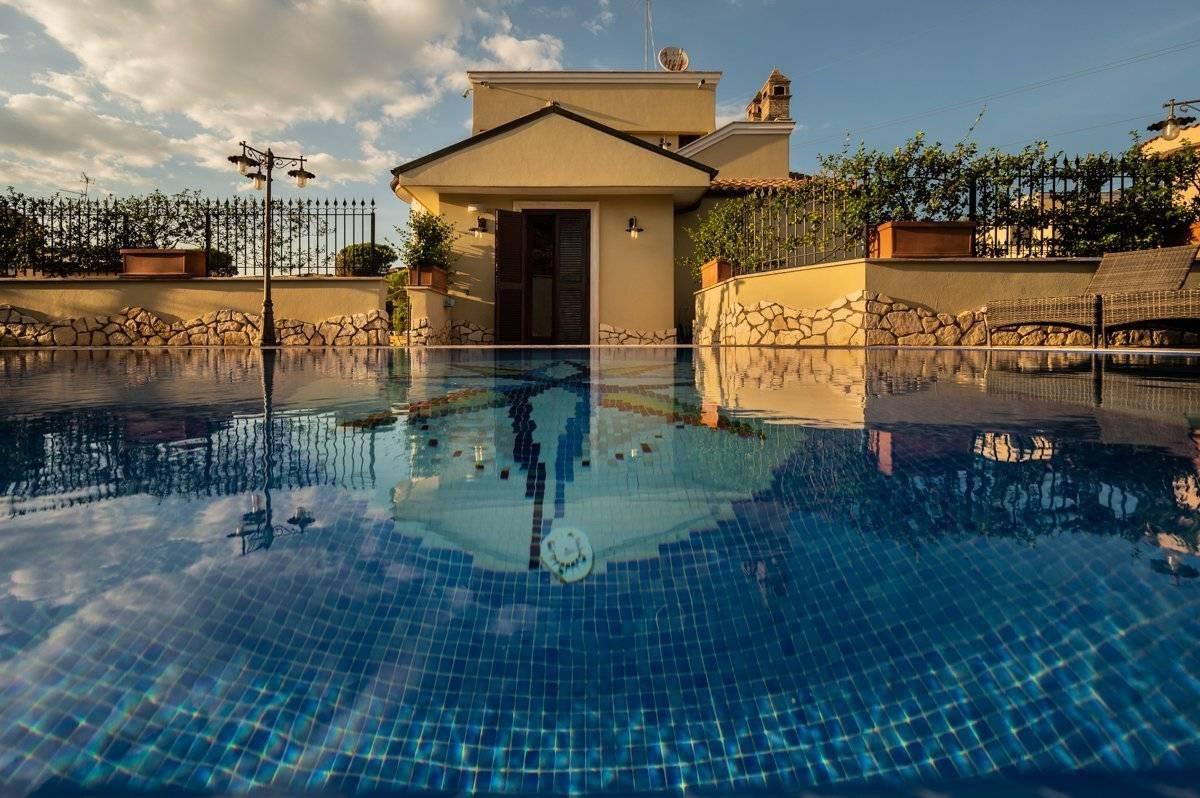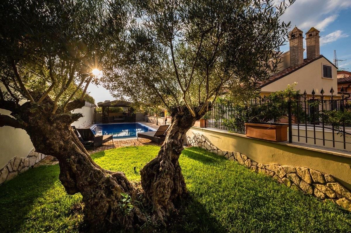 Presentiamo per la vendita una villa unifamiliare ubicata Colleverde di Guidonia Montecelio, a poca distanza dal Marco Simone Golf Club, unica per confort e rifiniture. La villa è disposta su tre livelli, misura circa 350 mq. a cui si aggiungono circa 45 mq di abitazione di servizio e 500 mq di corte. Si accede alla proprietà attraverso un viale privato che conduce alla porta di ingresso. Dall’ingresso si disimpegna un salone doppio con camino, una grande sala da pranzo ed una enorme cucina completamente arredata ed attrezzata. Dalla cucina e dalla sala da pranzo si accede ad un ampio spazio aperto dotato di isola attrezzata con lavello e cucina da esterno, un forno, il barbecue a legna ed a gas. Allo stesso piano si trova una confortevole SPA, un bagno per gli ospiti e l’elegante scala che porta ai piani superiori.