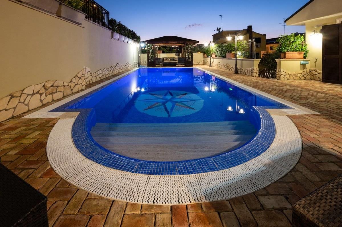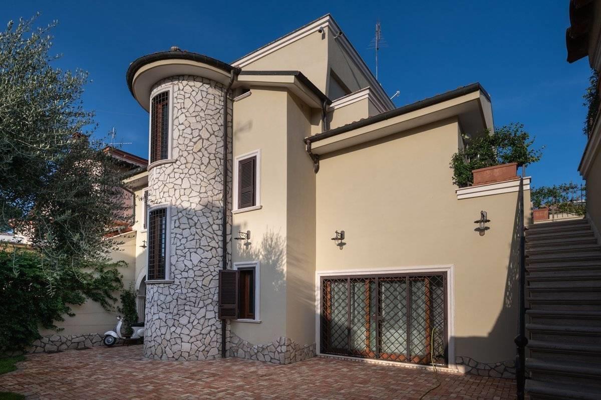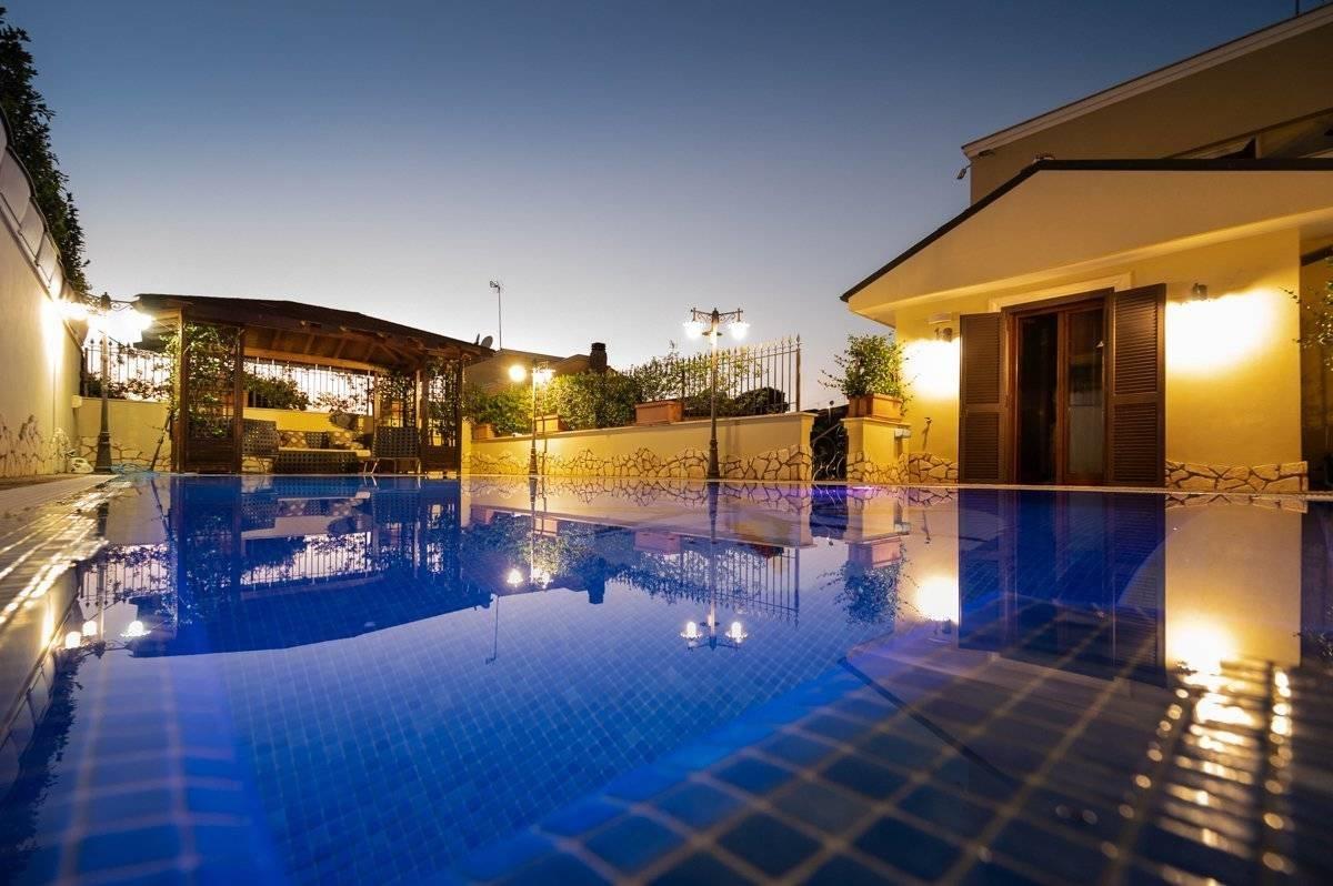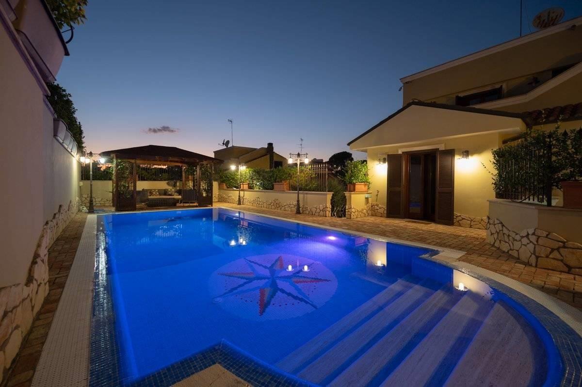 Presentiamo per la vendita una villa unifamiliare ubicata Colleverde di Guidonia Montecelio, a poca distanza dal Marco Simone Golf Club, unica per confort e rifiniture. La villa è disposta su tre livelli, misura circa 350 mq. a cui si aggiungono circa 45 mq di abitazione di servizio e 500 mq di corte. Si accede alla proprietà attraverso un viale privato che conduce alla porta di ingresso. Dall’ingresso si disimpegna un salone doppio con camino, una grande sala da pranzo ed una enorme cucina completamente arredata ed attrezzata. Dalla cucina e dalla sala da pranzo si accede ad un ampio spazio aperto dotato di isola attrezzata con lavello e cucina da esterno, un forno, il barbecue a legna ed a gas. Allo stesso piano si trova una confortevole SPA, un bagno per gli ospiti e l’elegante scala che porta ai piani superiori.