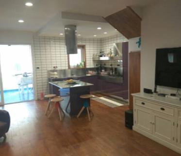 Il piano terra è composto da soggiorno con camino, cucina e bagno. Il soggiorno si affaccia su di un portico che a sua volta si allarga in un piccolo giardino privato. La cucina si affaccia su di un angolo laterale del giardino, con barbecue.
