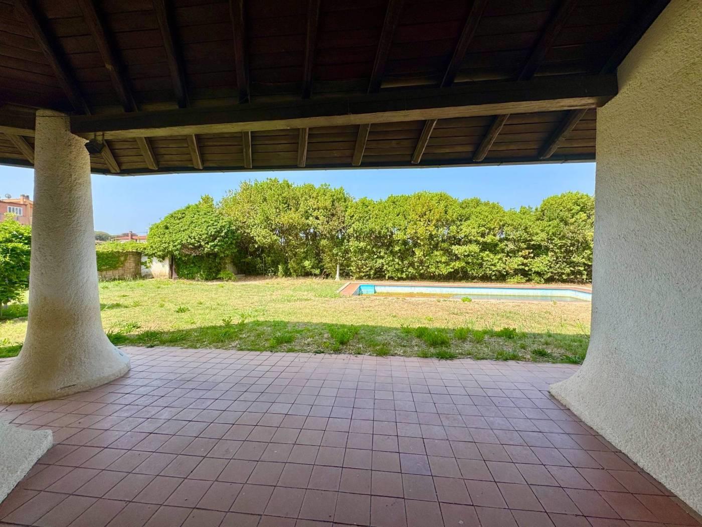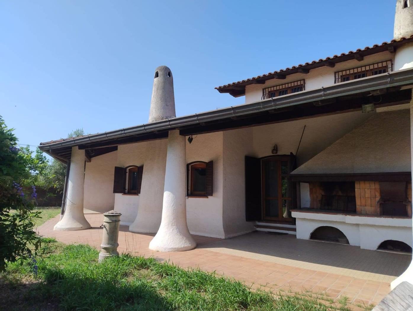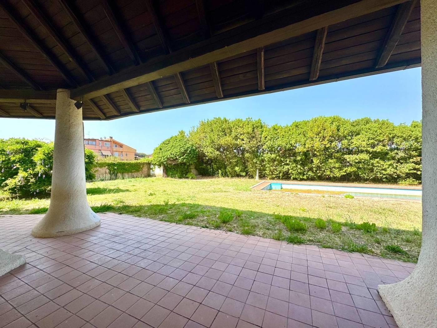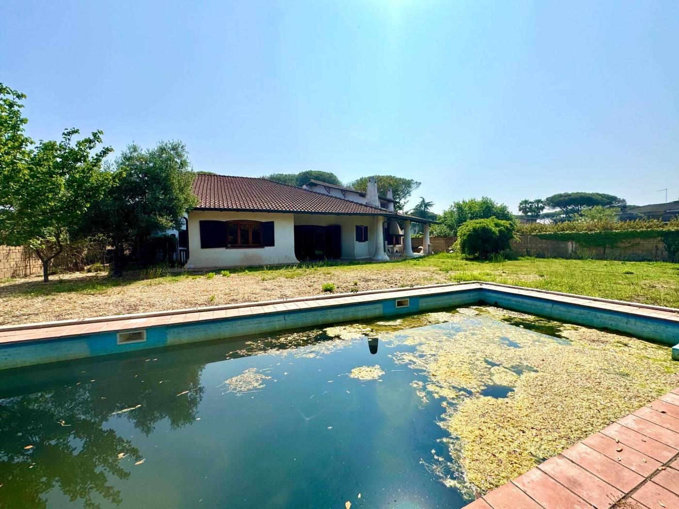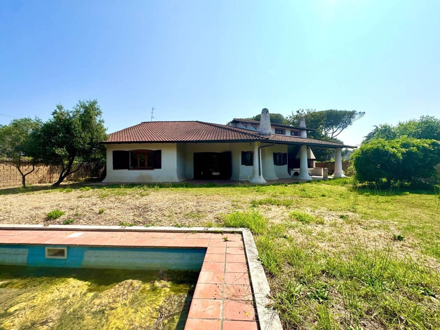 Madonnetta adiacente, a tutti i servizi della zona, ed anche a tutti quelli di Casalpalocco e dell'Axa, più precisamente in via Archippo proponiamo villa unifamiliare su due livelli per circa 330 mq cosi suddivisa: Al piano terra ingresso, salone doppio con camino, cucina tinello, sala da pranzo, tre camere matrimoniali, doppi servizi, locale tecnico, un box auto e un patio con forno e barbecue, al primo piano troviamo tre camere da letto, due bagni, cabina armadi e ripostigli sottotetto. L'unico ambiente nel piano seminterrato è una cantina collegata alla villa da una scala a rampata dritta. Completa la proprietà un giardino perimetrale di circa 1500 mq con una piscina regolare di circa 50 mq ed un' altro box utilizzato come magazzino manutenzione. L'immobile è originale con soffitti a travi a vista, ci sono gli infissi in douglas e tutte le relative grate di sicurezza, l'esposizione ottima, est, sud ovest. Riscaldamento autonomo, aria condizionata.