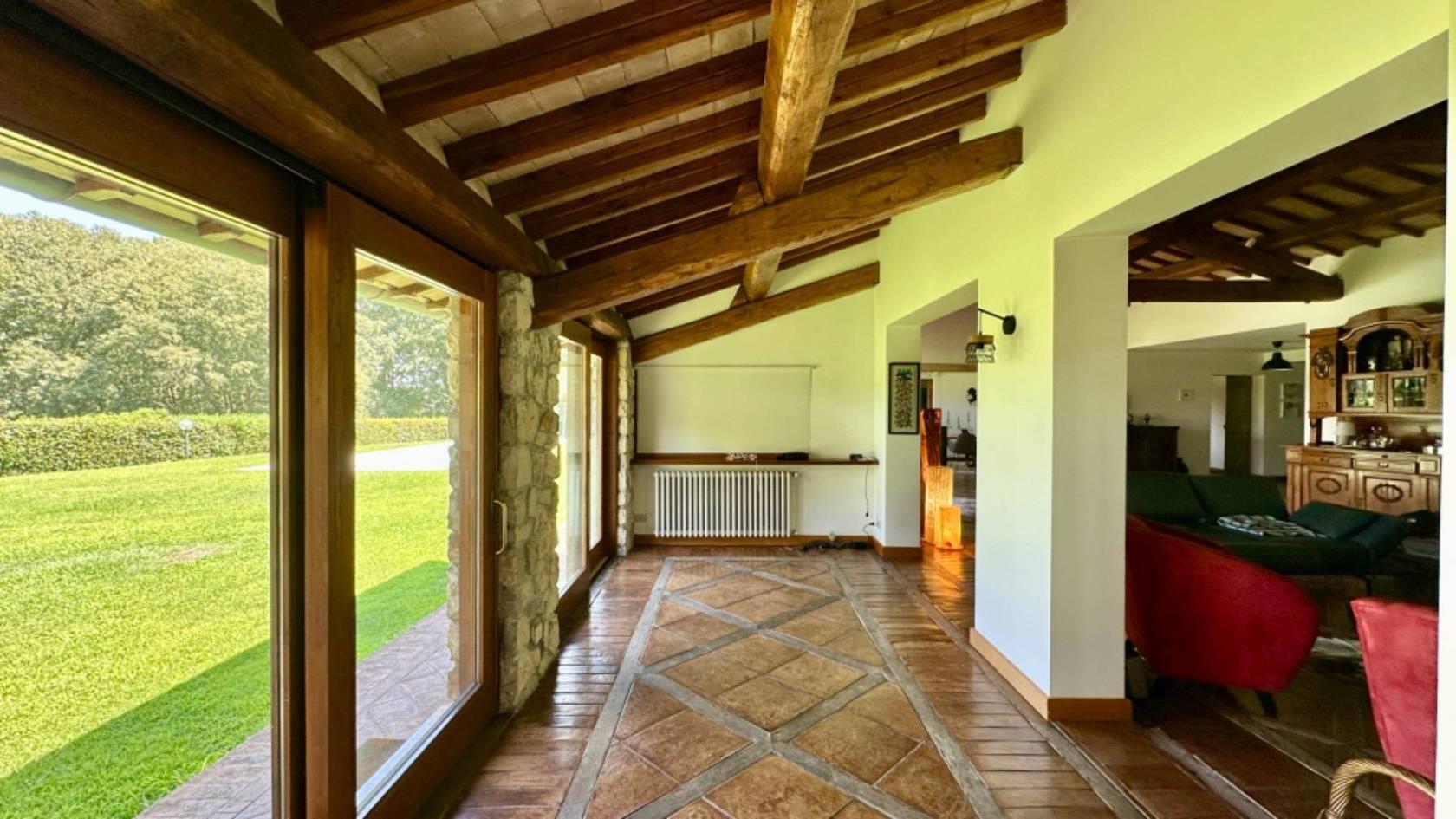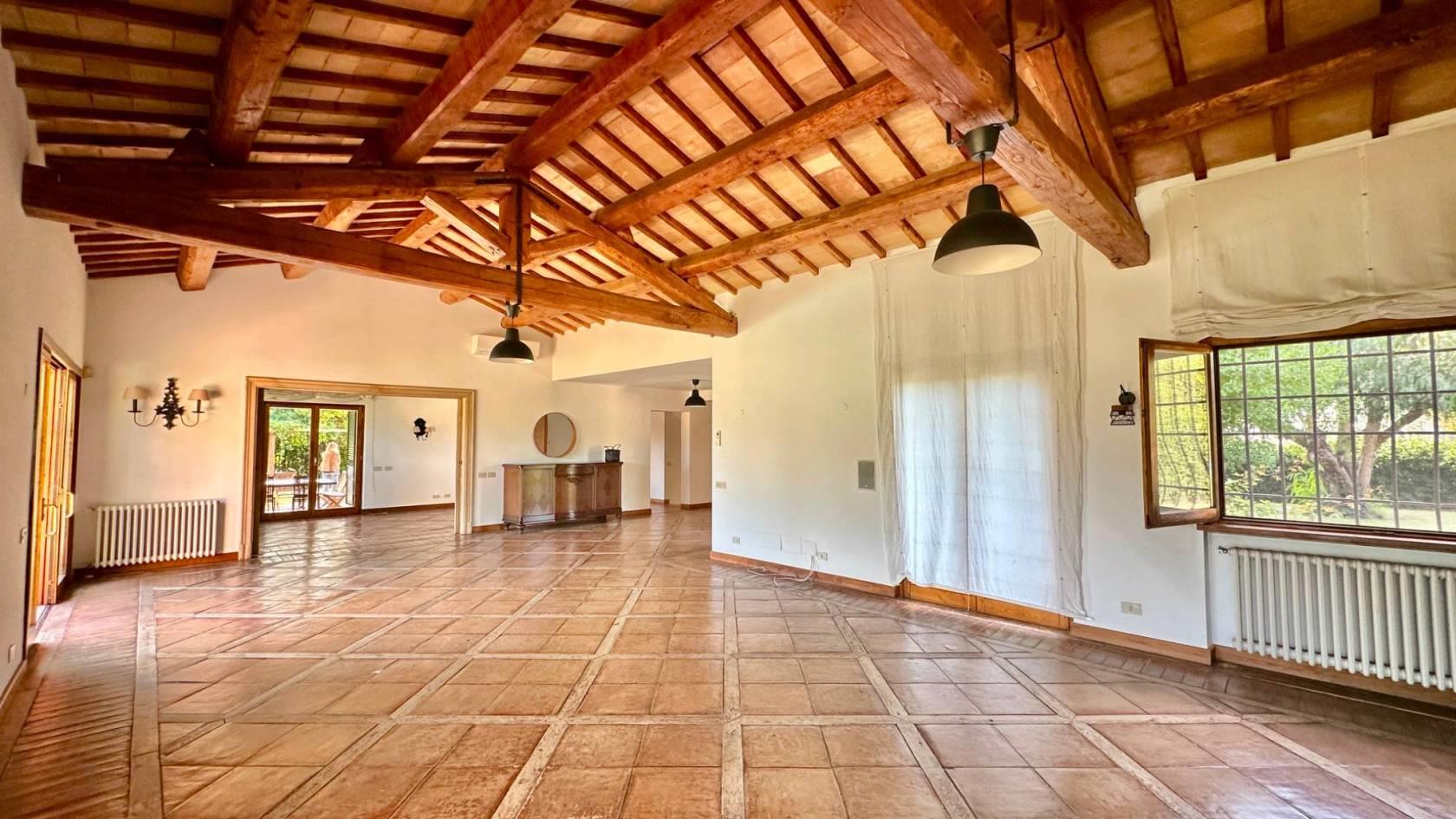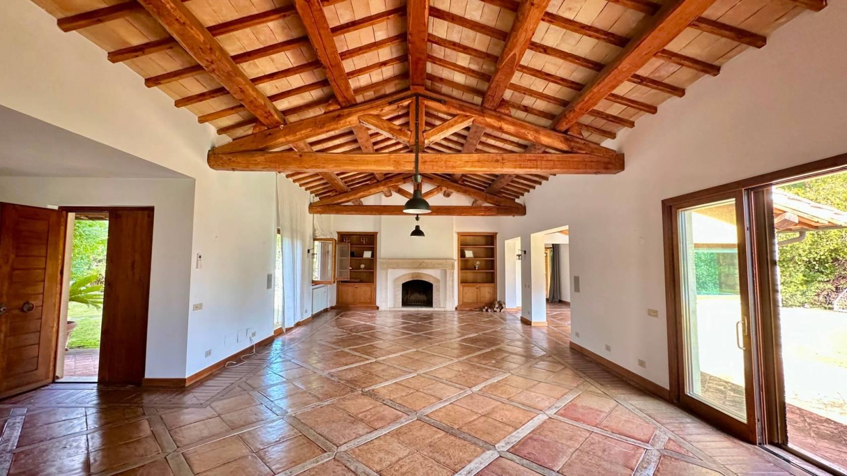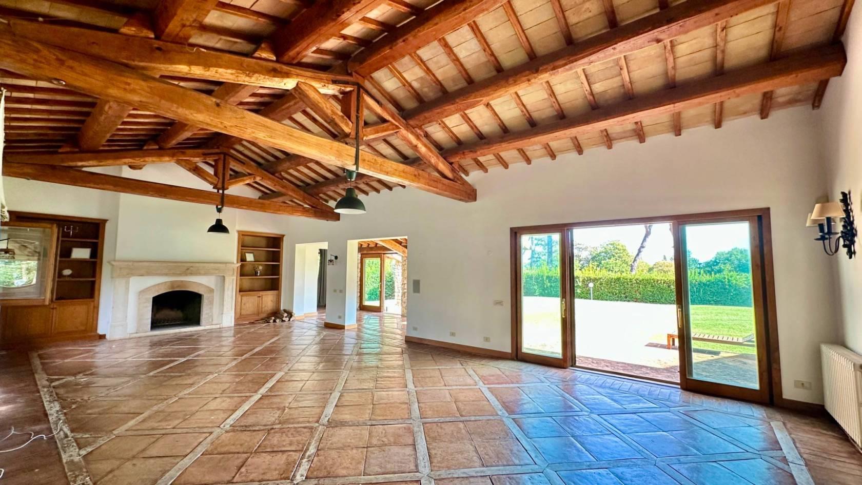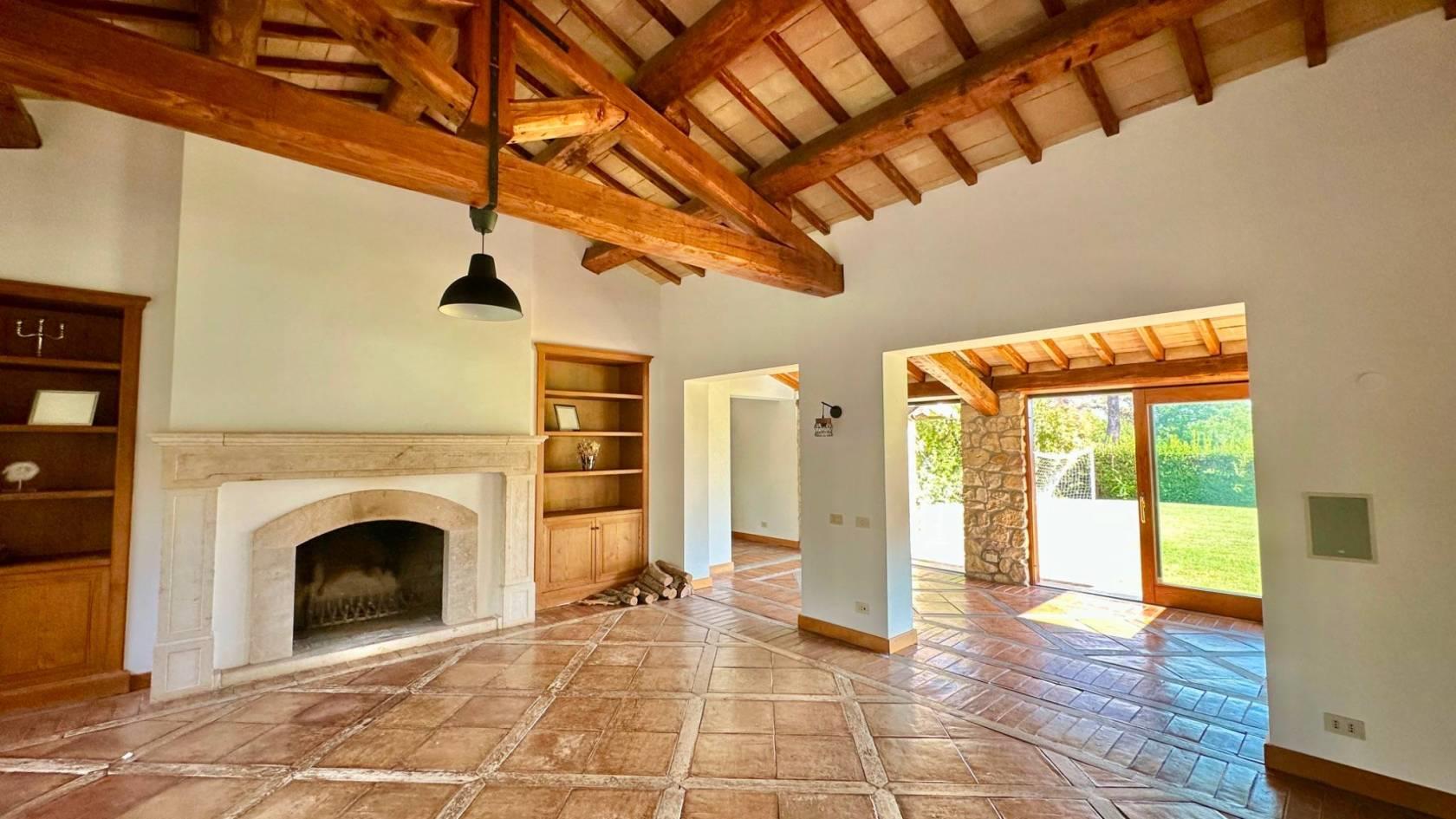 L'importante ingresso ci accompagna nella grande zona living con camino oltre ad altri spazi dedicati alla televisione ed alla lettura, le ampie vetrate fino a terra creano continuità con il verde del giardino e l'azzurro della piscina.