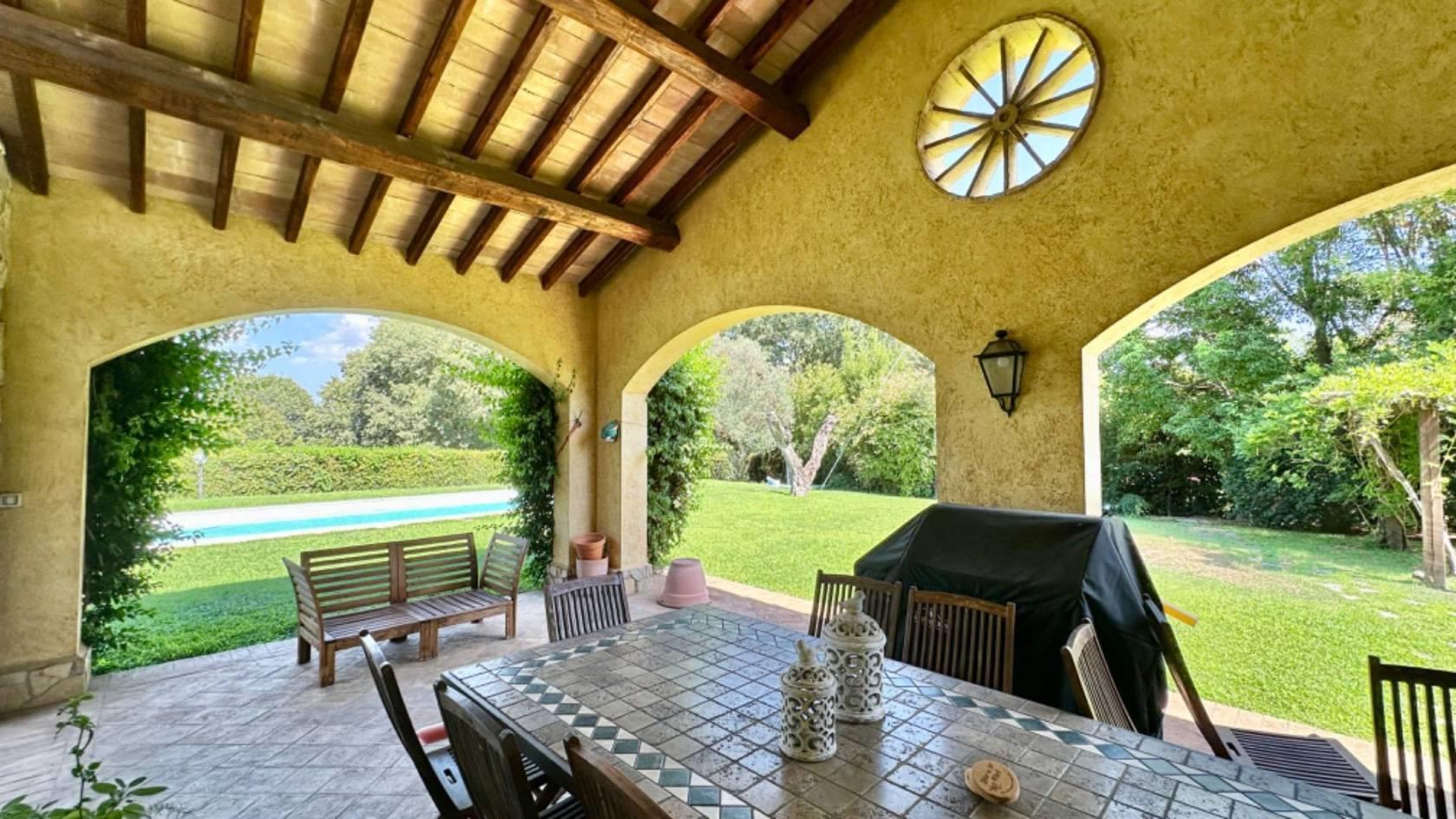 Il giardino è completamente pianeggiante ed è servito da due spazi coperti dedicati uno al relax adiacente alla piscina mentre l'altro vicino alla cucina servito da un comodo barbeque ed un forno a momenti conviviali.