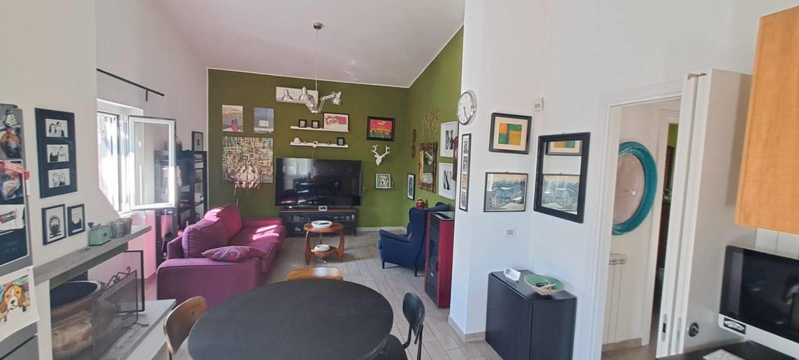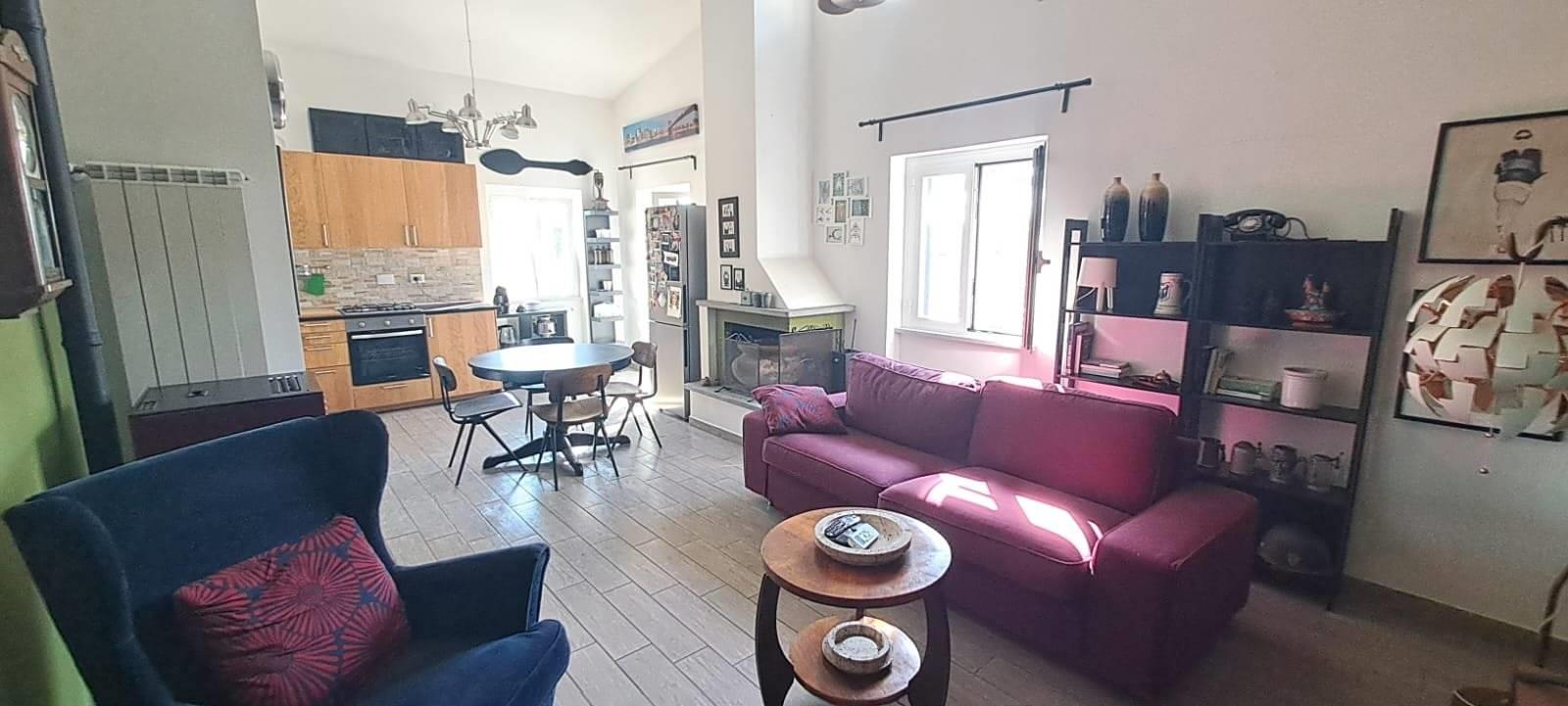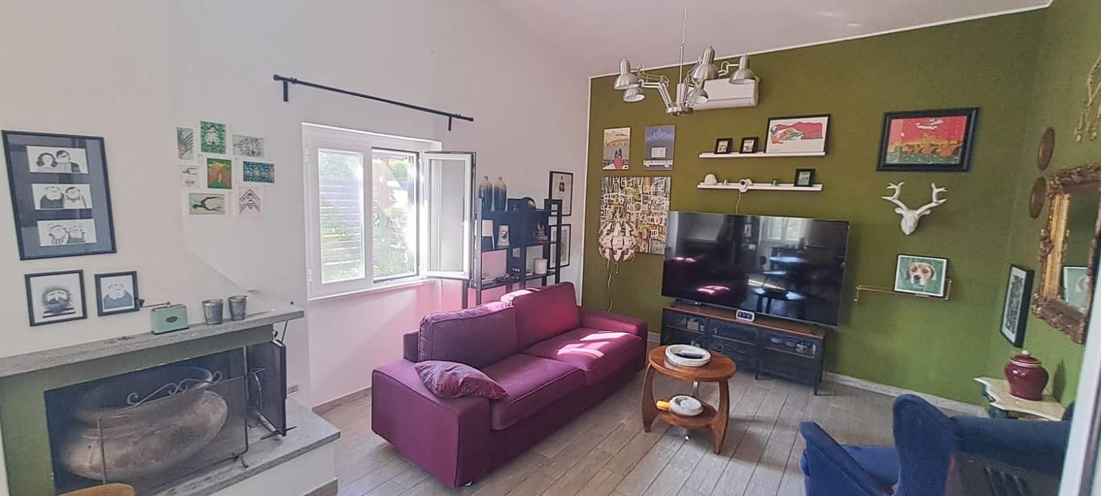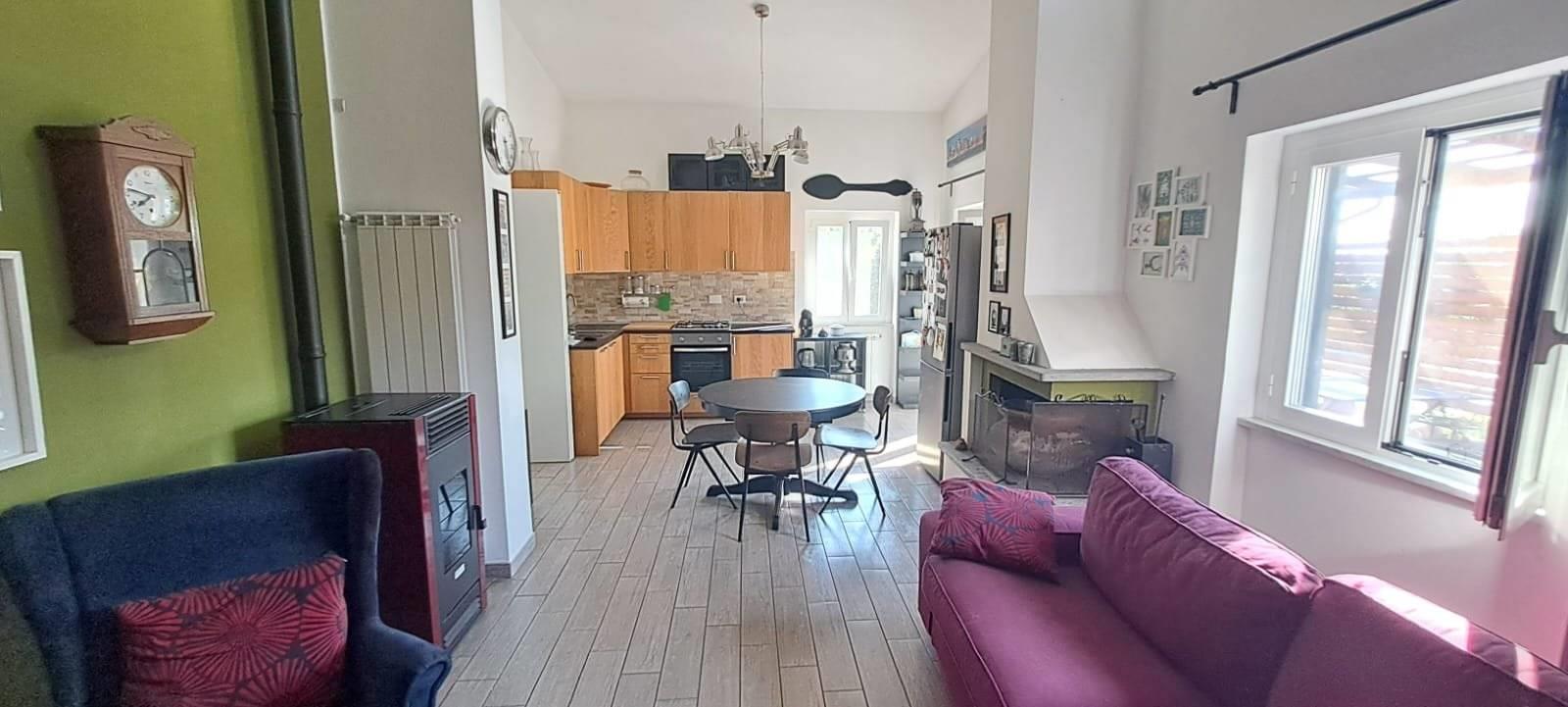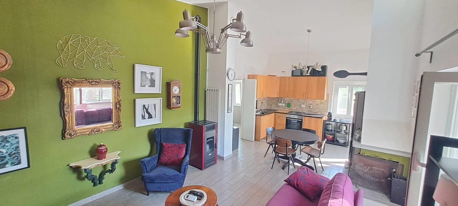 La soluzione internamente si compone da: ingresso, soggiorno, cucina a vista con camino e stufa a pellet, servizio con doccia finestrato, tramite disimpegno si accede alla zona notte dove si trova una camera matrimoniale con cabina armadio e servizio finestrato con doccia, una cameretta al momento adibita a salotto.