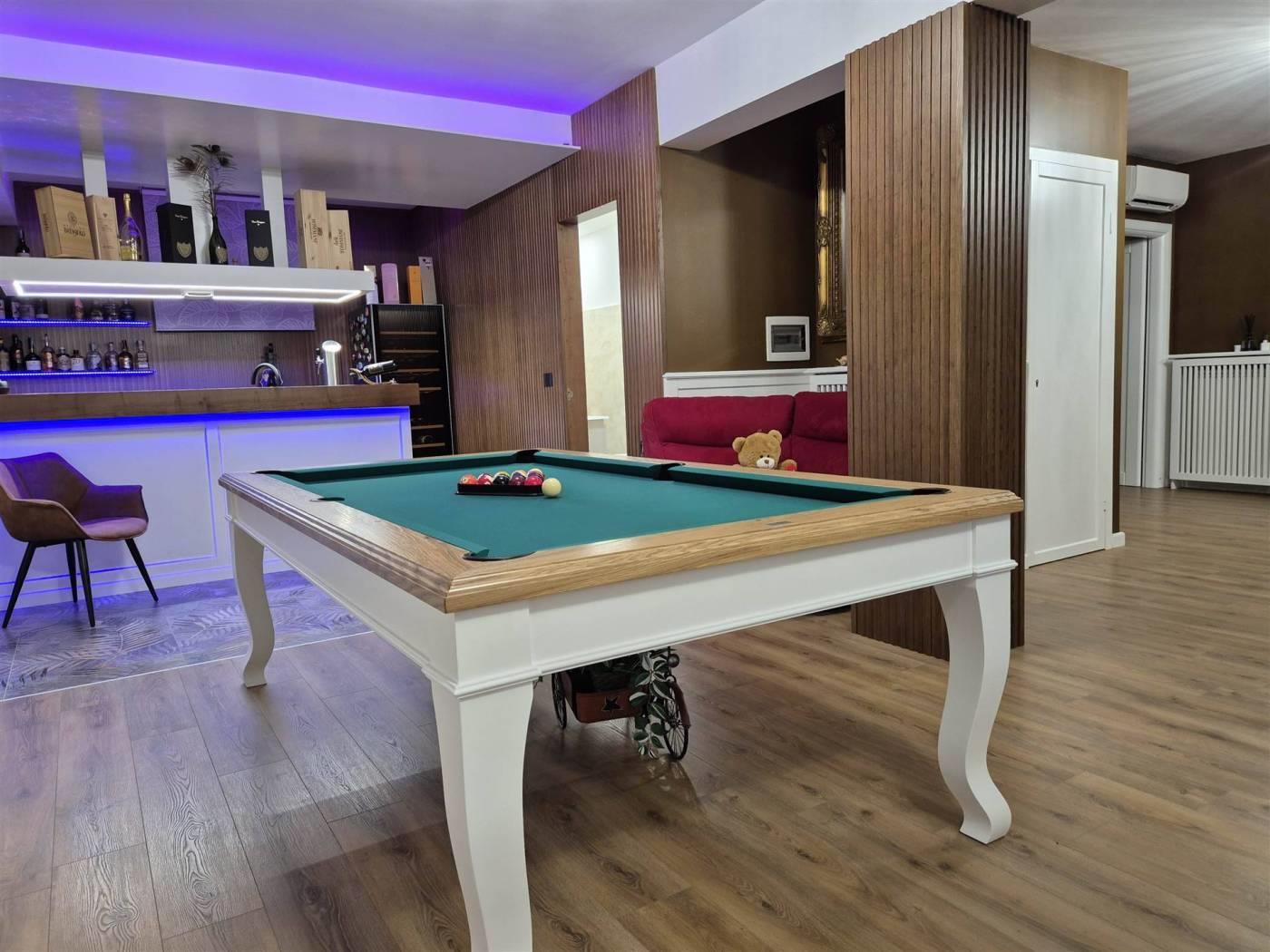 Recentemente integralmente ristrutturata e si presenta in ottime condizioni, grazie anche ai materiali di alta qualità utilizzati durante costruzione e ristrutturazione. Con una superficie totale di 230 metri quadrati, di cui 217 calpestabili, la villa è composta al piano rialzato da un patio che assolve la funzione di ingresso, un salone doppio con una bellissima cucina a vista, un bagno ed uno spazio esterno posteriore quasi totalmente verandato servito da tutti i comfort, dal barbecue all' idromassaggio, offrendo un'area ideale per trascorrere piacevoli momenti all'aperto; al primo piano troviamo 2 camere da letto mansardate spaziose, un bagno di buone dimensioni e un ampio terrazzo con accesso dalle 2 stanze; al piano della sala hobby troviamo un grande salone doppio con camino, sala tv, un ampio spazio dedicato al biliardo, un nuovissimo angolo bar, un bagno, ed una camera attualmente utilizzata come stireria, stanza armadi e ripostiglio.