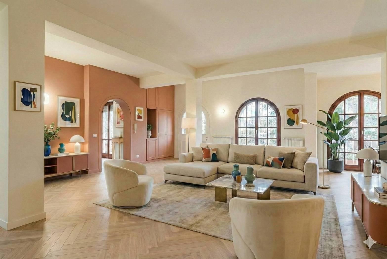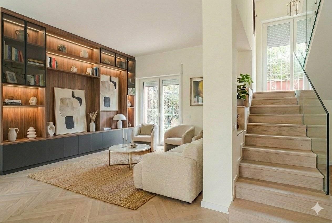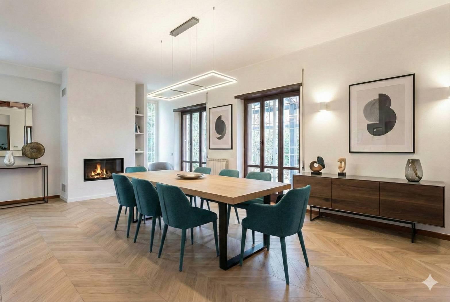 Circondata da un parco privato di circa 800 mq, la villa offre spazi di rappresentanza dal sapore classico. Al piano terra, caratterizzato da soffitti alti 2,90 mt che conferiscono grande signorilità, troviamo un doppio fulcro di convivialità: un ampio salone impreziosito da un camino, ideale per la zona living, un tinello separato dotato di un secondo camino, perfetto per cene intime e familiari ed un bagno.