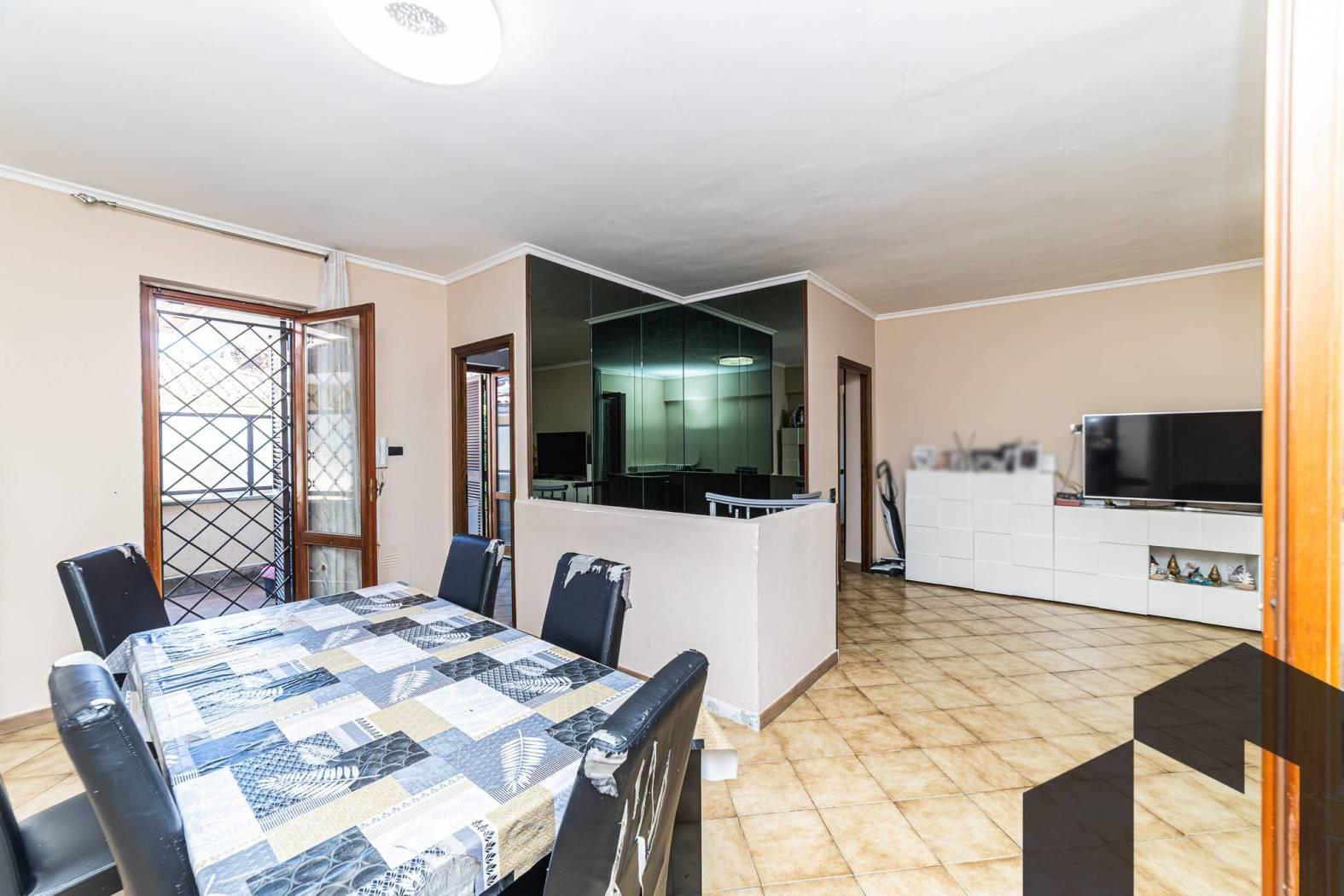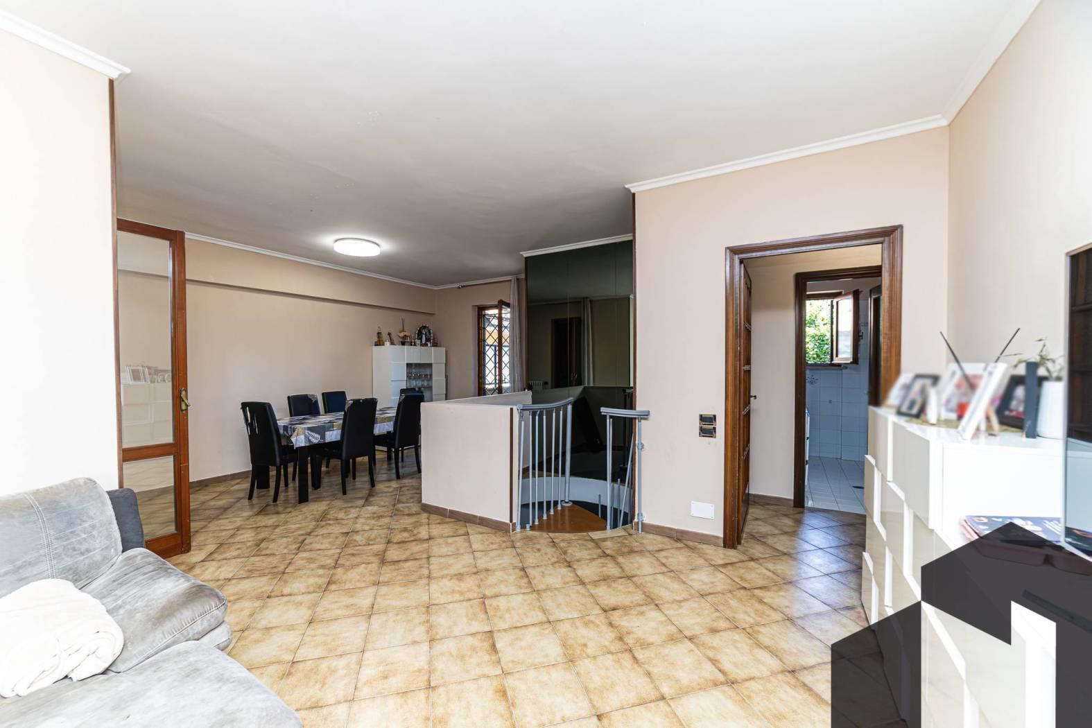 L’accesso all’immobile avviene attraverso uno spazioso terrazzo panoramico, vero cuore della casa: uno spazio privilegiato dove lo sguardo può perdersi tra i tetti di Roma.