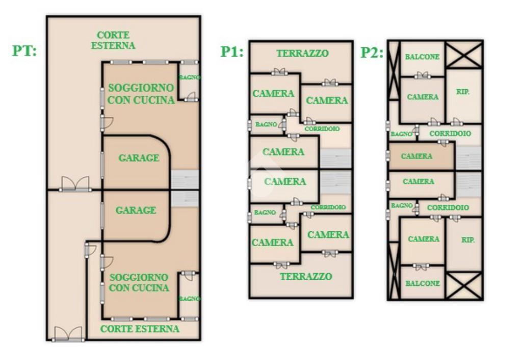 • Piano terra: soggiorno con cucina a vista, bagno e cortile esterno.