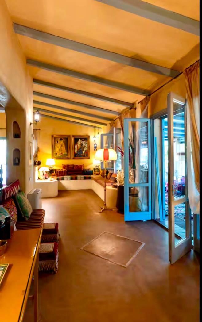 Gli interni con travi a vista e pavimenti in resina e cotto offrono un ambiente caldo e accogliente, dove ogni dettaglio mostra cura e stile.
